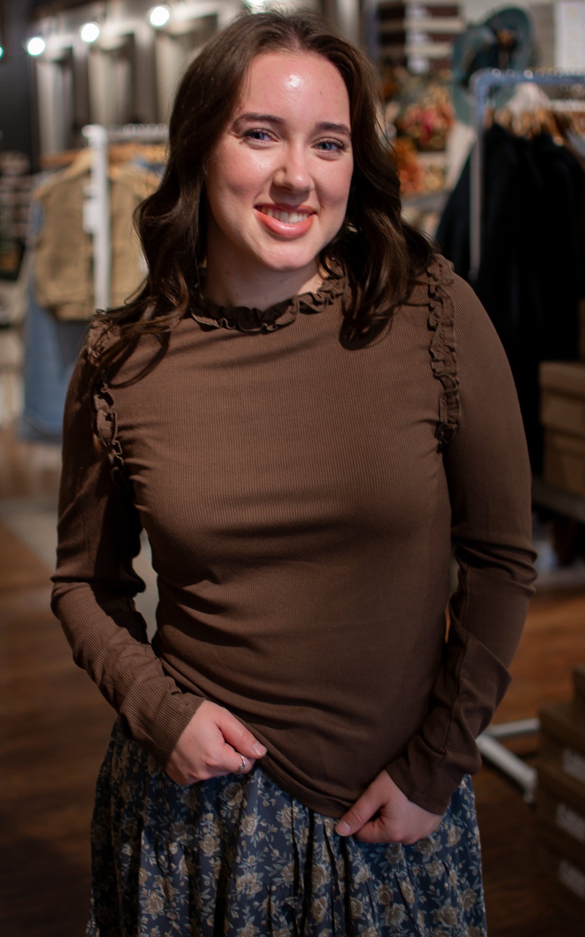 Add a dash of timeless charm with our Flare Ruffle Long Sleeve. In creamy mauve and warm brown tones, this classic piece features playful ruffles along the sleeves and neckline that bring movement and fun to your look. Perfect for dressing up or down, it’s a sweet way to brighten any day with a touch of vintage-inspired flair.