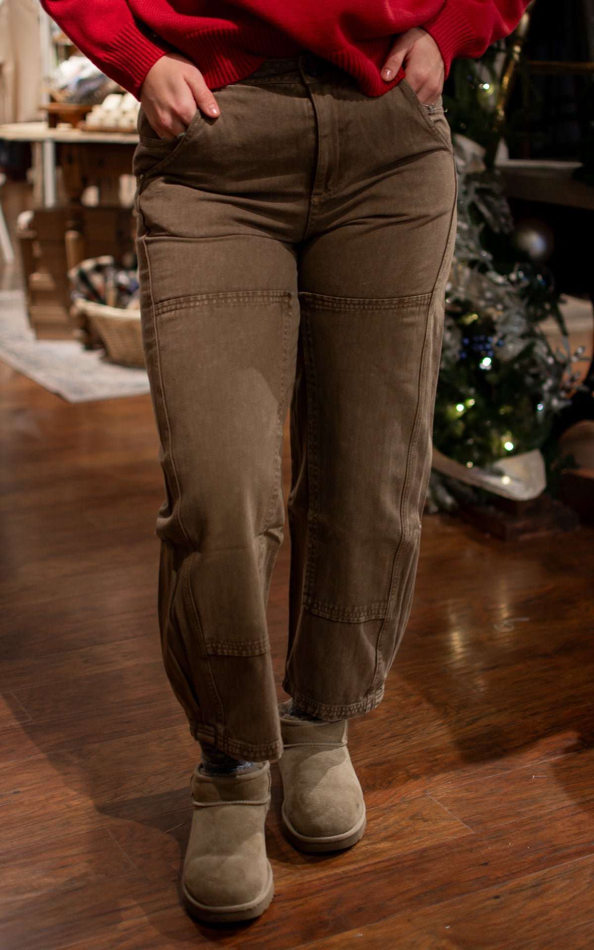 The Barrel Racing Mid Rise Pants feature a fun brown barrel jean style with double pockets for extra convenience. Designed for easy movement and playful days, these pants combine practicality with a cute, casual vibe.