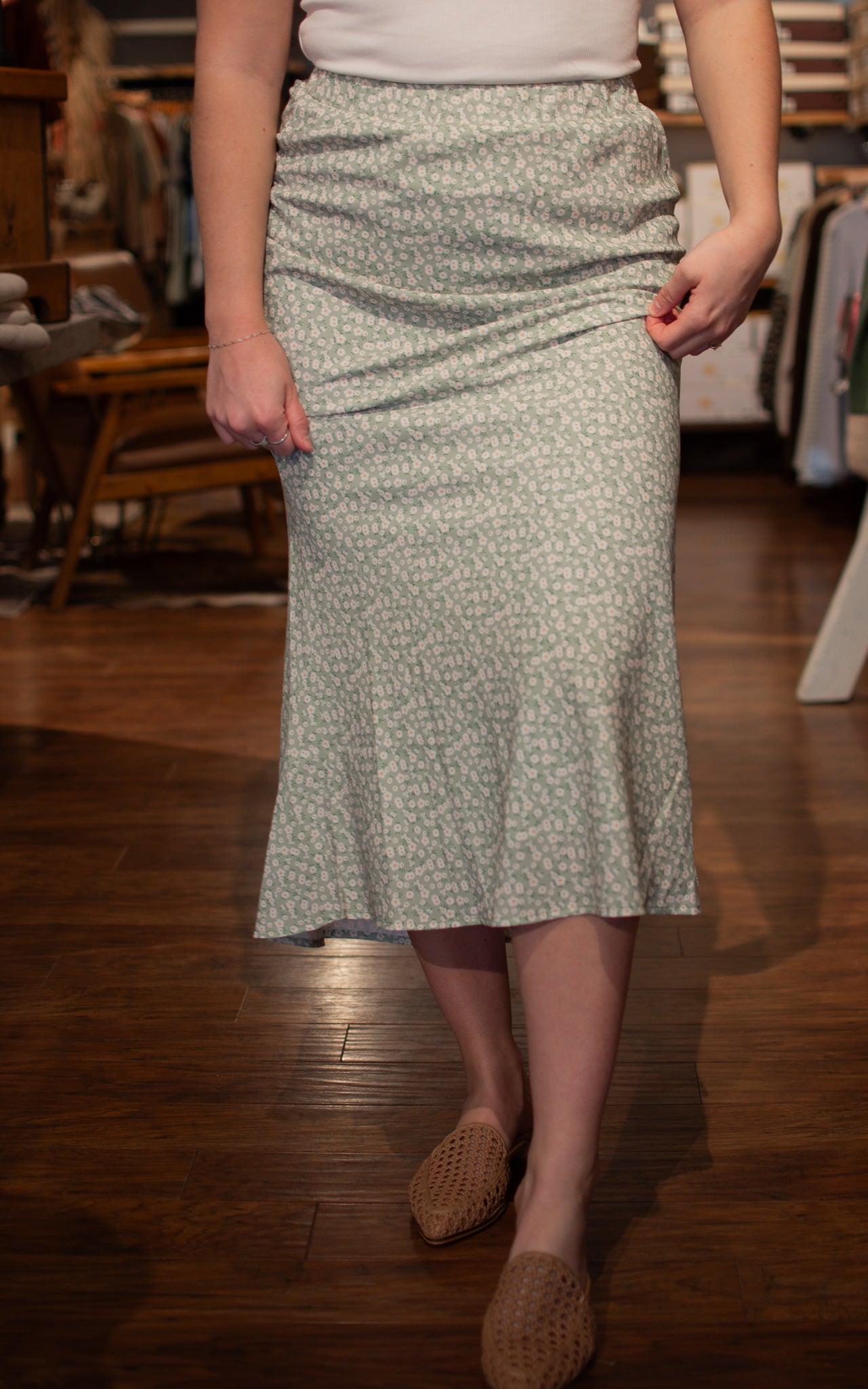 Church Morning Midi Skirt Graceful and timeless, this green midi skirt blooms with delicate white flowers that bring instant charm to your wardrobe. The flowing length is perfect for dressing up or down, making it your go-to for everything from casual outings to special occasions. Elegant, comfortable, and endlessly wearable.