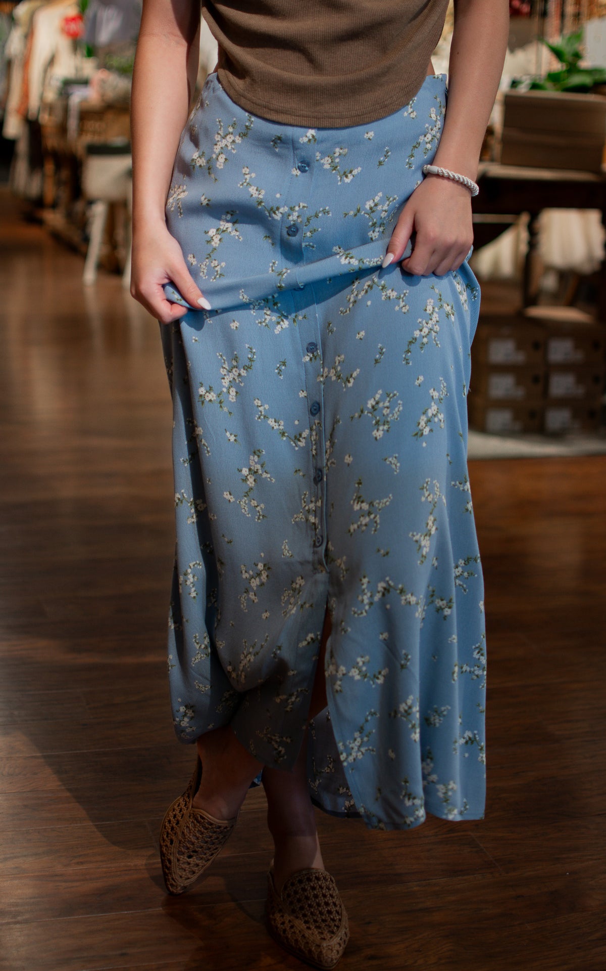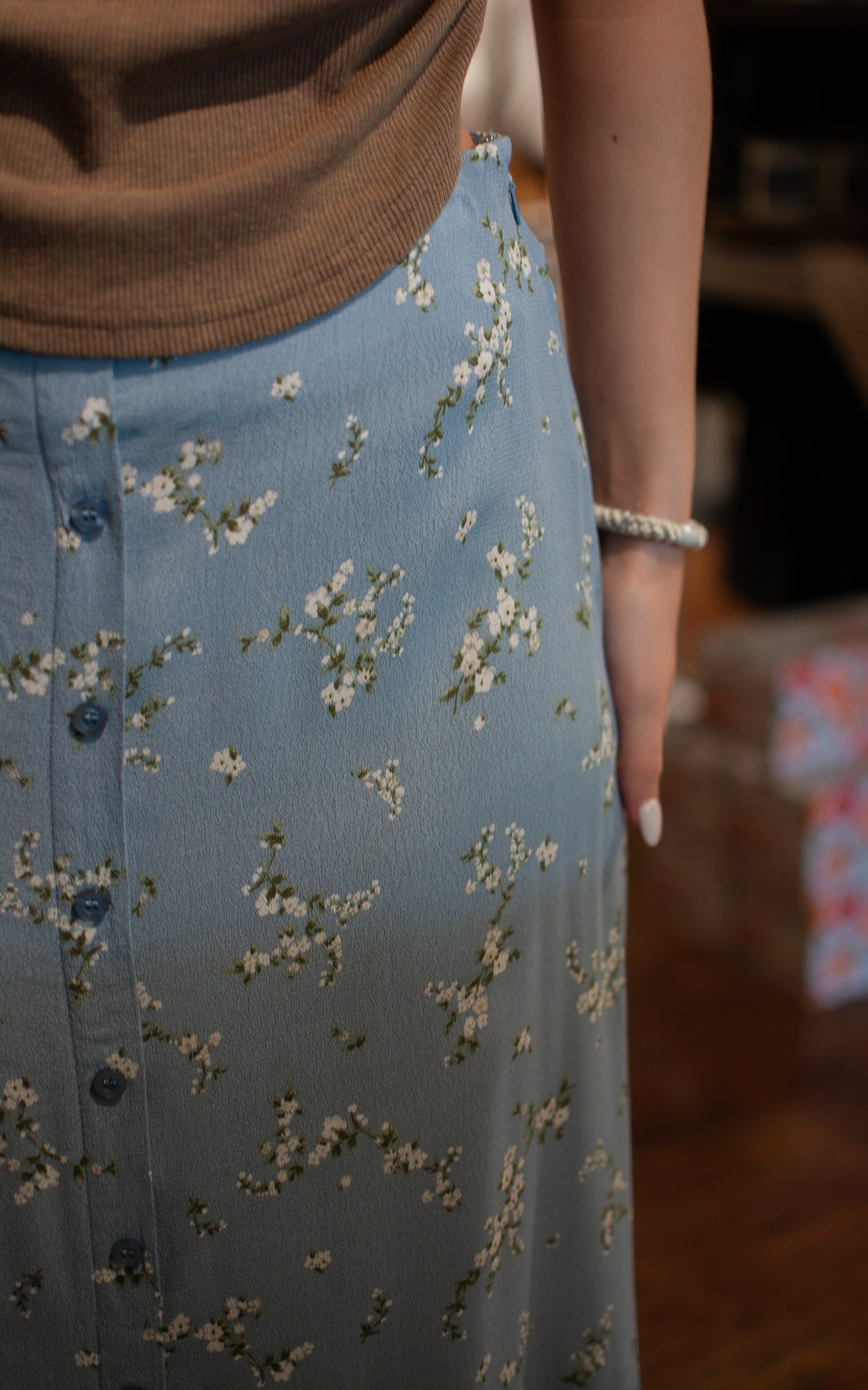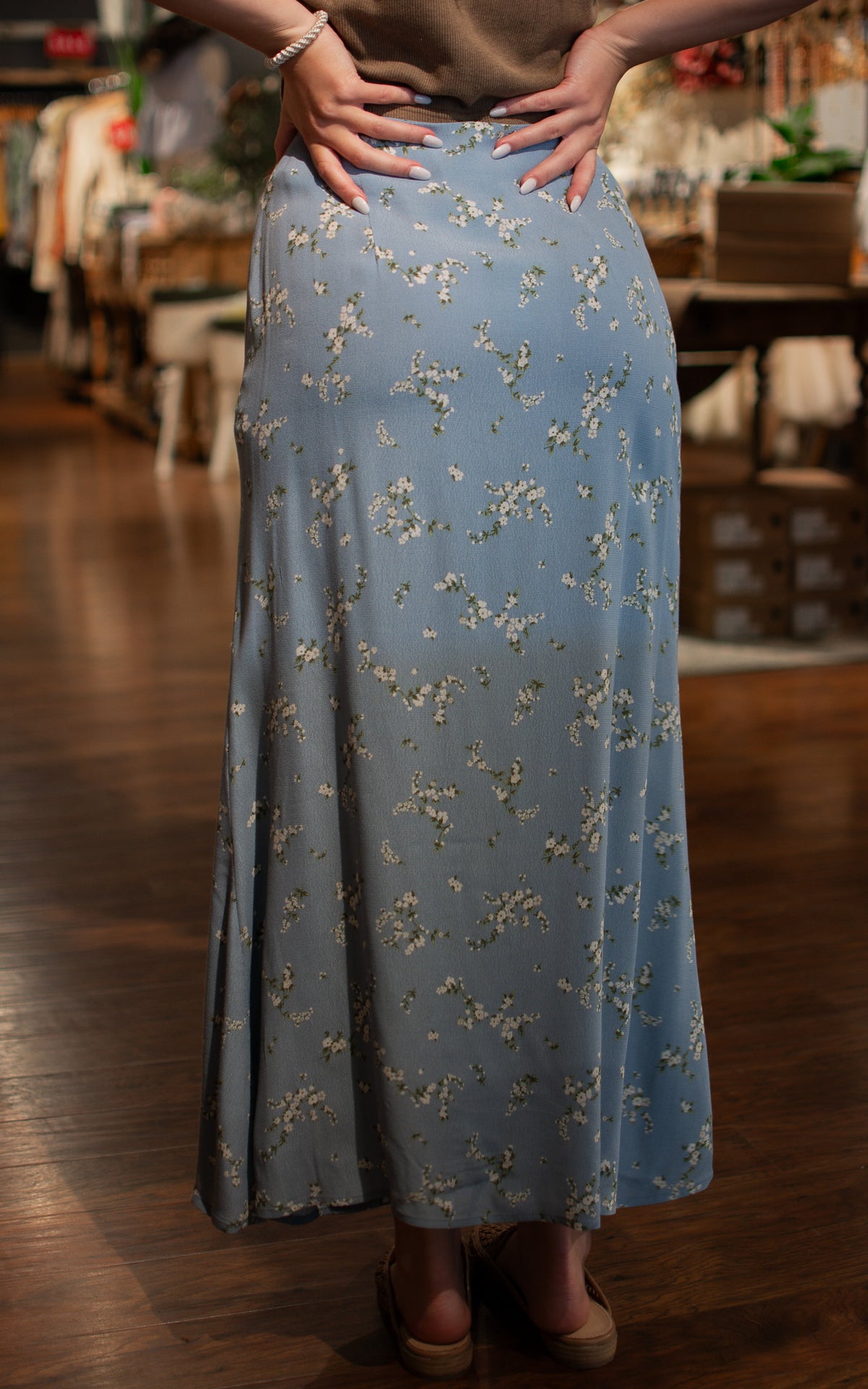 Get ready to hit the streets in style with our Downtown Blue Midi Skirt! Perfect for a spring day out, this skirt is both trendy and comfortable. Feel free to throw on some sneakers or dress it up with heels - the possibilities are endless!