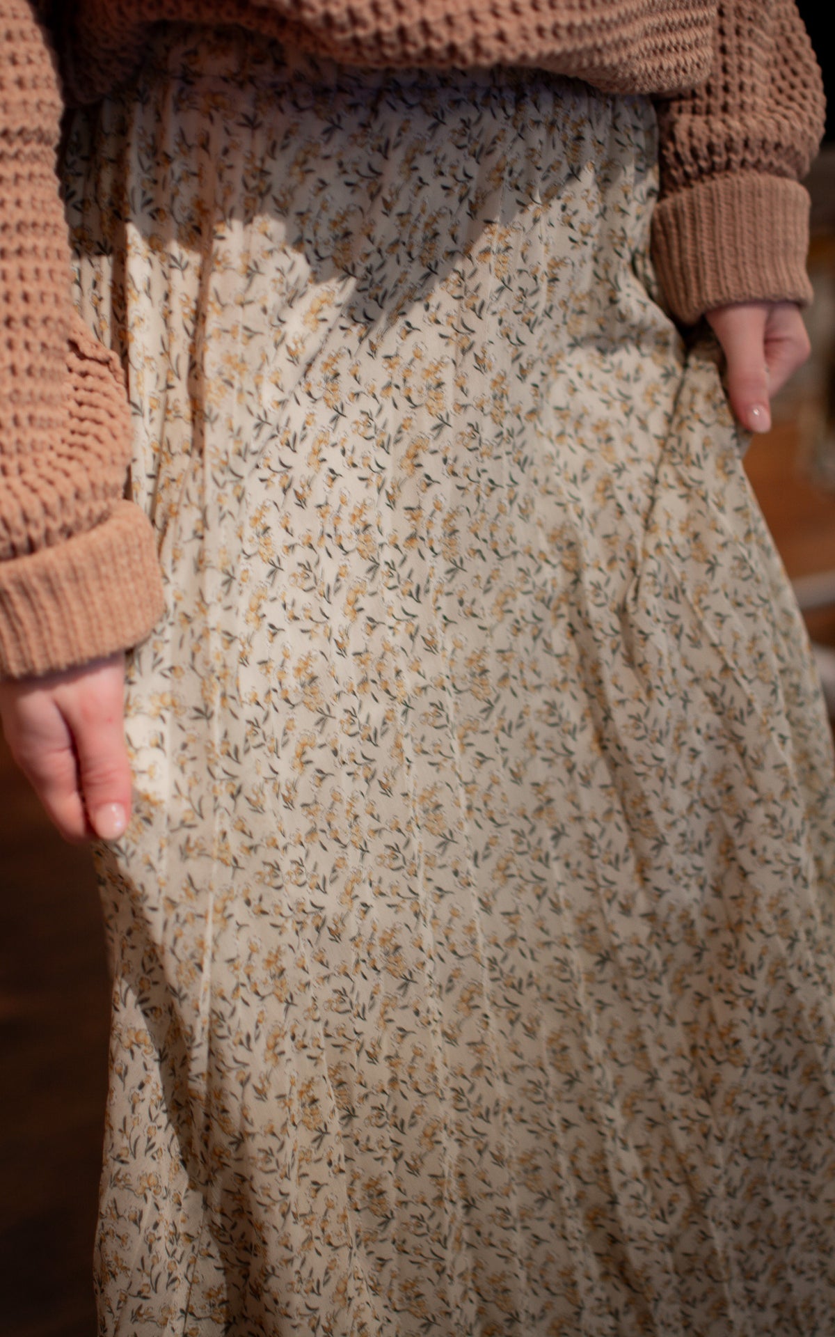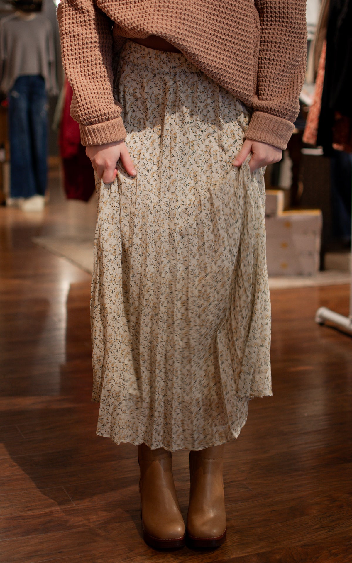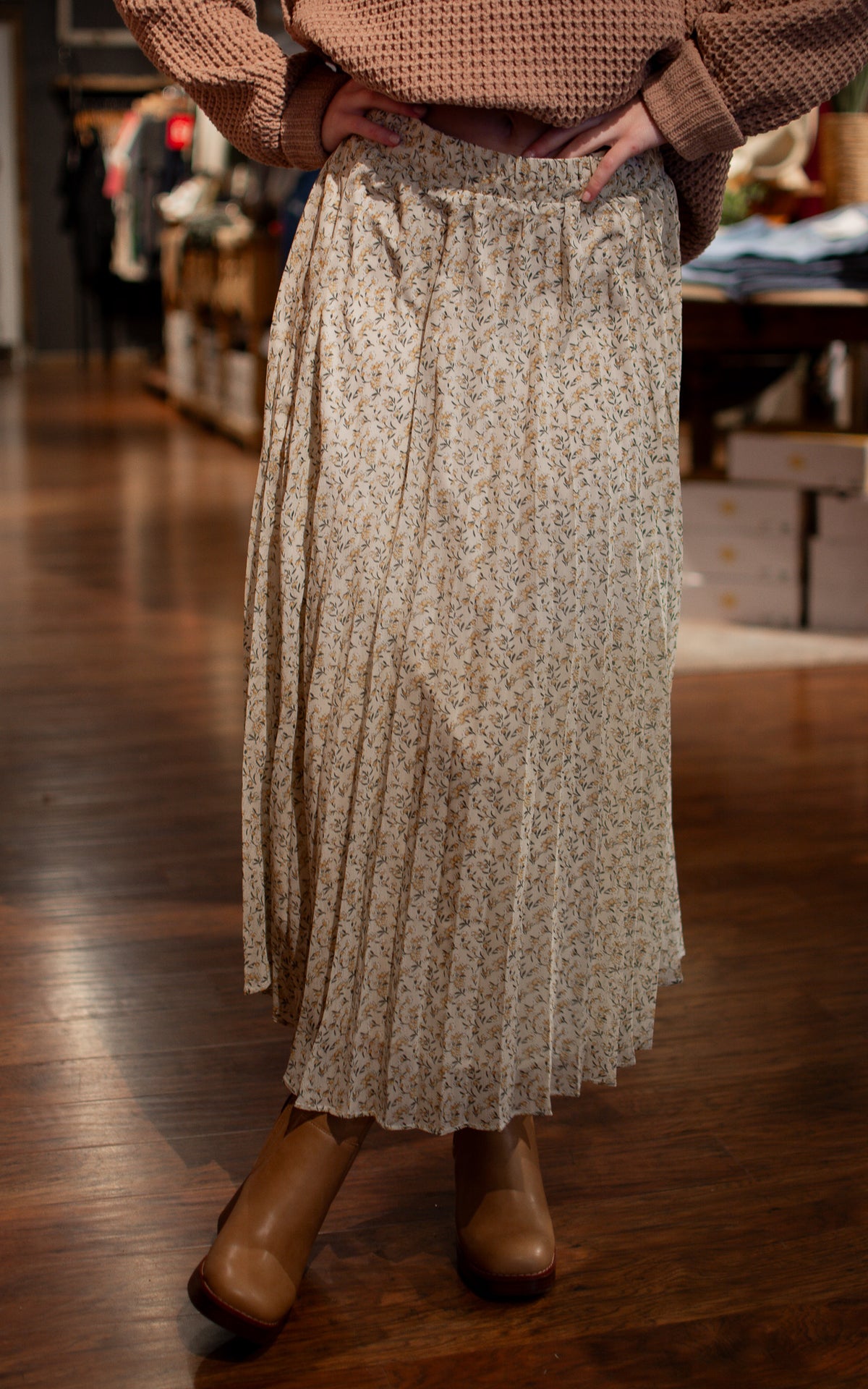 Get ready to "spring ahead" with this beautiful pleated midi skirt. Its small country floral pattern in mustard and olive tones is sure to make a statement. Stay comfortable and stylish with its fully lined design. Perfect for any occasion, from a picnic to a night out!