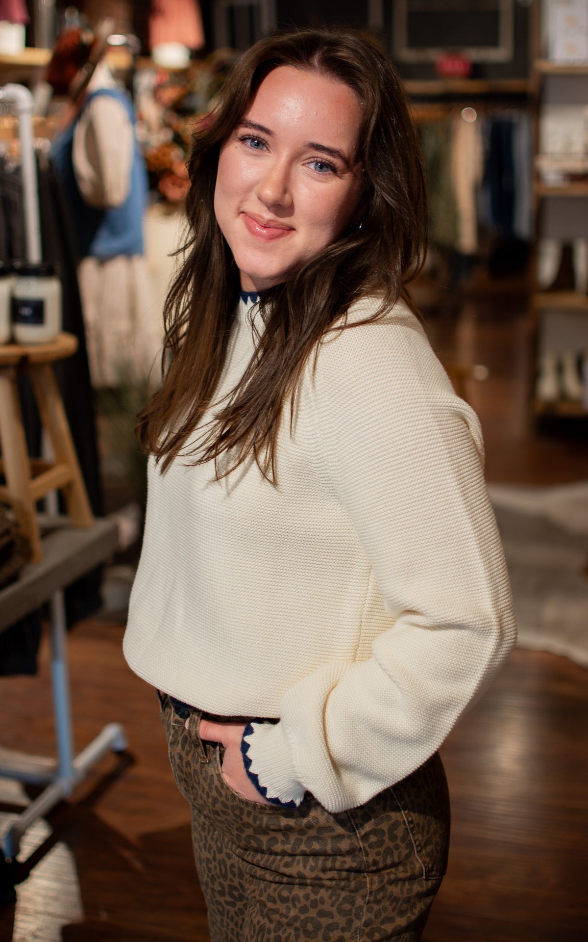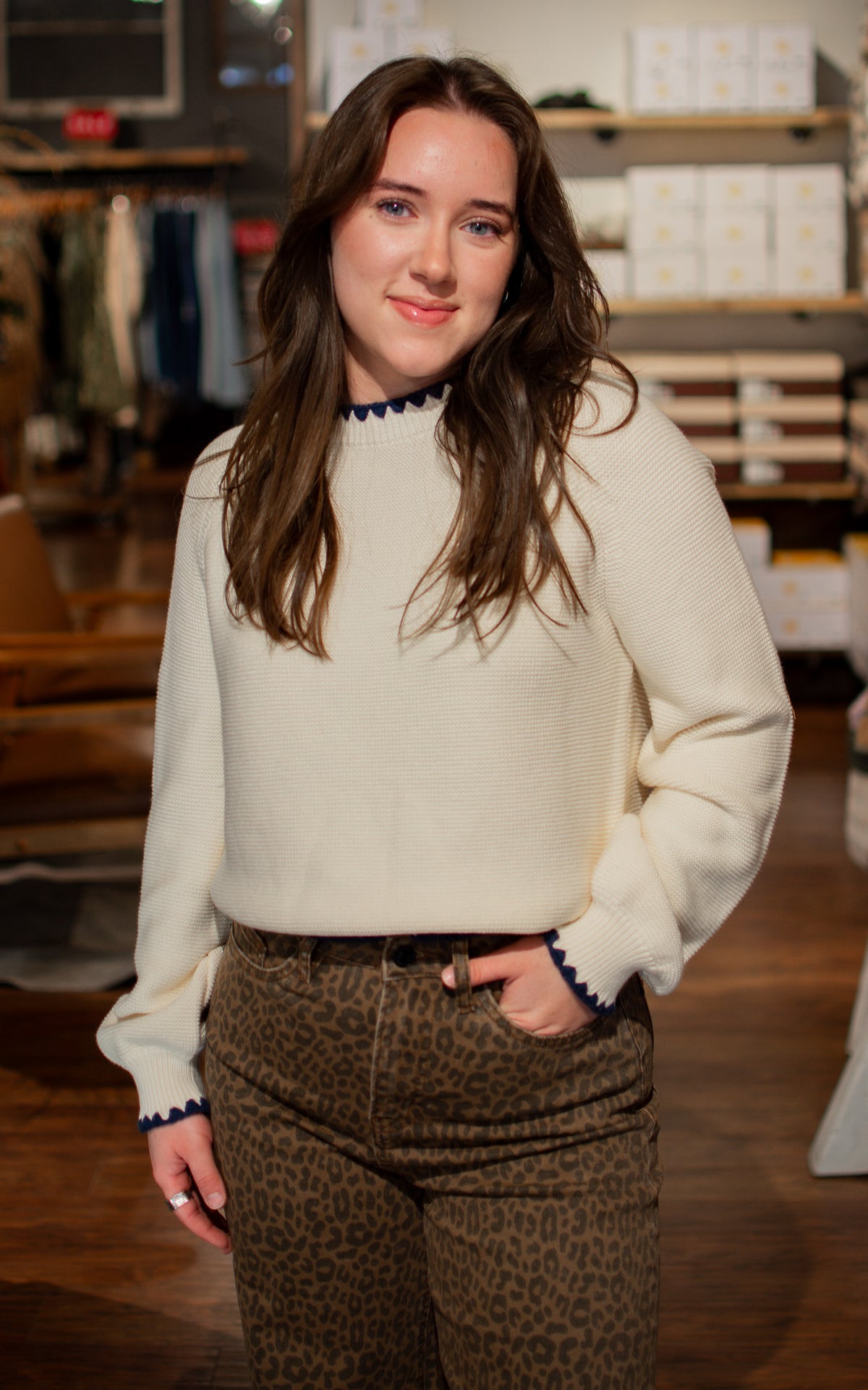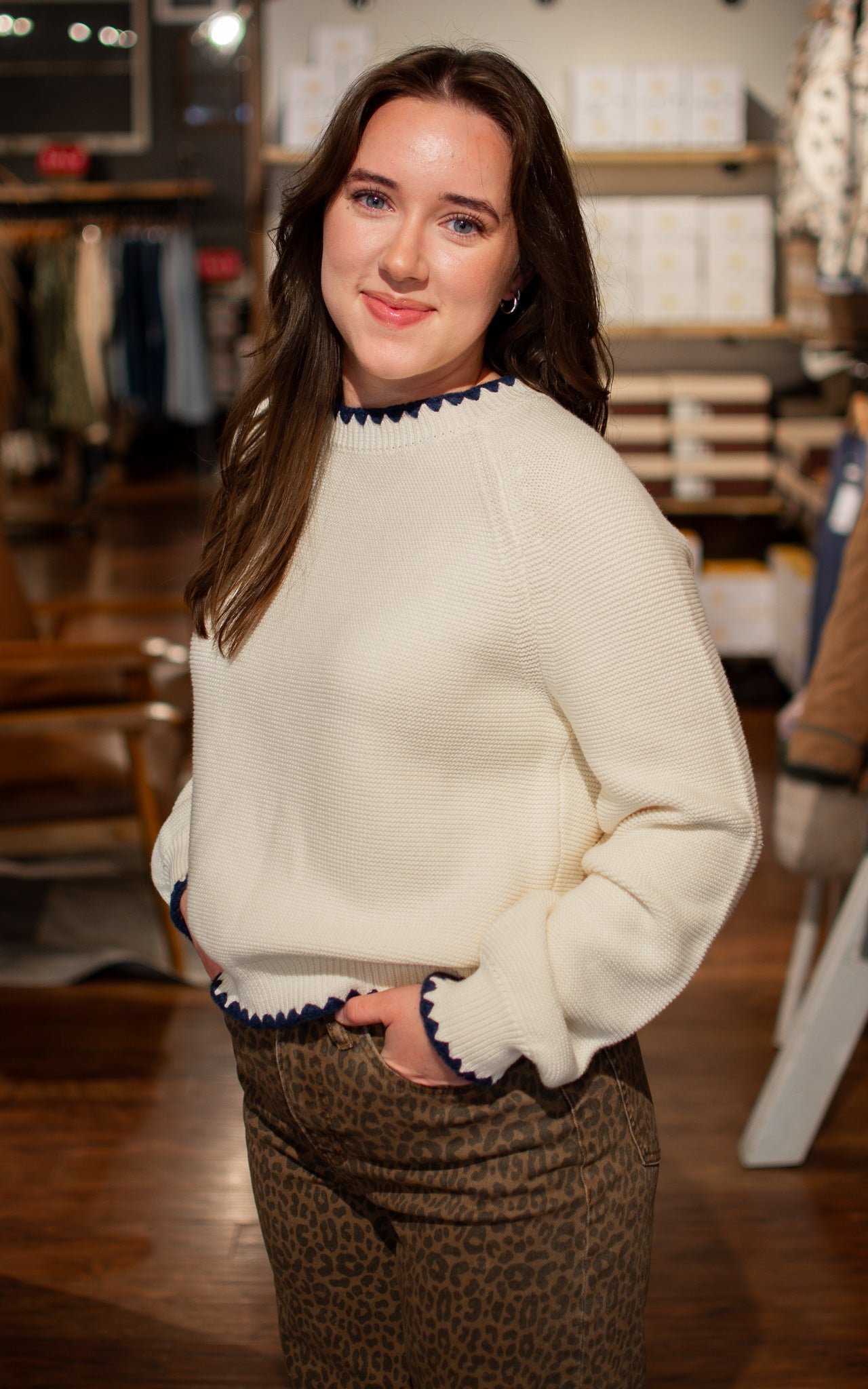 The Tillie Navy Sweater is your perfect go-to for both business meetings and cozy weekends. Its crisp white color is playfully accented with navy scallops at the neckline, hem, and cuffs, adding a charming touch to your outfit. Dress it up or down and enjoy a stylish, comfy look anytime!