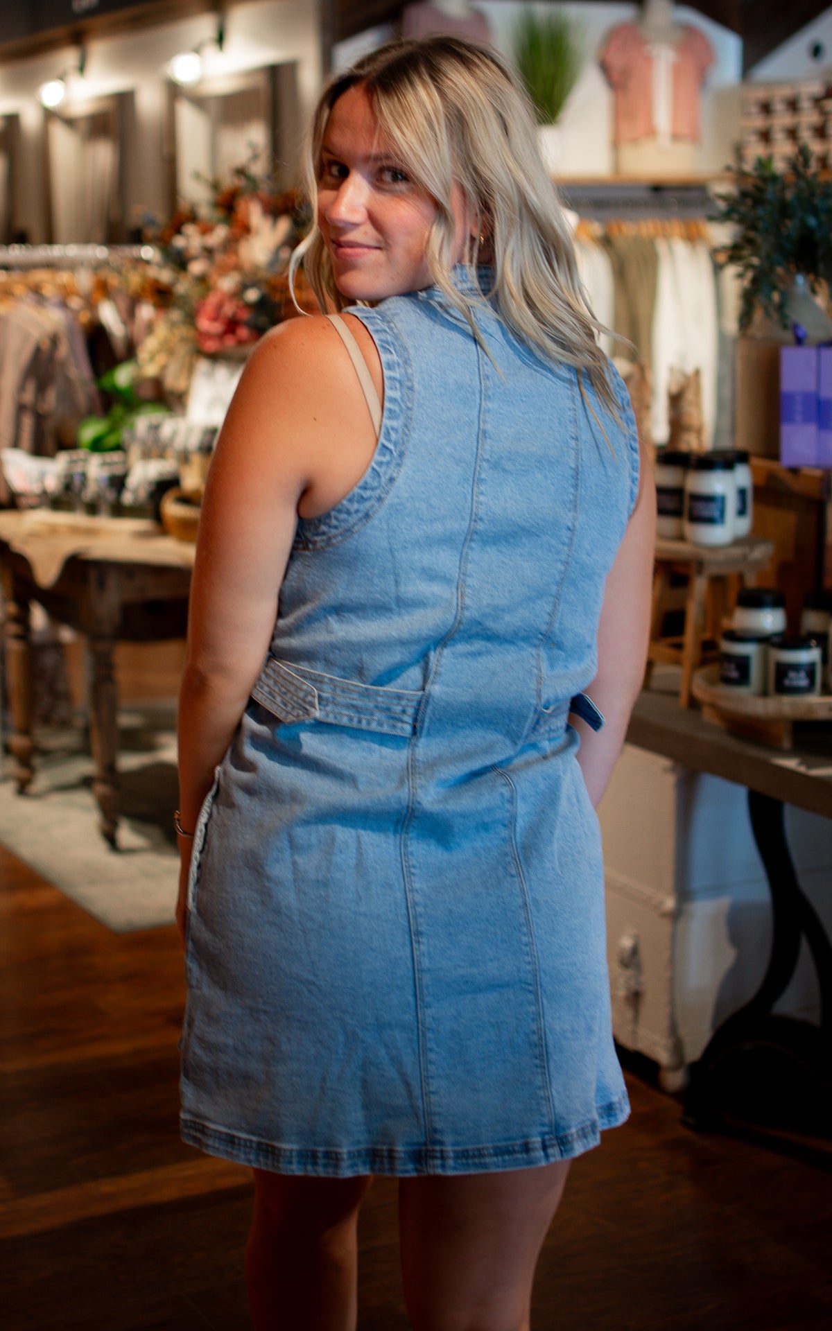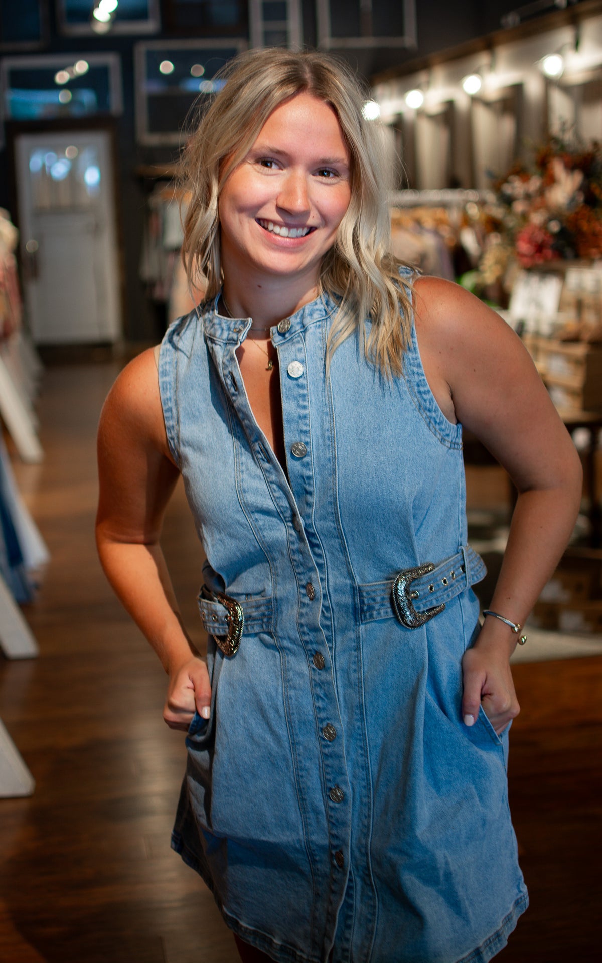 The Buckle Bunny Denim Dress blends rodeo flair with casual charm in light wash denim, featuring a fun buckle detail that adds a playful edge. Perfect for channeling your inner cowgirl with a fresh, stylish twist.