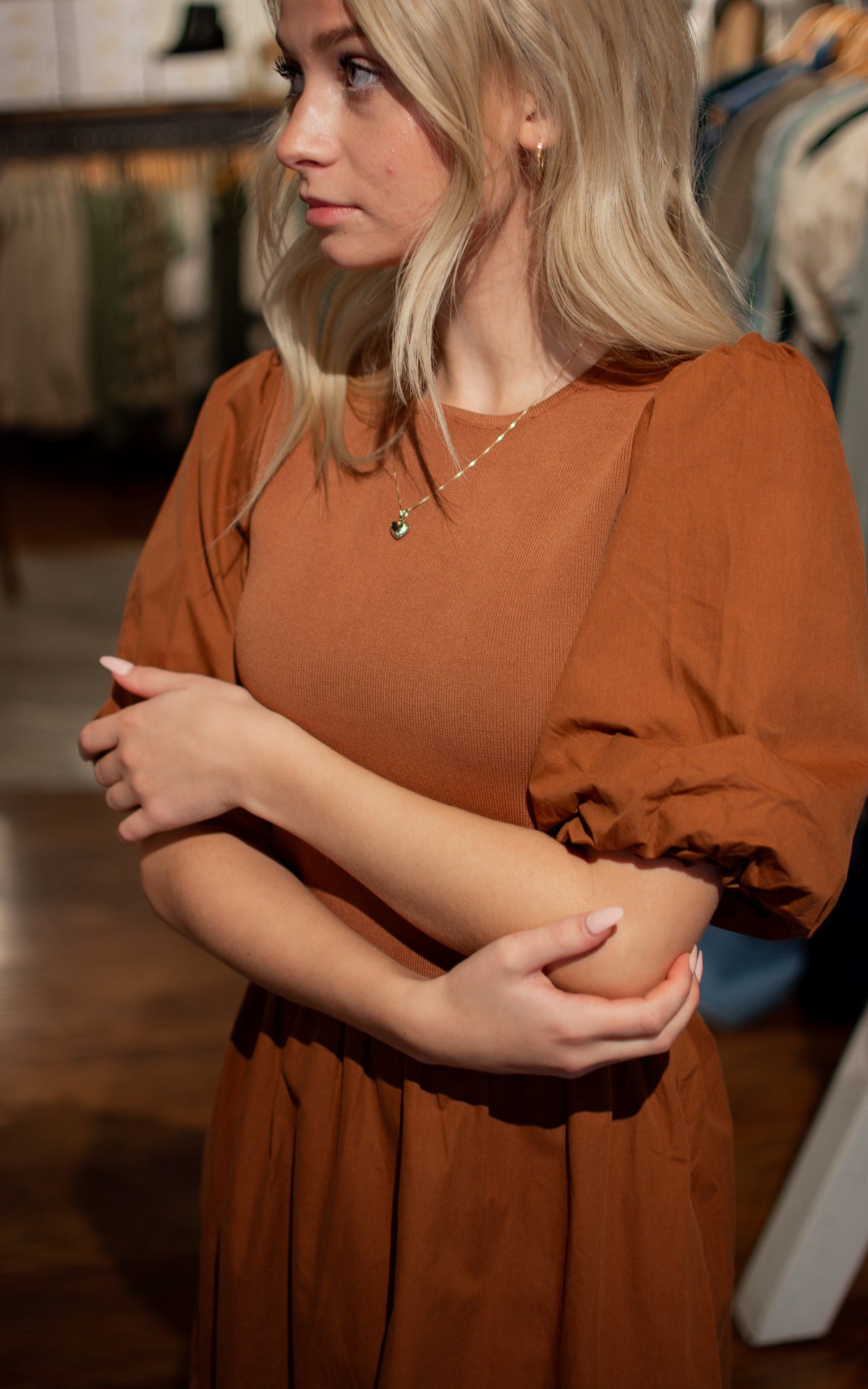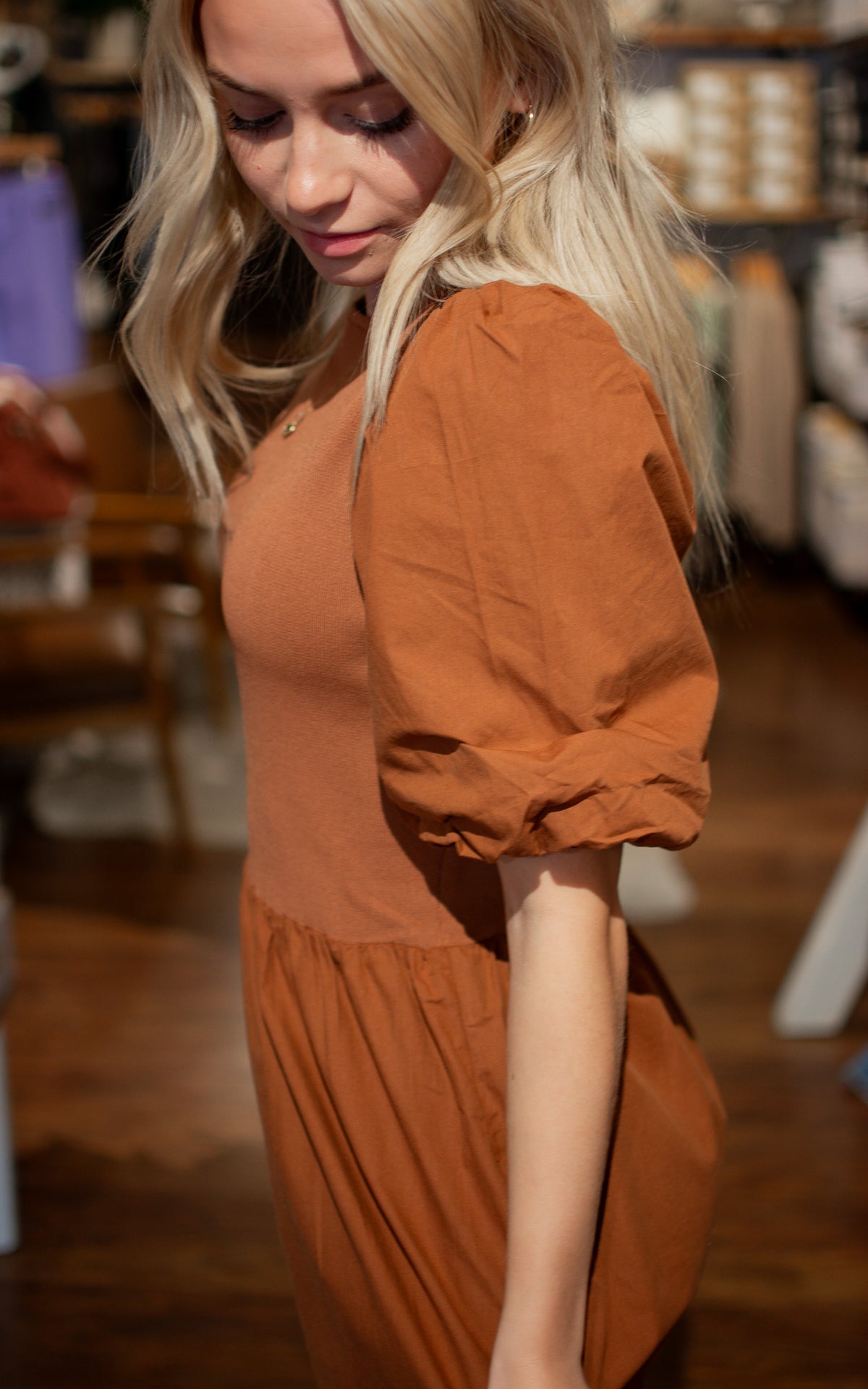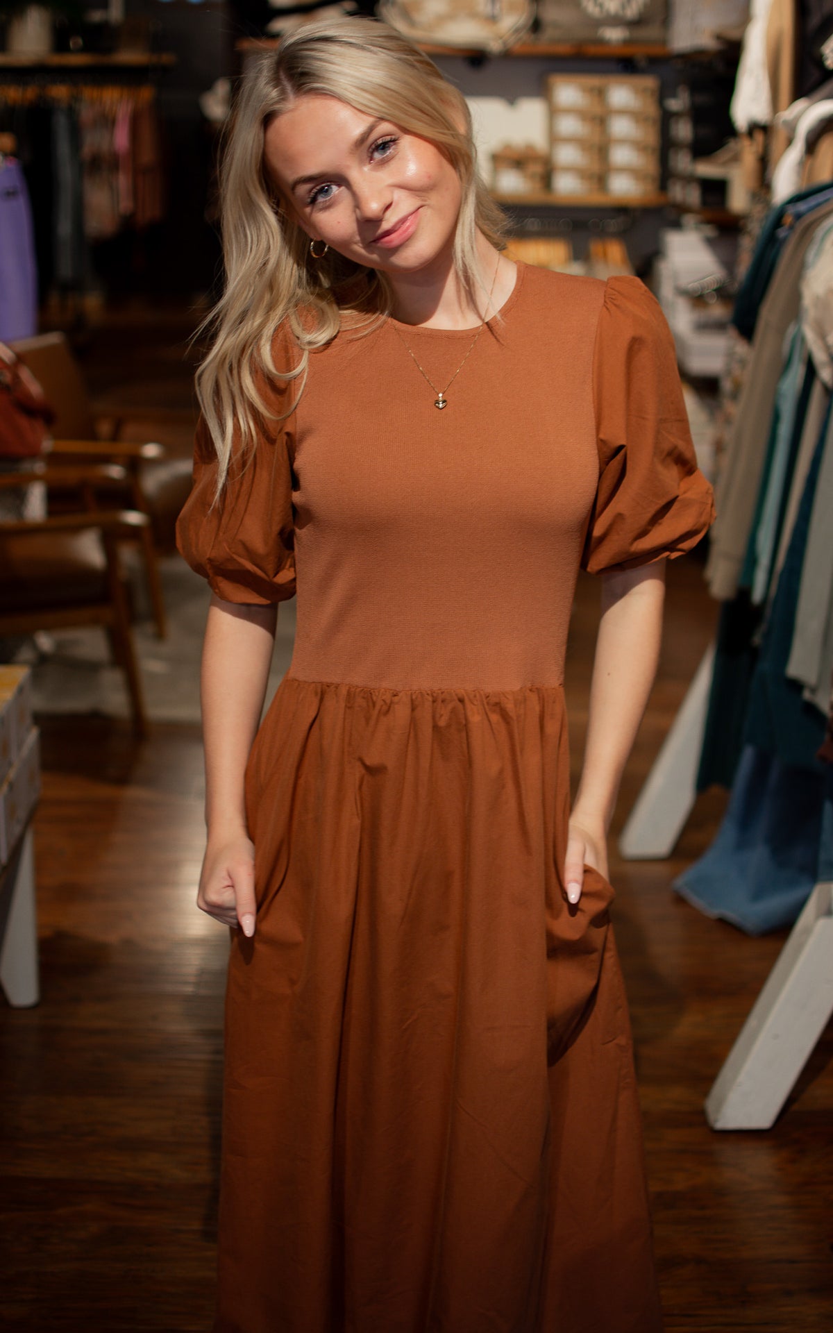 Get ready to turn heads with the Hallows Eve Midi Dress! Featuring a thick elastic bodice for structure and stunning puff sleeves for a touch of whimsy, this dress is perfect for family pictures or dressing up for the Thanksgiving table. Don't miss out on this mix of structure and style!