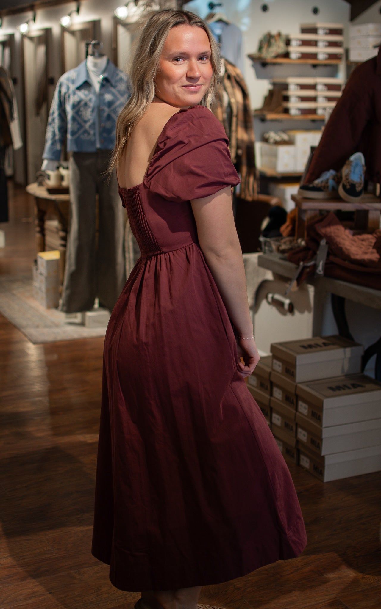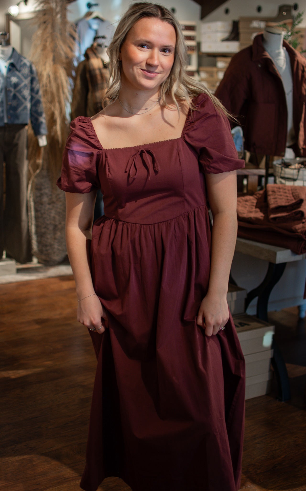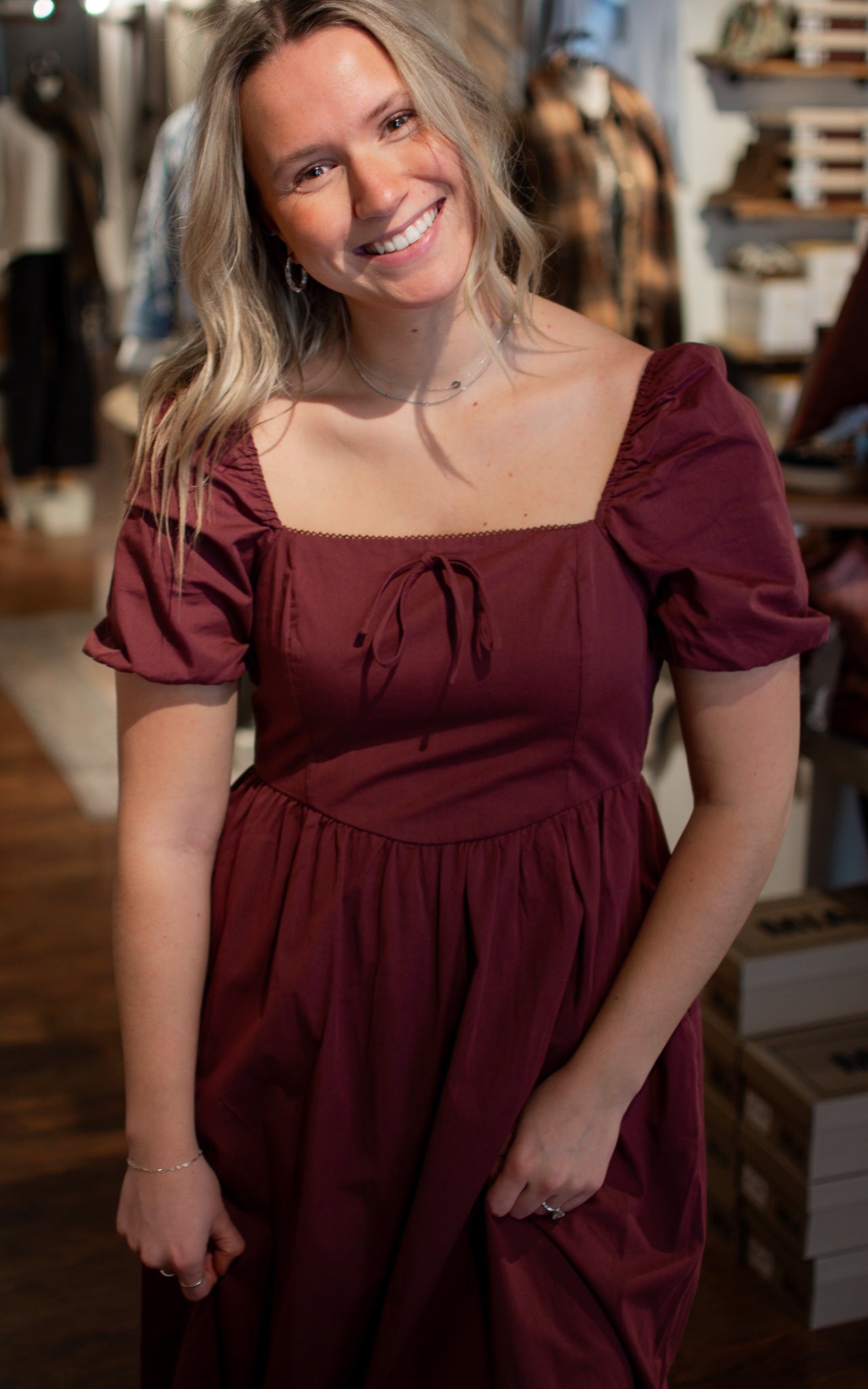 Merlot Bottle Midi Dress Rich, romantic, and ready to impress—this burgundy midi dress features dramatic puff sleeves that add instant elegance and charm. The sophisticated color and flattering length make it perfect for date nights, special occasions, or whenever you want to feel absolutely fabulous. Timeless style with a modern twist.