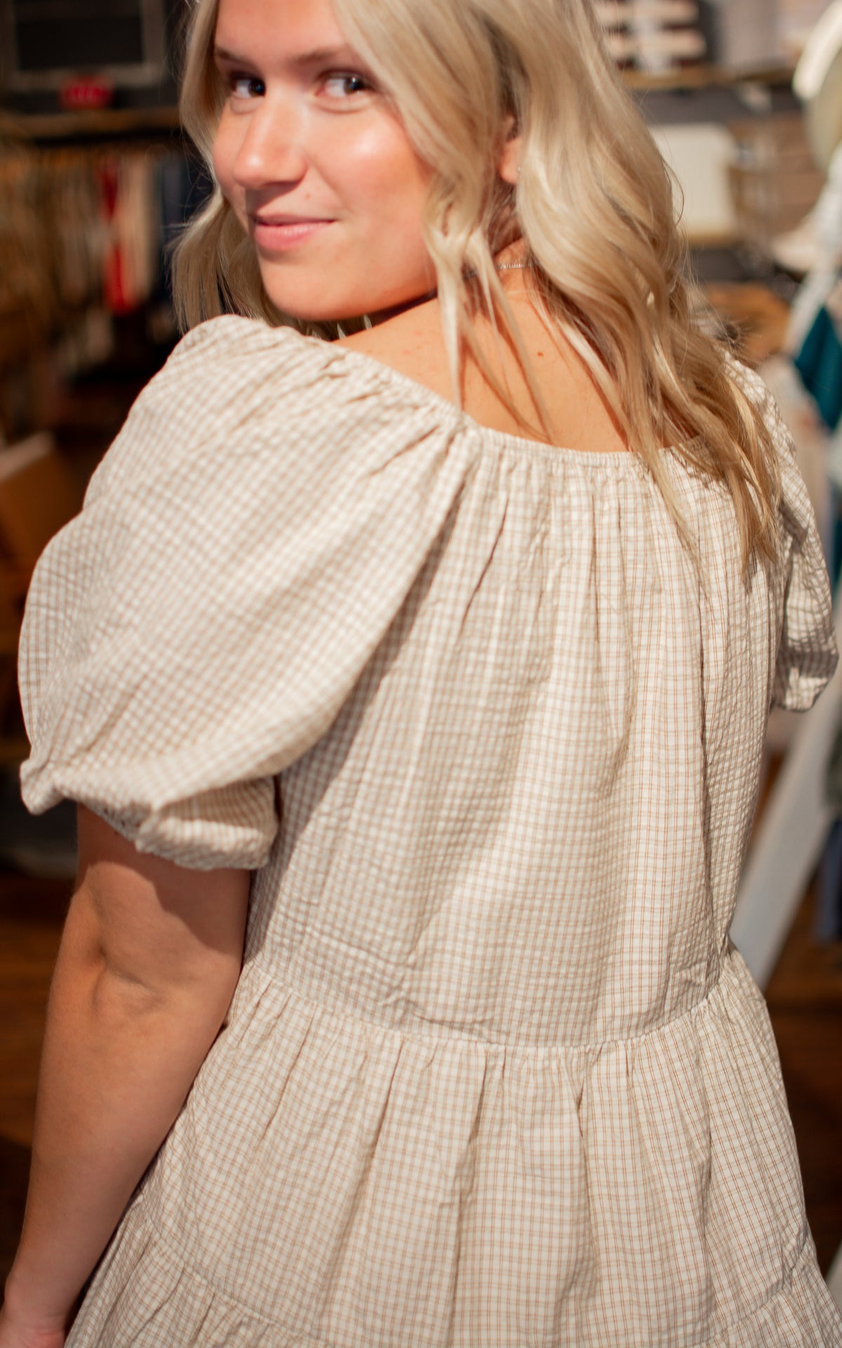 Step out in playful style with the Trixie Mini Dress. Featuring flirty puff sleeves and a gathered tiered skirt, this mini dress adds charming volume and fun flair to any day or night out.