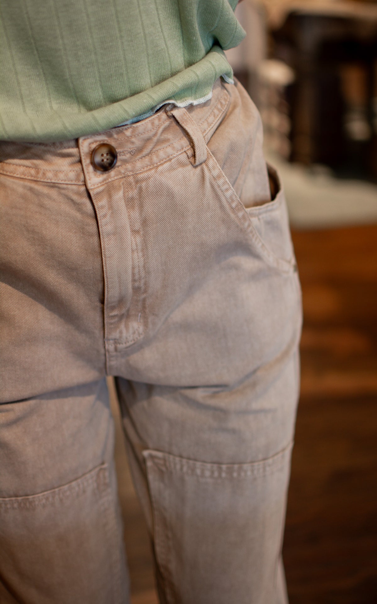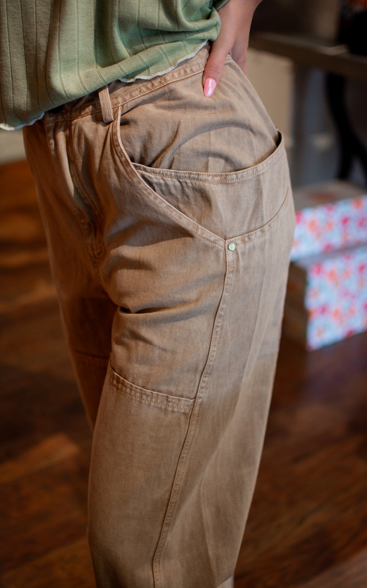 The Barrel Racing Mid Rise Pants feature a fun brown barrel jean style with double pockets for extra convenience. Designed for easy movement and playful days, these pants combine practicality with a cute, casual vibe.