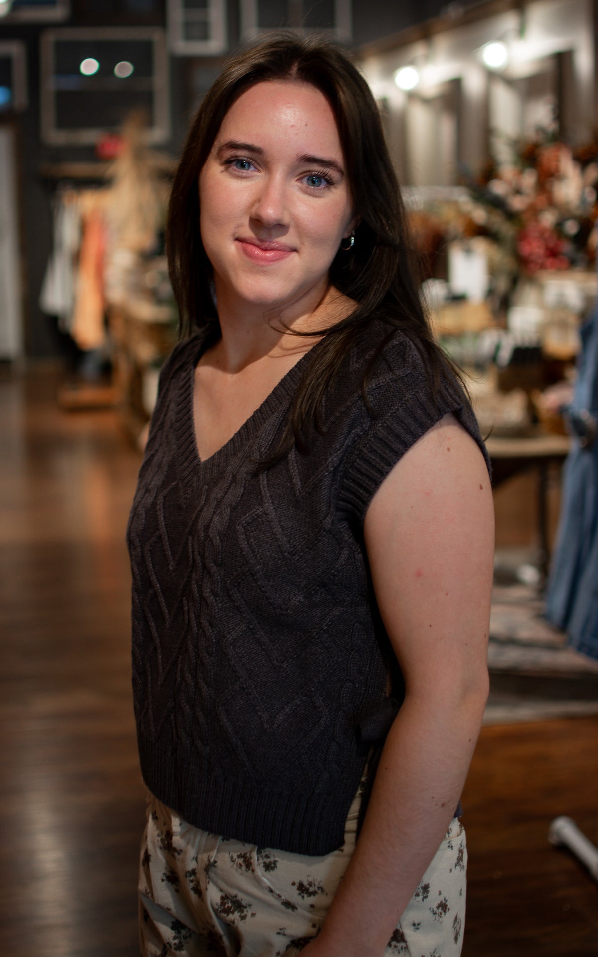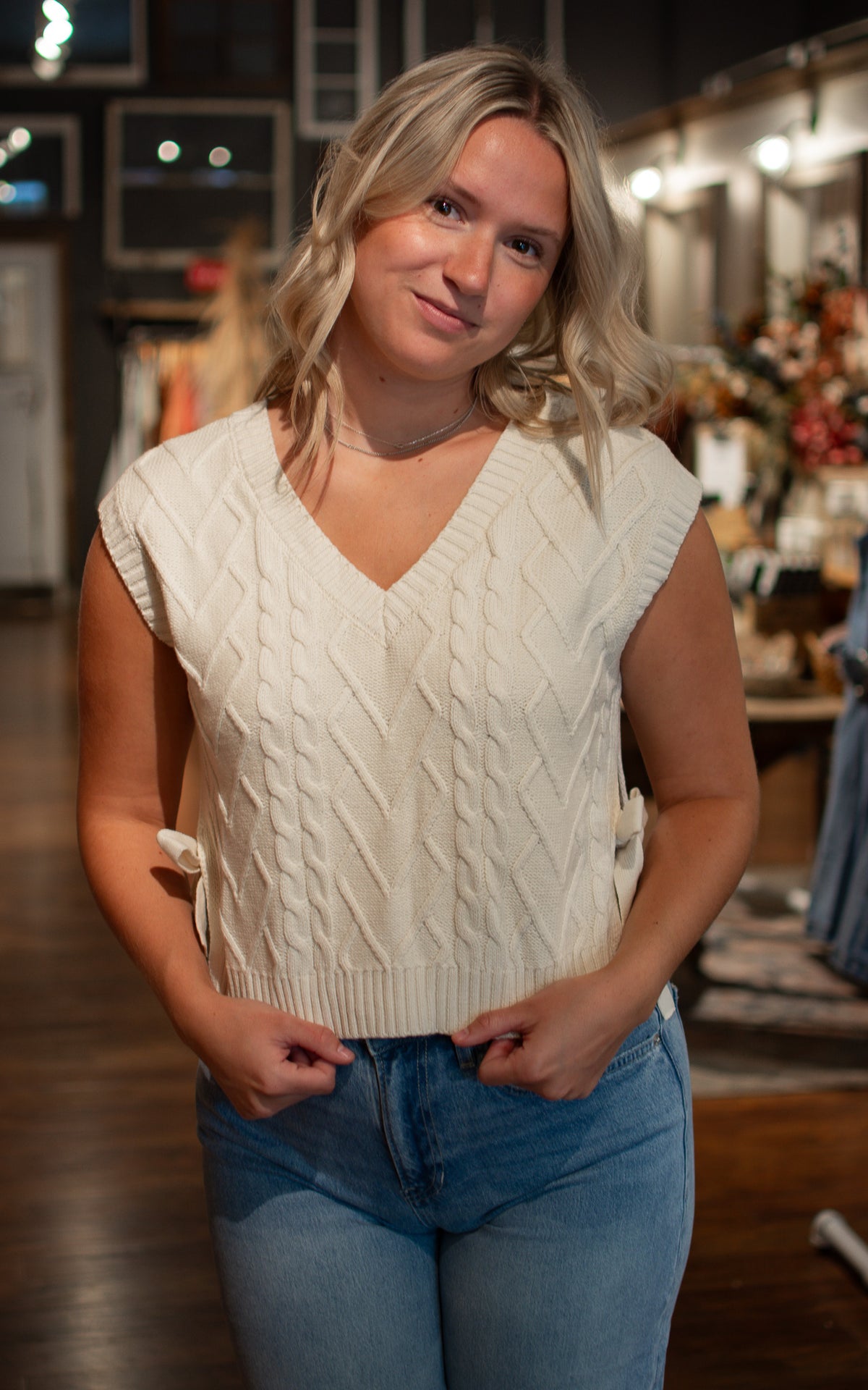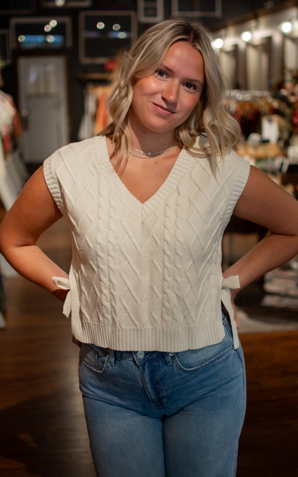 Add a playful twist to your layering with the Biz Sweater Vest. This cutie knit vest features a charming bow on the sideseam and comes in versatile charcoal and cream—perfect for mixing fun and cozy in any outfit.