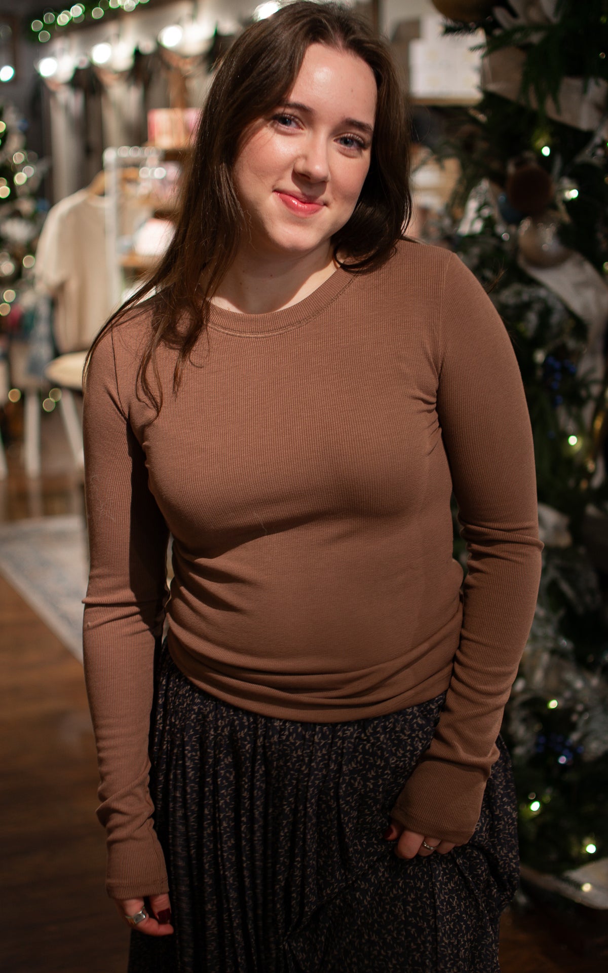 The Carmen Queen Top is your playful go-to basic. This long sleeve ribbed gem comes in soft oatmeal or light blue, offering cozy comfort and effortless style for any day you want to keep it simple and fun.