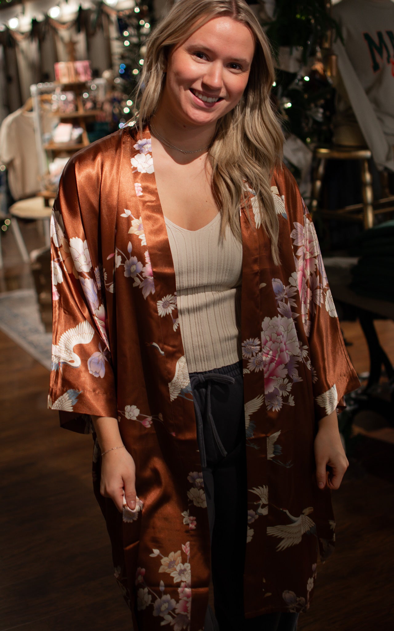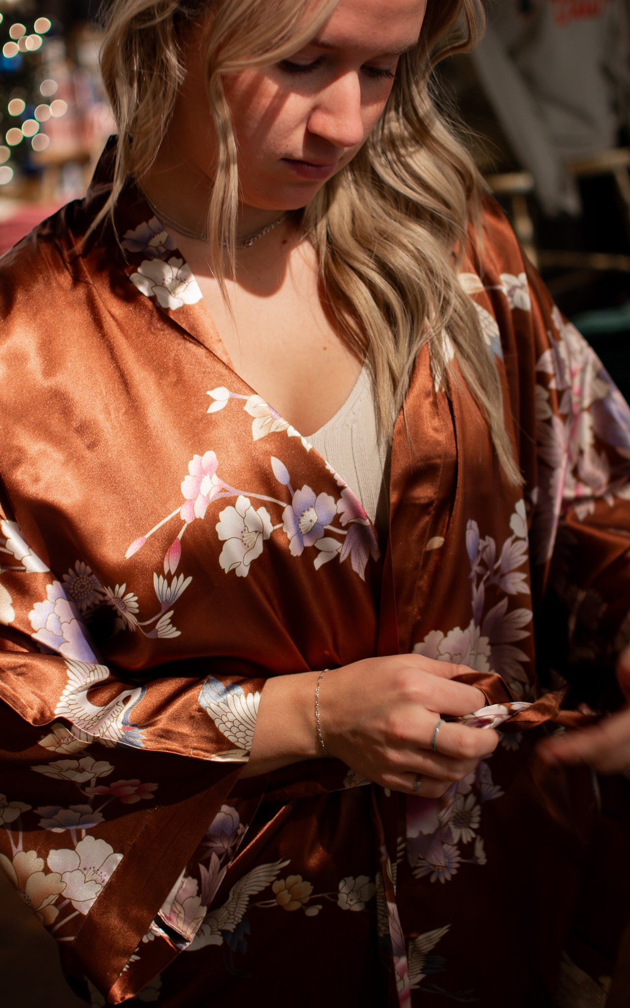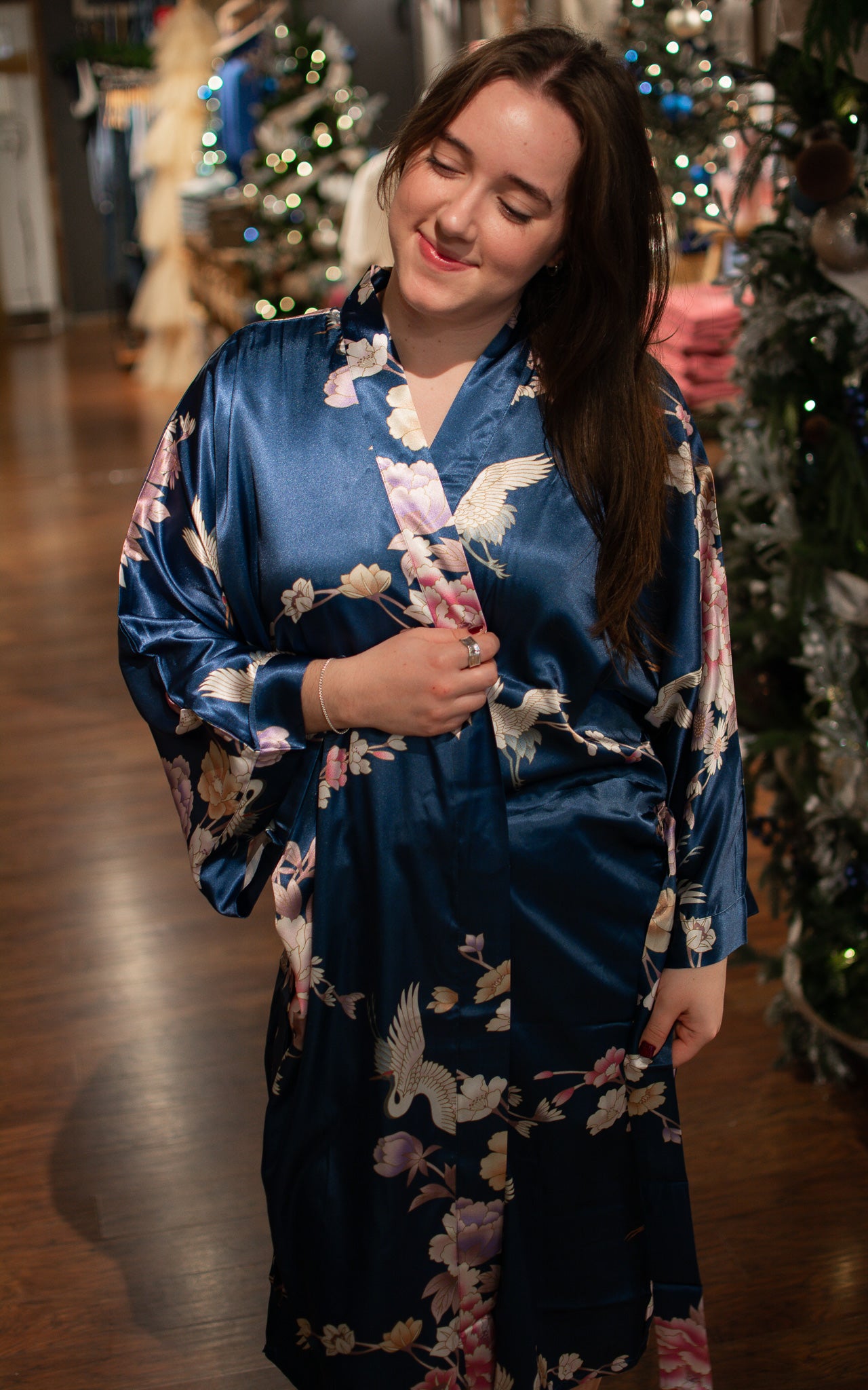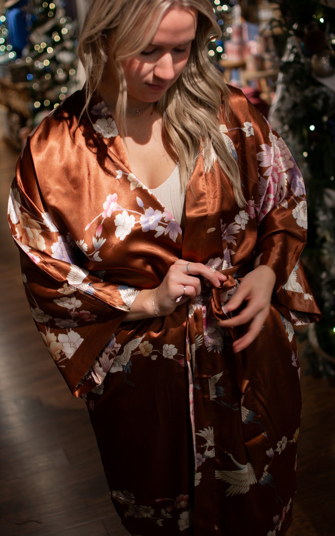 Channel effortless elegance in this long satin robe available in rich rust or deep navy. The beautiful patterned design brings visual interest and sophistication to your loungewear collection. The flowing silhouette drapes beautifully while the luxe satin fabric feels incredible against your skin. Perfect for those moments when you want to feel special without trying too hard—whether you're getting ready or winding down.