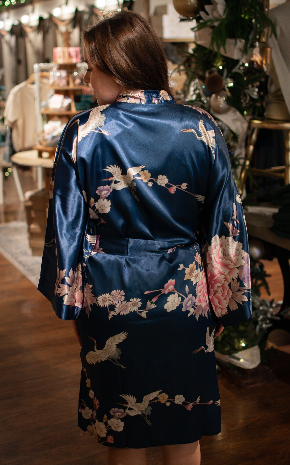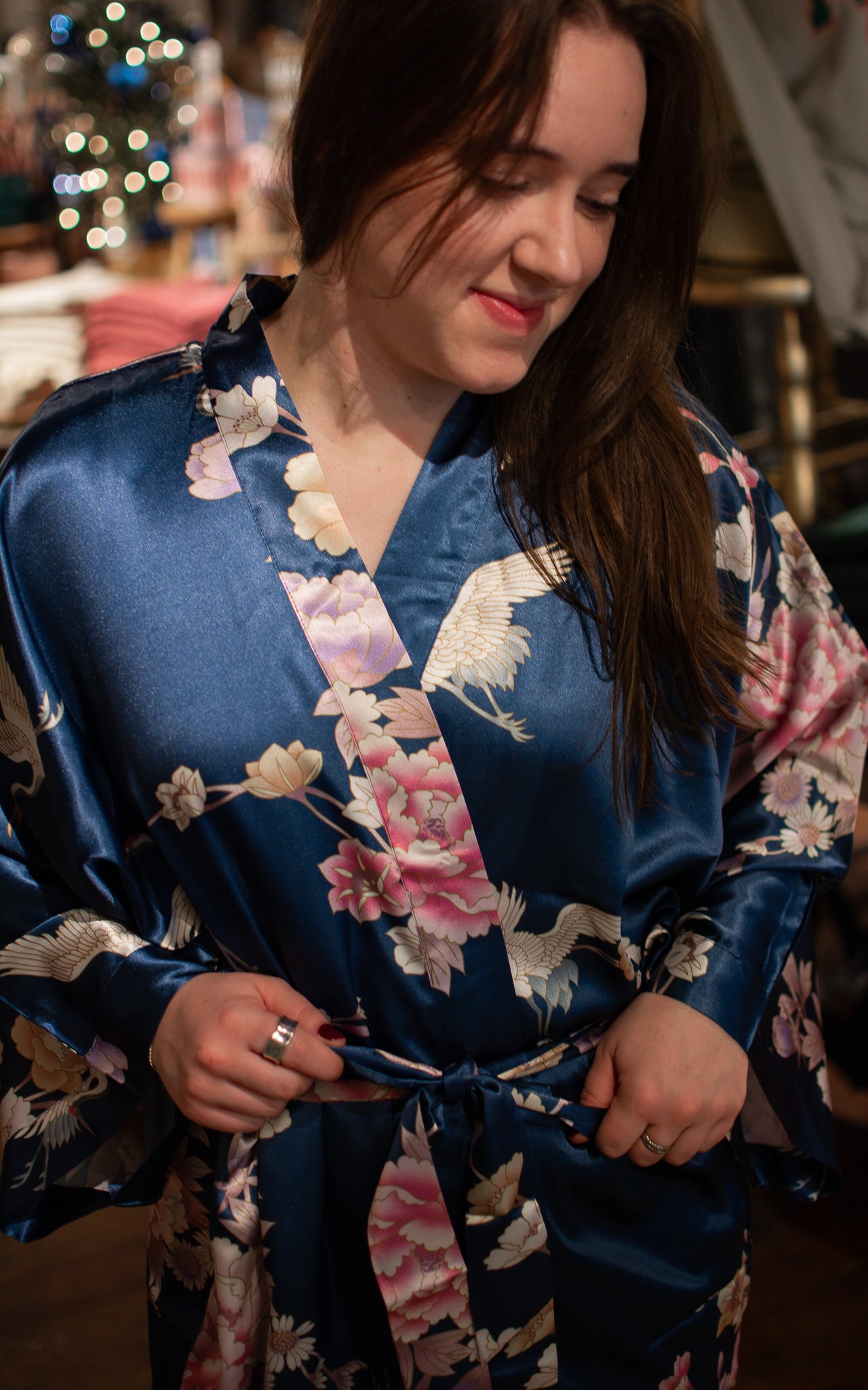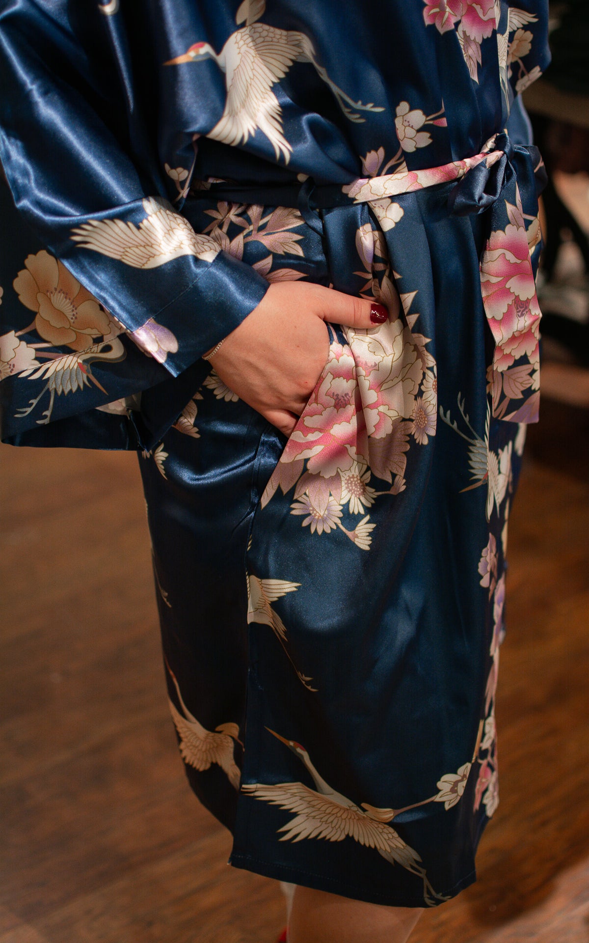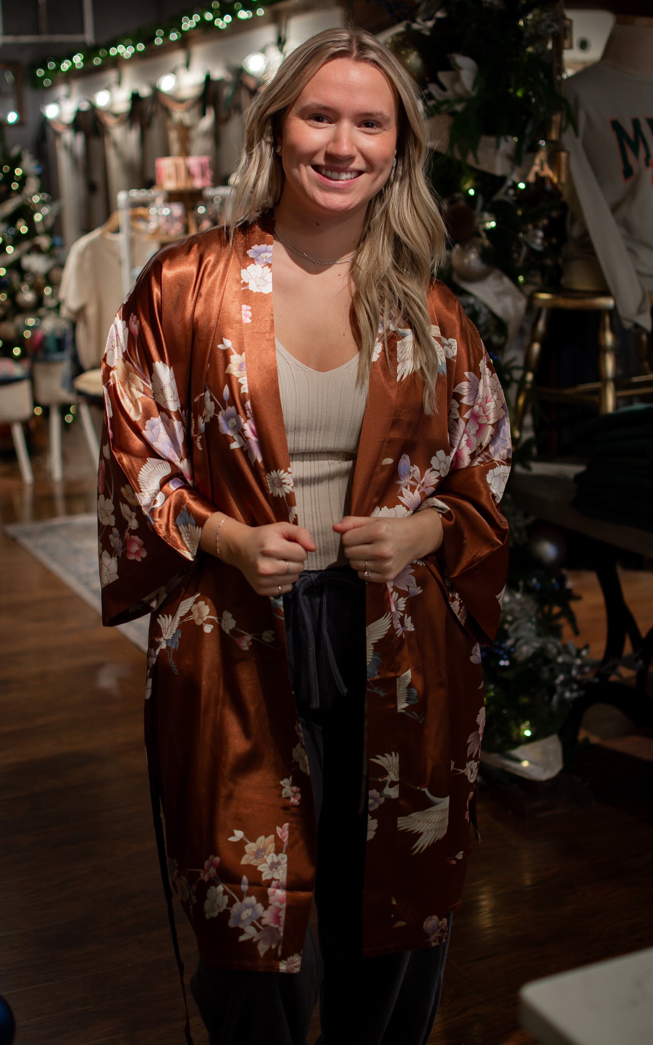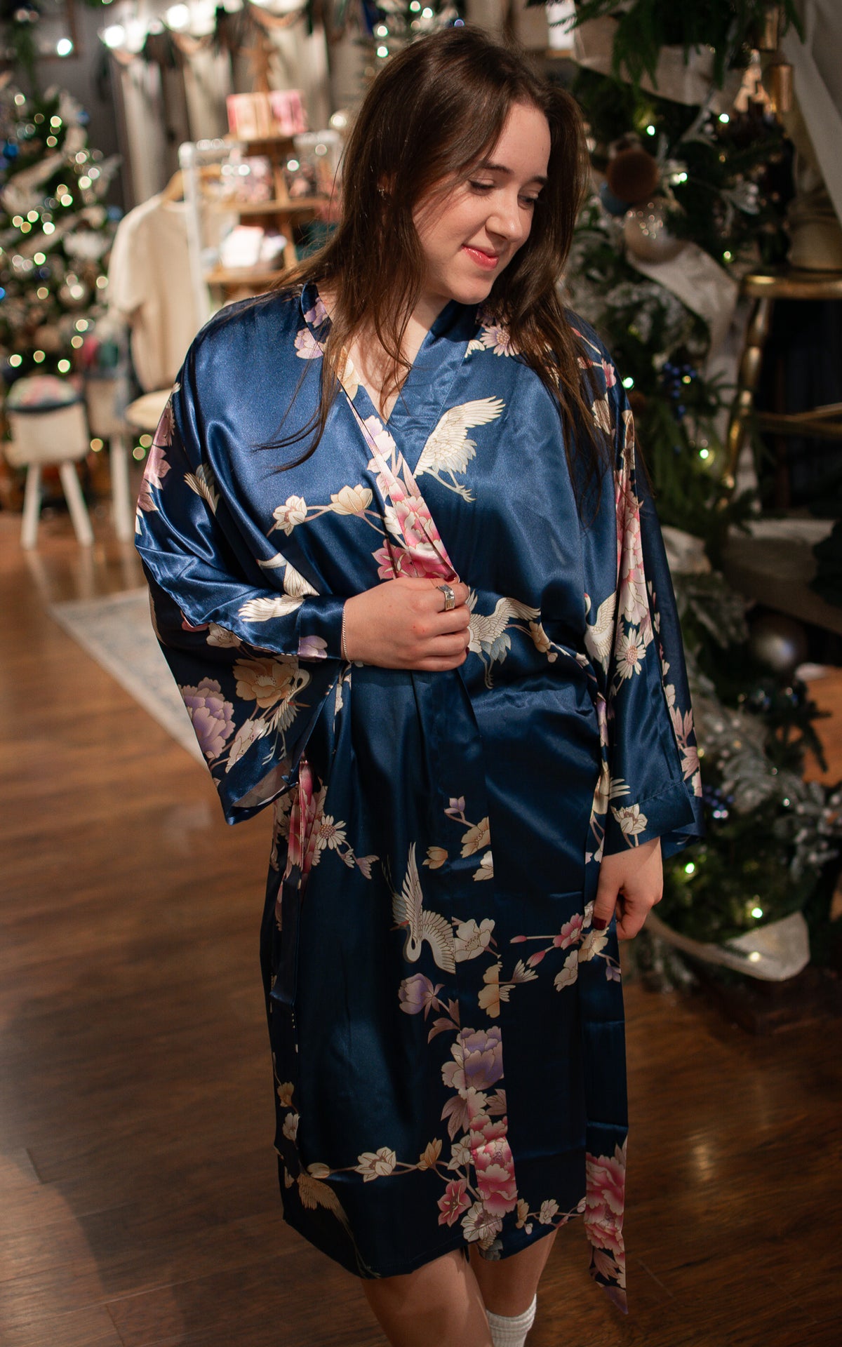 Channel effortless elegance in this long satin robe available in rich rust or deep navy. The beautiful patterned design brings visual interest and sophistication to your loungewear collection. The flowing silhouette drapes beautifully while the luxe satin fabric feels incredible against your skin. Perfect for those moments when you want to feel special without trying too hard—whether you're getting ready or winding down.