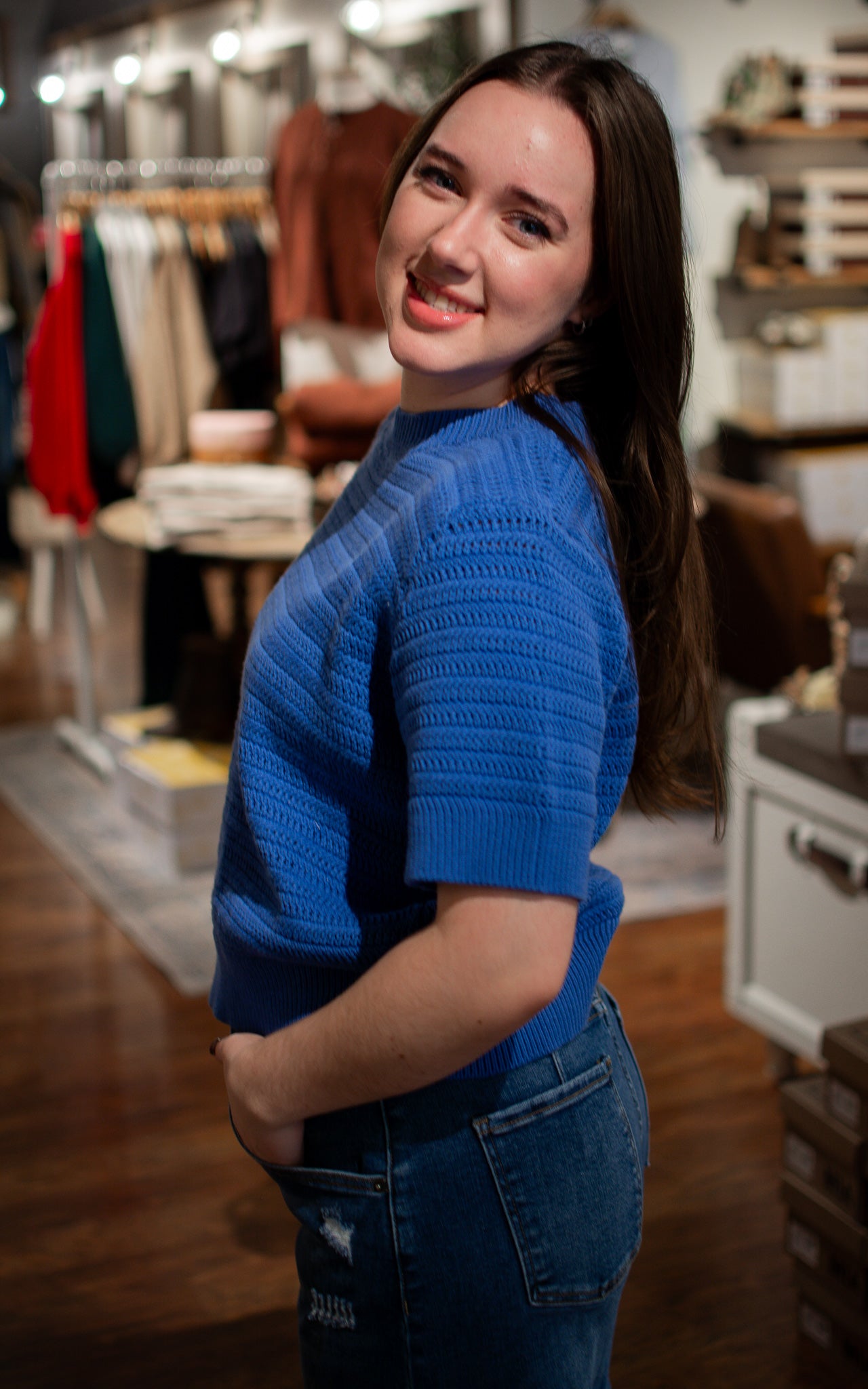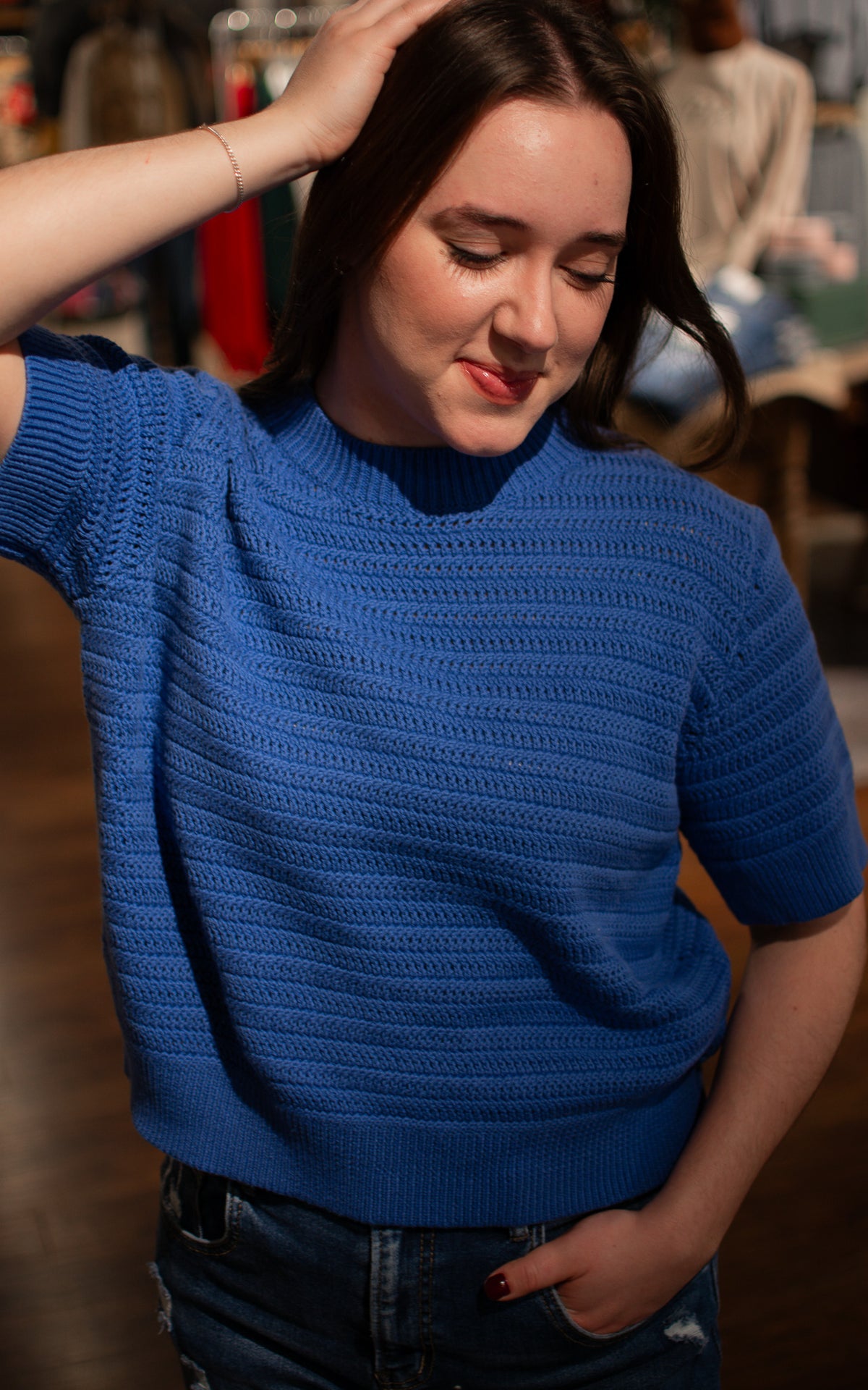 Make waves with this stunning royal blue sweater top that brings coastal vibes to your everyday wardrobe. The short sleeves keep things breezy and comfortable, perfect for layering or wearing solo when the weather cooperates. Rich, vibrant, and endlessly wearable, this piece is your new go-to for adding a splash of bold color and playful energy to any casual look.