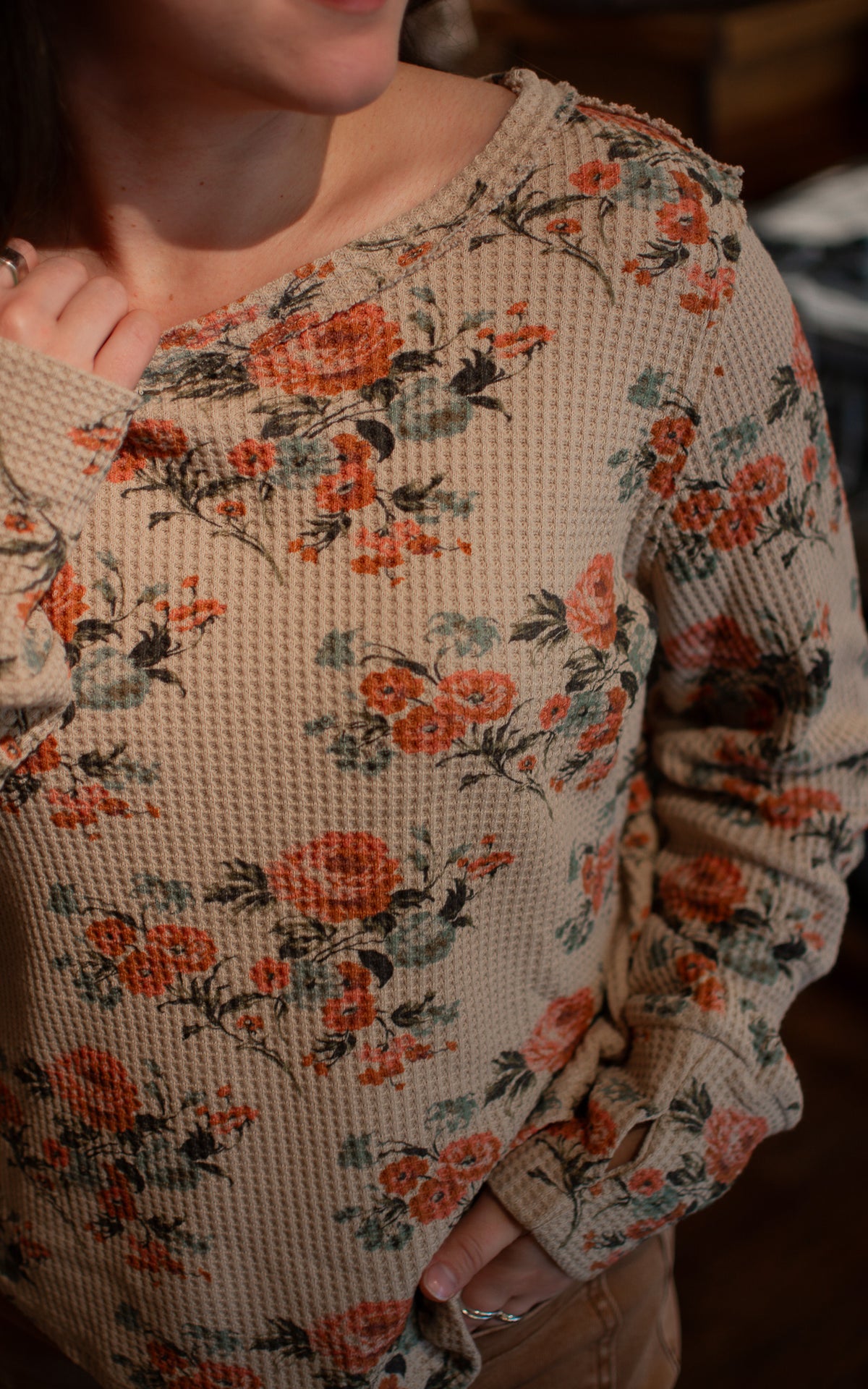 Stay cozy and cute in this beige waffle thermal top, adorned with charming pink and green floral prints. Designed with thumb holes for added comfort and warmth, it’s perfect for those crisp mornings when you want to feel like a true country girl with a playful twist.