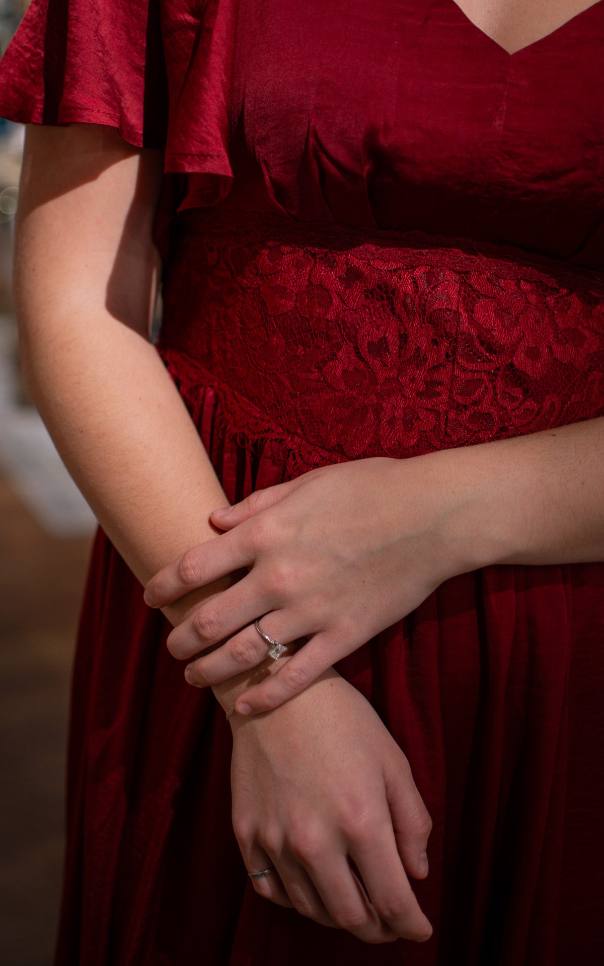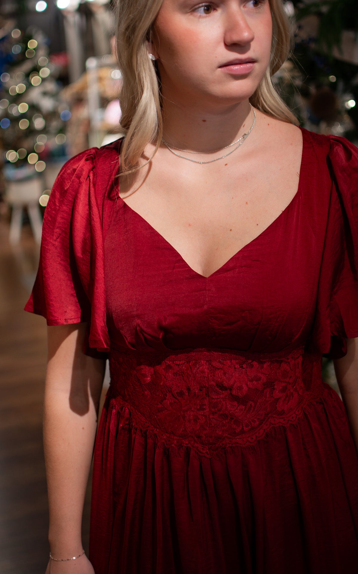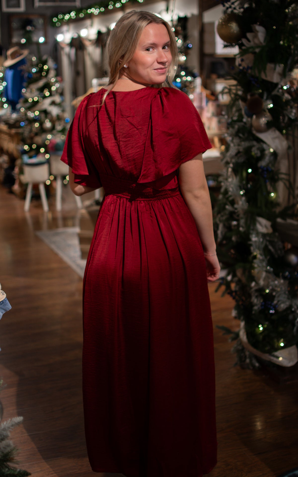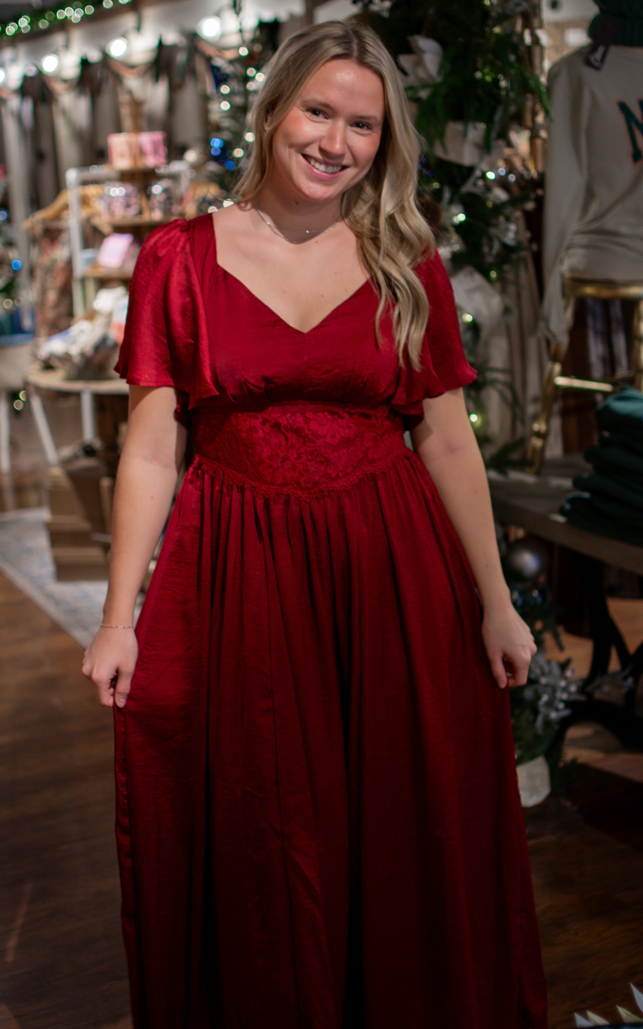The Cranberry Cutie Maxi Dress is pure romance in deep red. Crafted from textured satin that drapes beautifully, this dress features playful flutter sleeves that add movement and charm, while a peek-a-boo lace waistband brings an unexpected flirty detail. It's the kind of dress that feels as good as it looks—sophisticated, fun, and ready for your next special night out.
