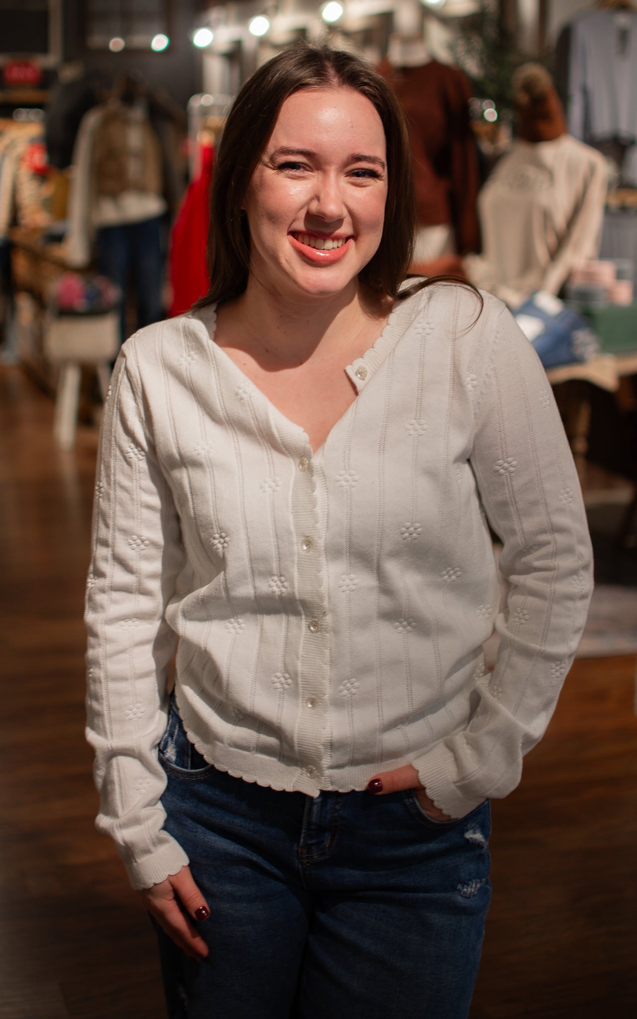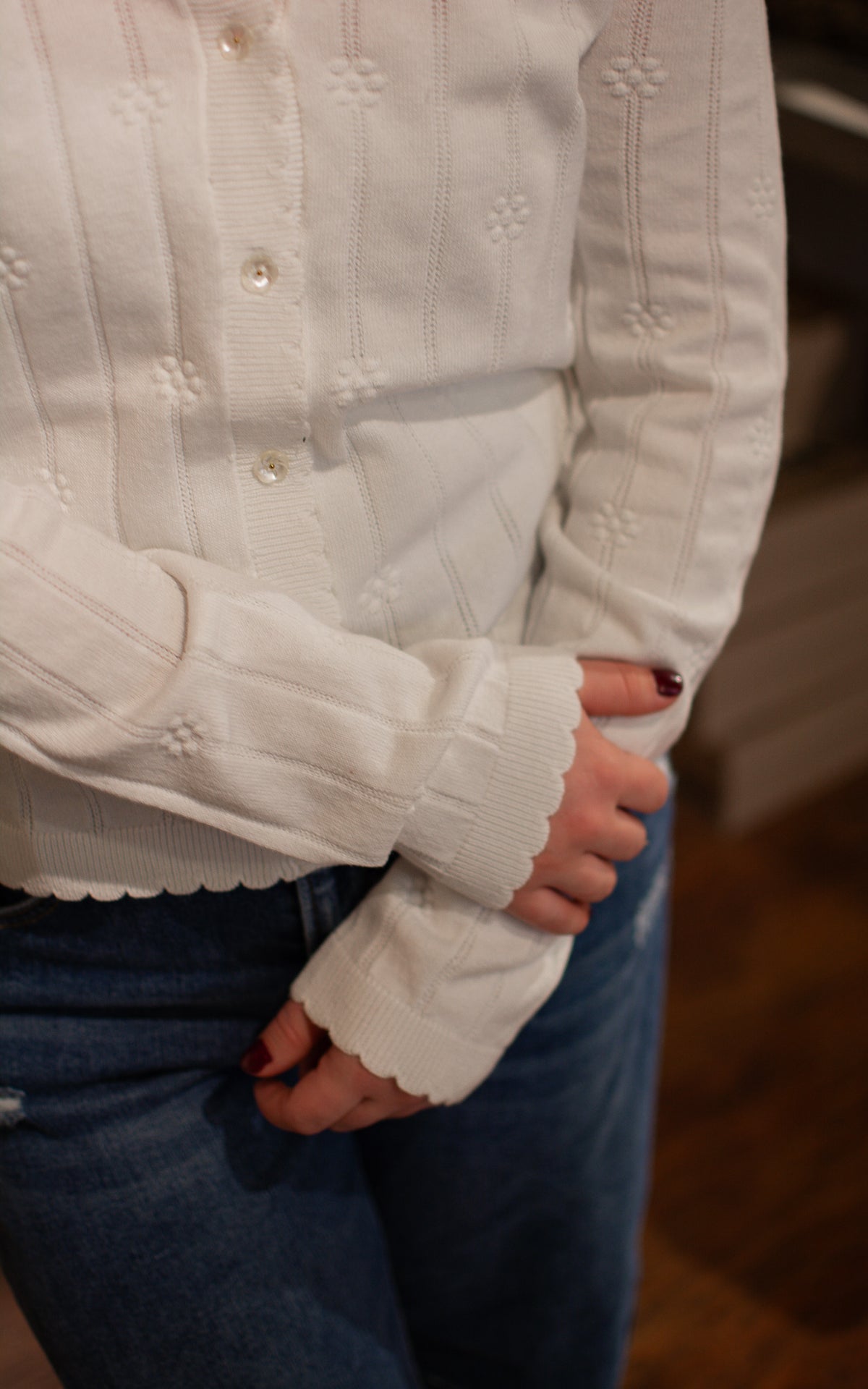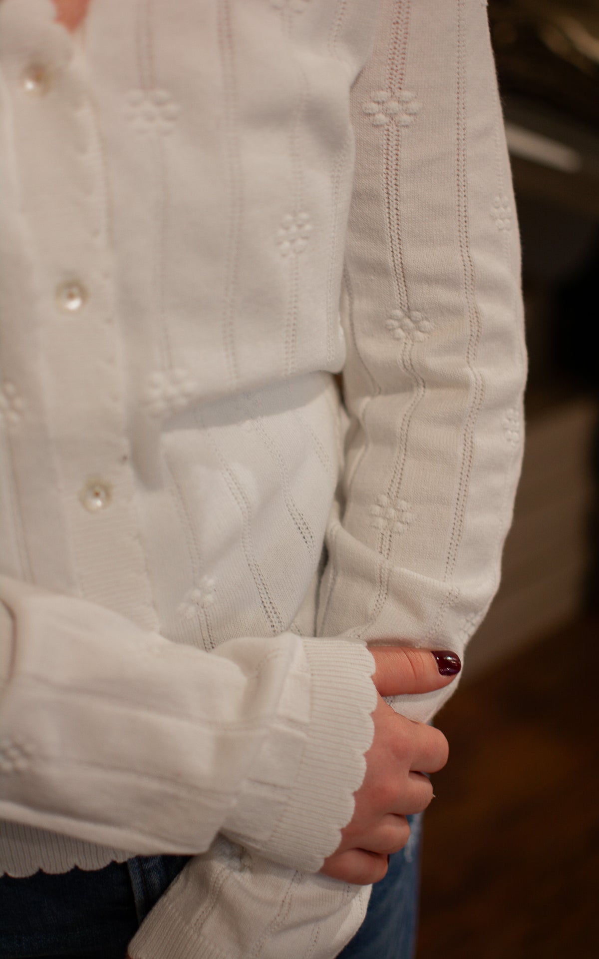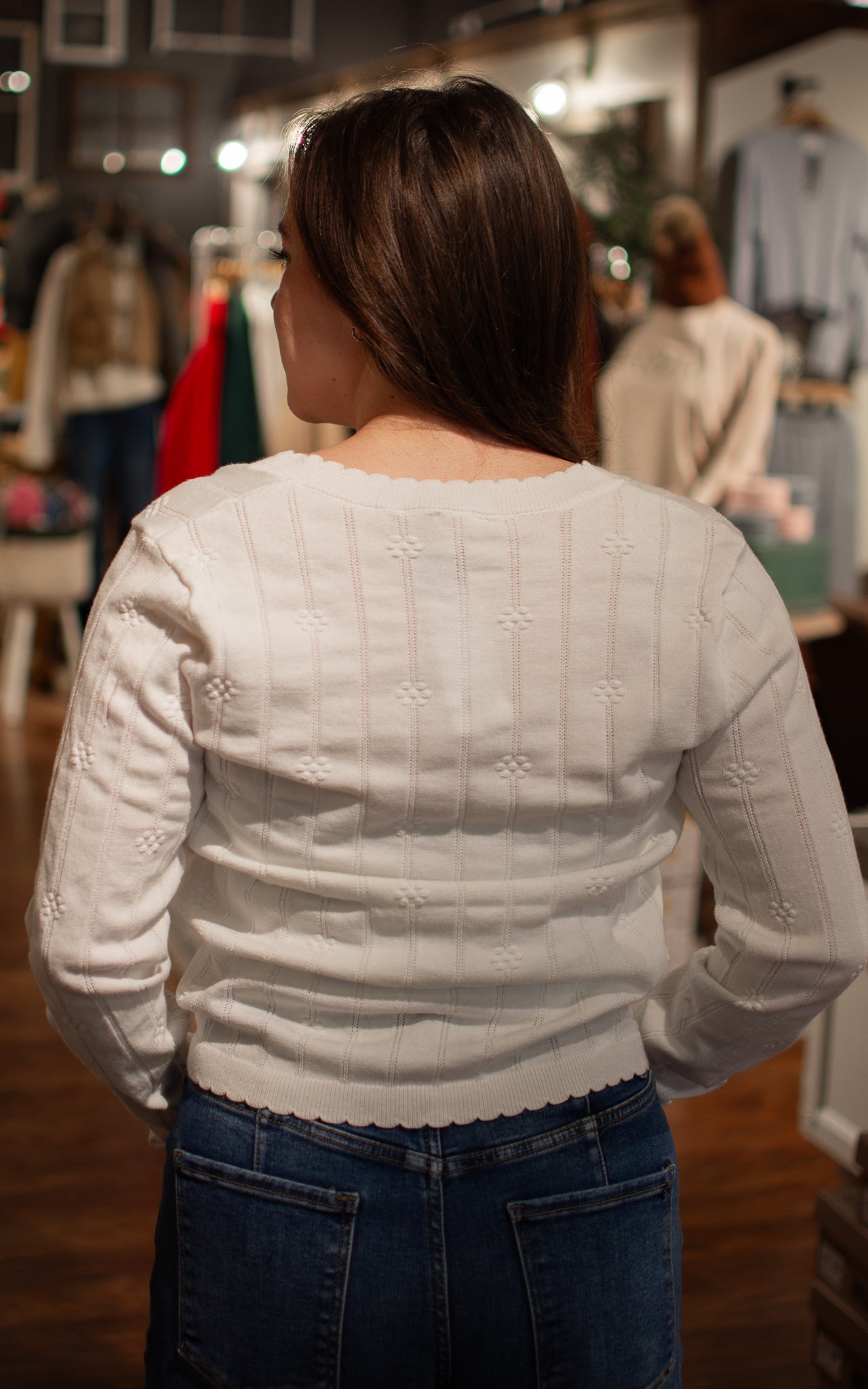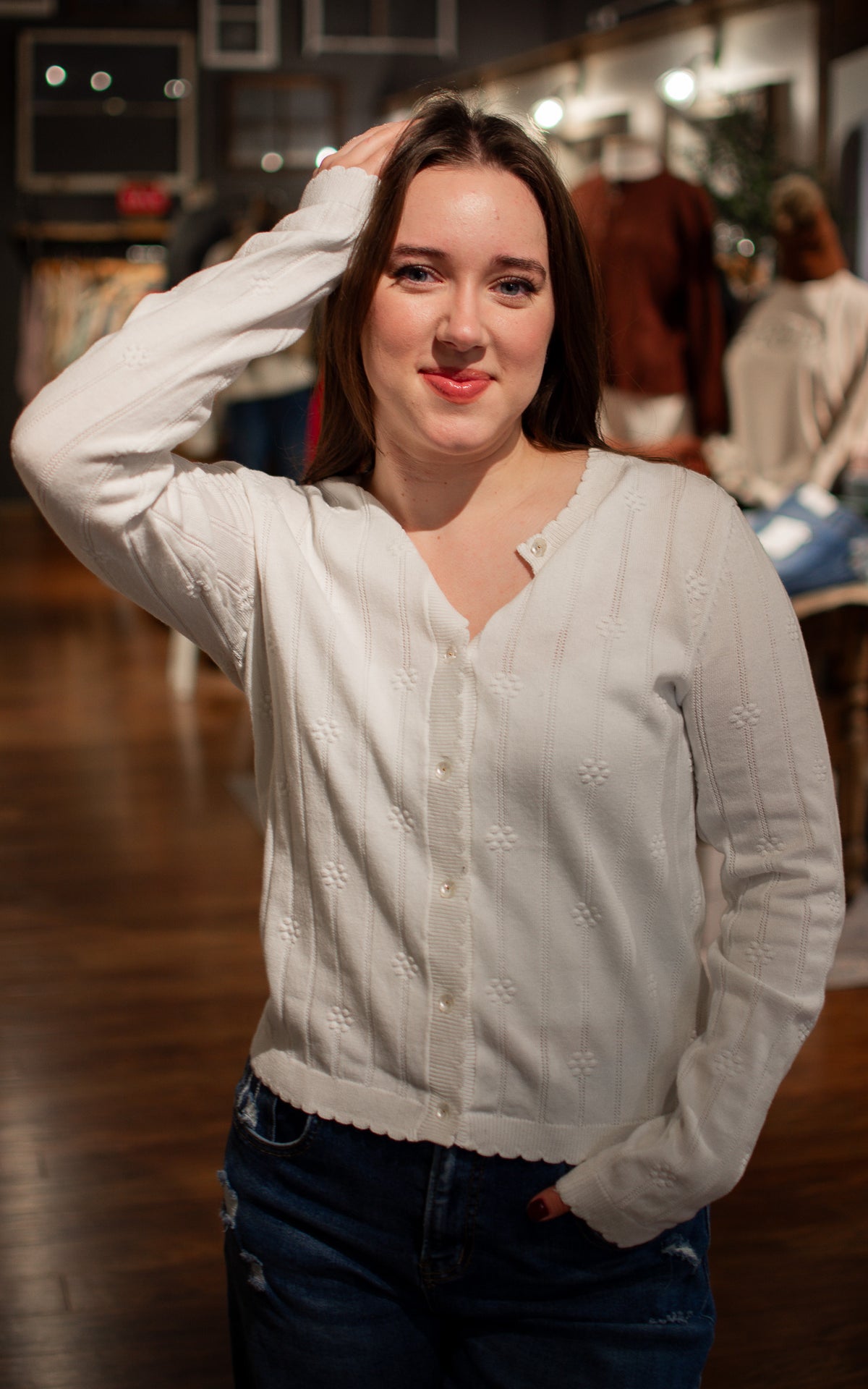 Bloom into style with this charming white cardigan adorned with delightful flower-shaped buttons that add a whimsical touch to every wear. The crisp white base keeps things fresh and versatile, while those playful floral buttons become an instant conversation starter. Perfect for layering over dresses, tees, or tanks, this cardigan brings a dash of botanical fun and timeless elegance to your everyday rotation.