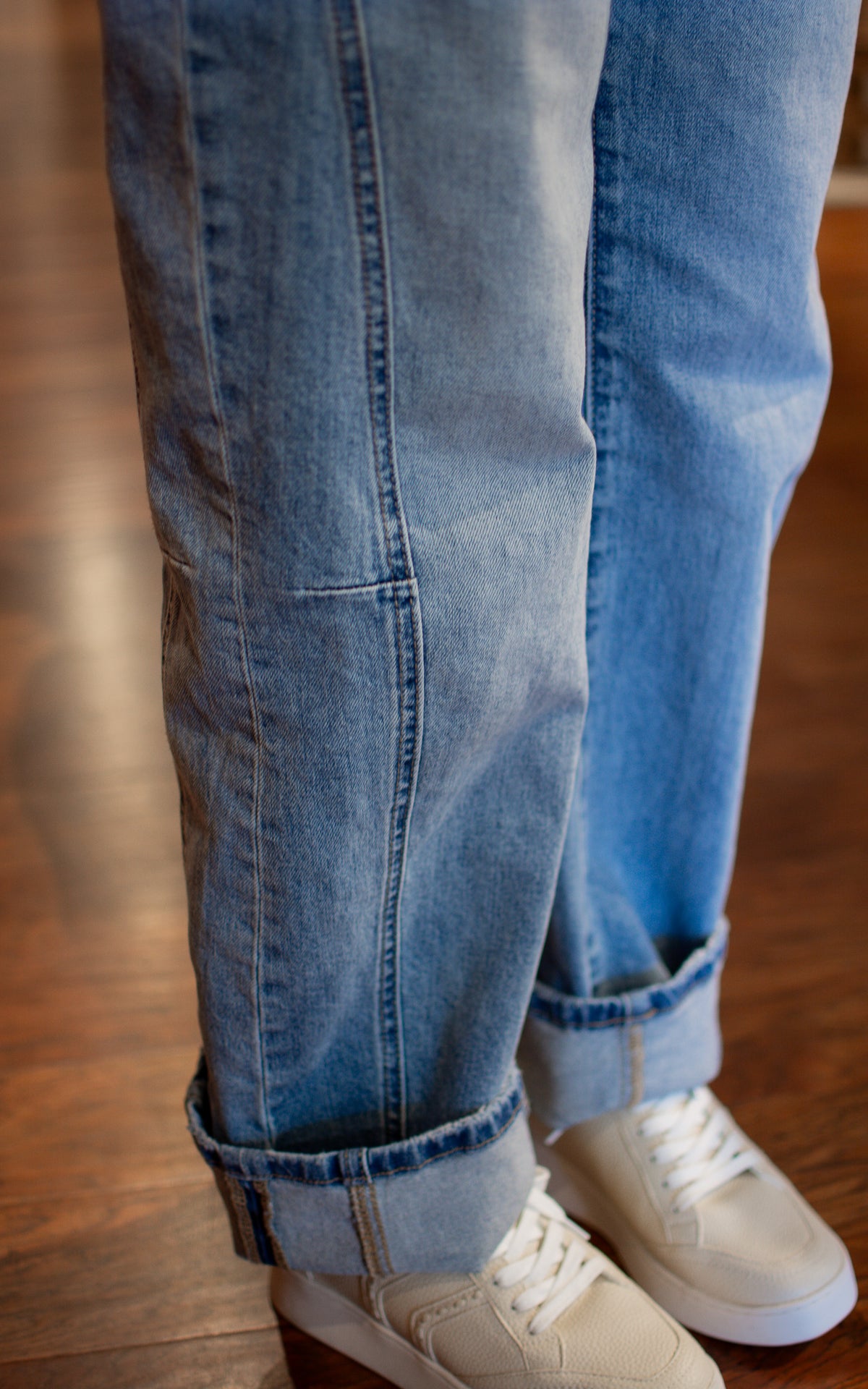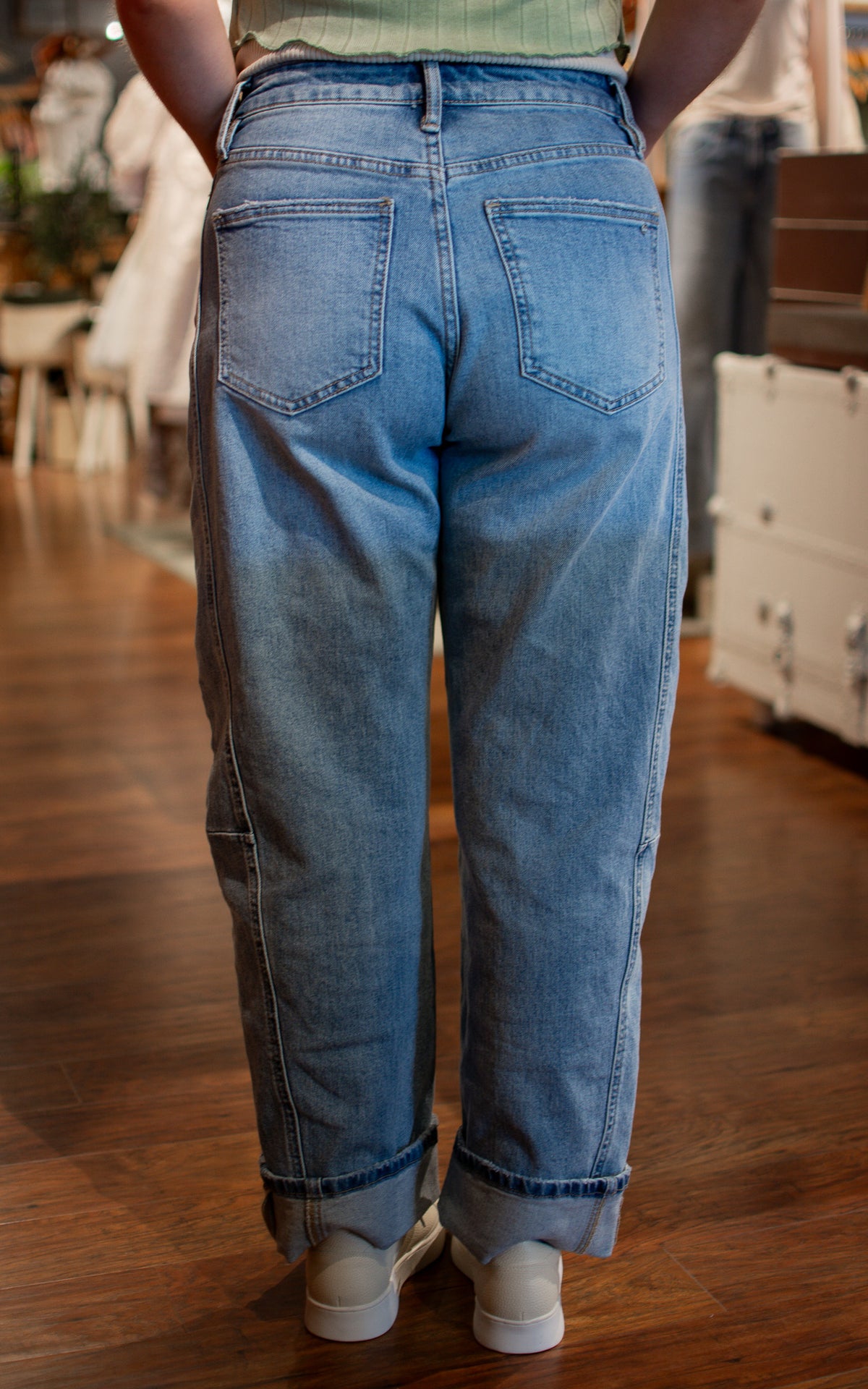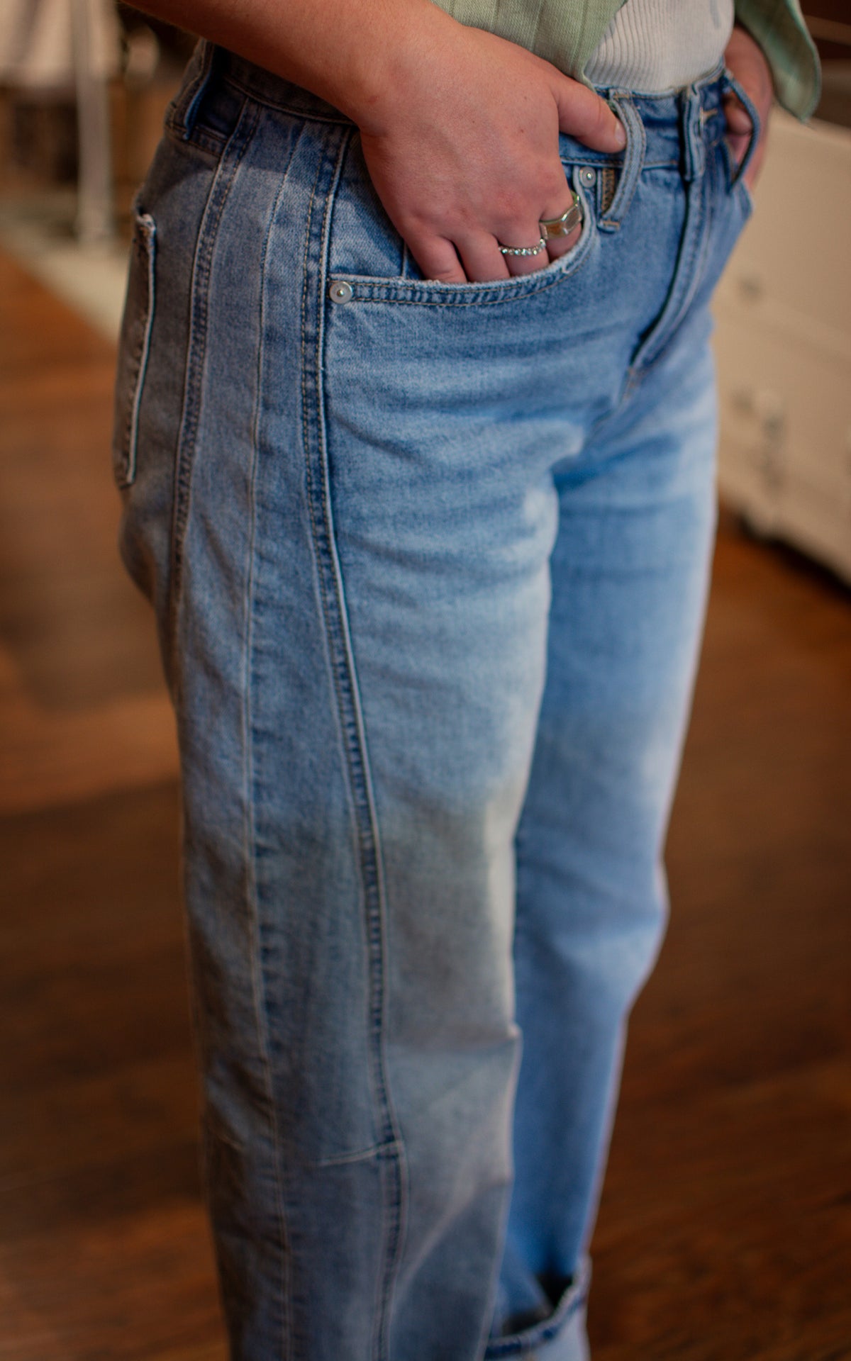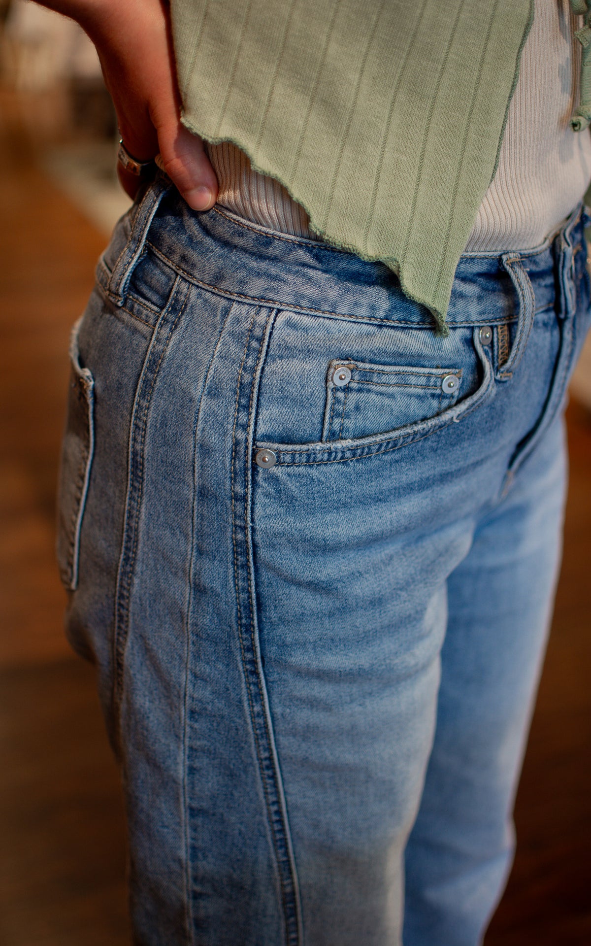 Trust us, you’ll want to jump on the Dusty Sky Barrel Mica Jeans train! These mid-rise jeans feature a subtle barrel shape and fun panel detailing that add a playful twist to your denim collection. Perfect for a stylish, comfortable look with a little extra flair.