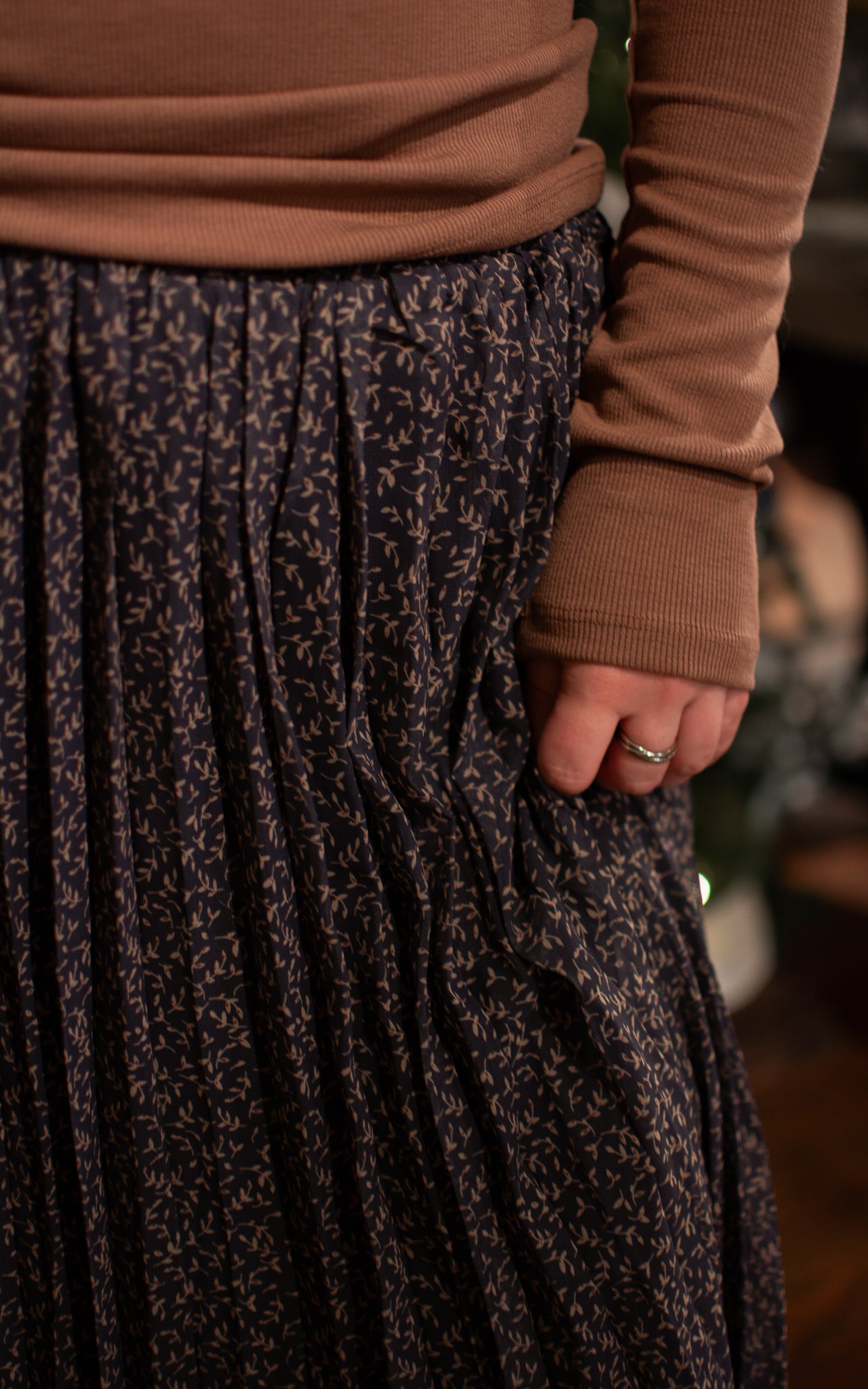 Twirl into autumn with this midi skirt that's equal parts elegant and whimsical. Soft pleats create beautiful movement and dimension, while the muted blue backdrop lets a delicate leaf pattern take center stage. The midi length hits just right for a polished look that works from day to night. Pair it with your favorite sweater or tuck in a crisp blouse—this skirt is ready for anything.