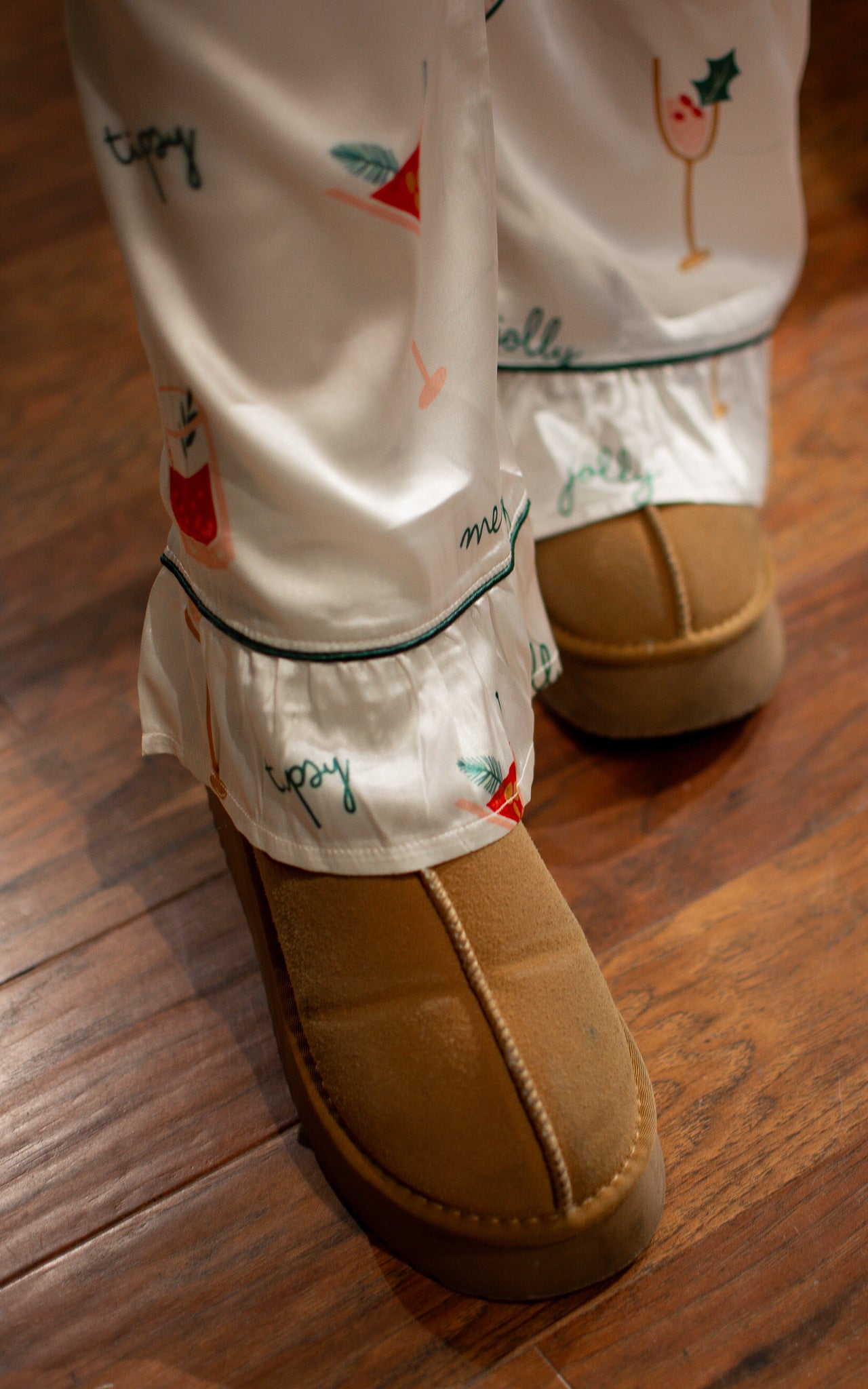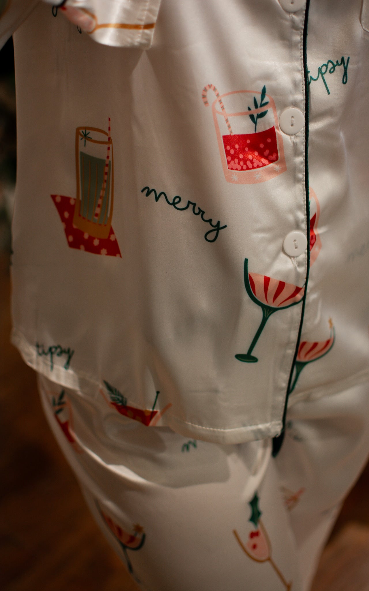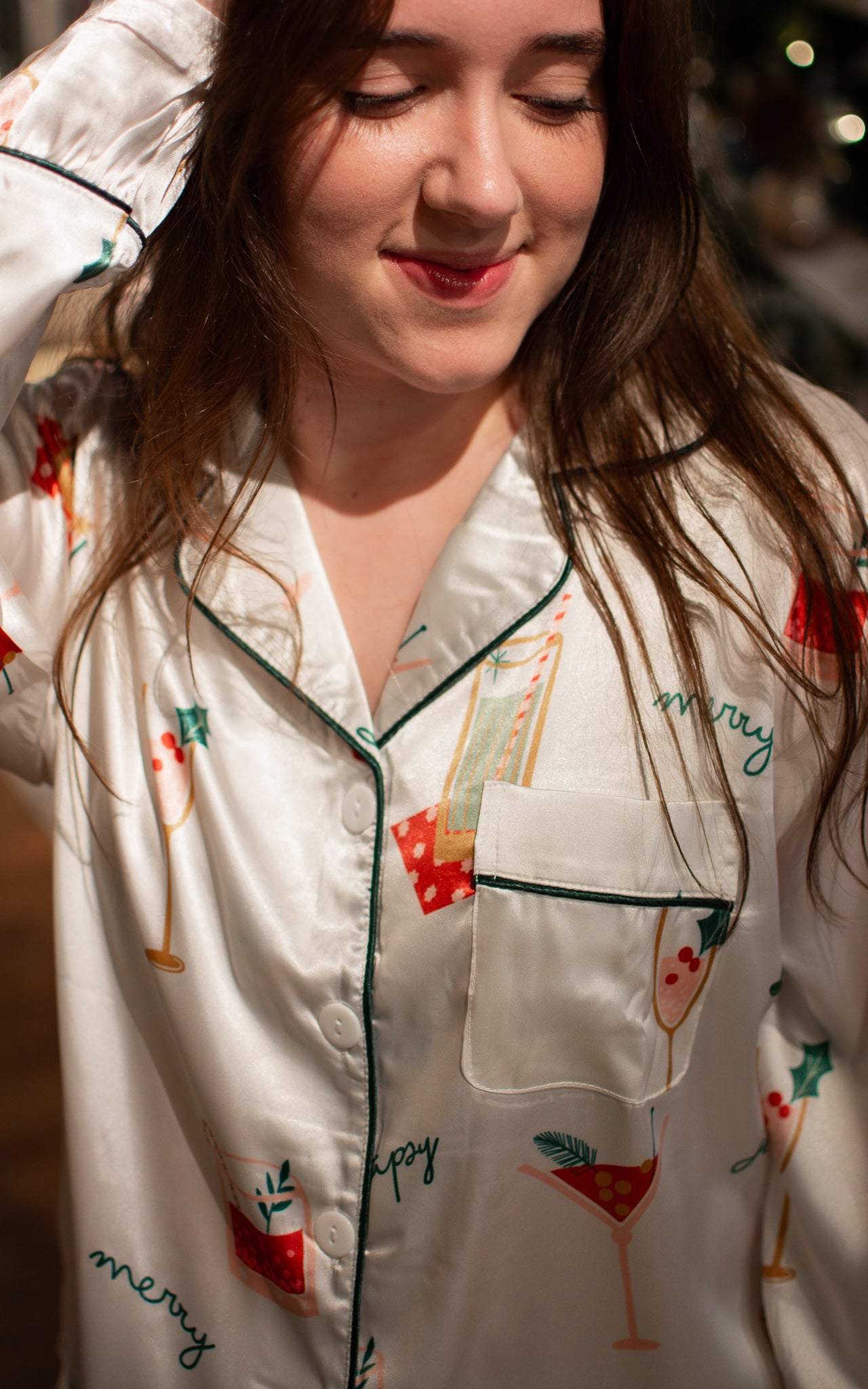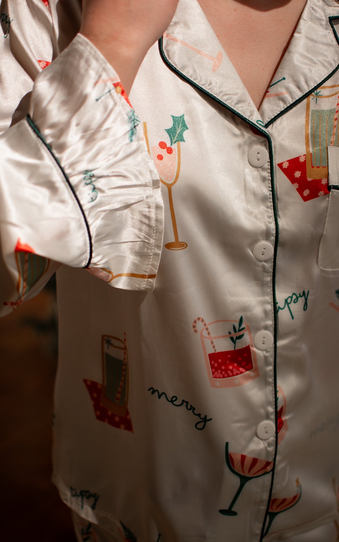 Celebrate the season in style with this festive satin pajama set featuring a fun holiday-inspired design. The coordinating long sleeve top and matching pants create a polished look that's perfect for cozy nights by the fire or holiday gatherings. The smooth satin fabric feels luxurious while keeping you comfortable all night long. Spread holiday cheer from your bedroom to your heart.