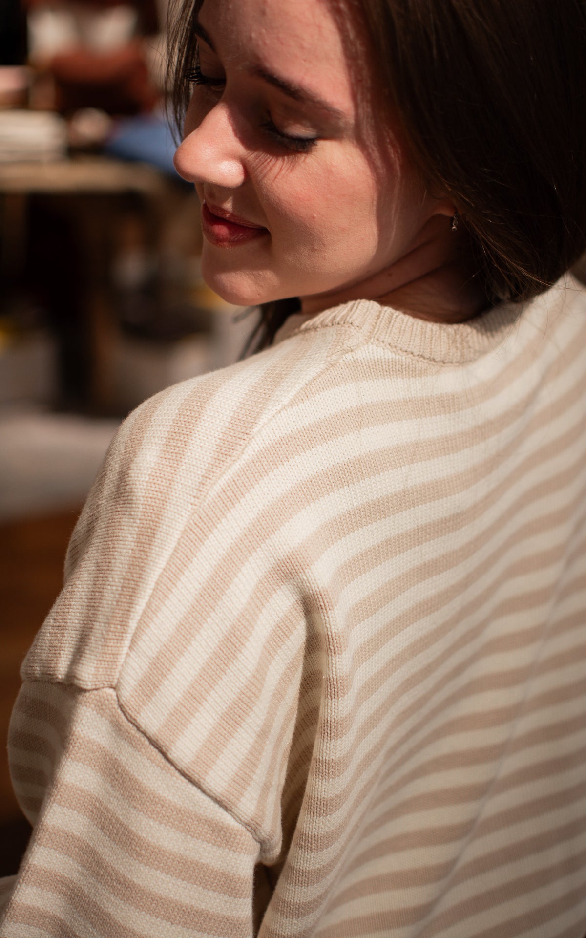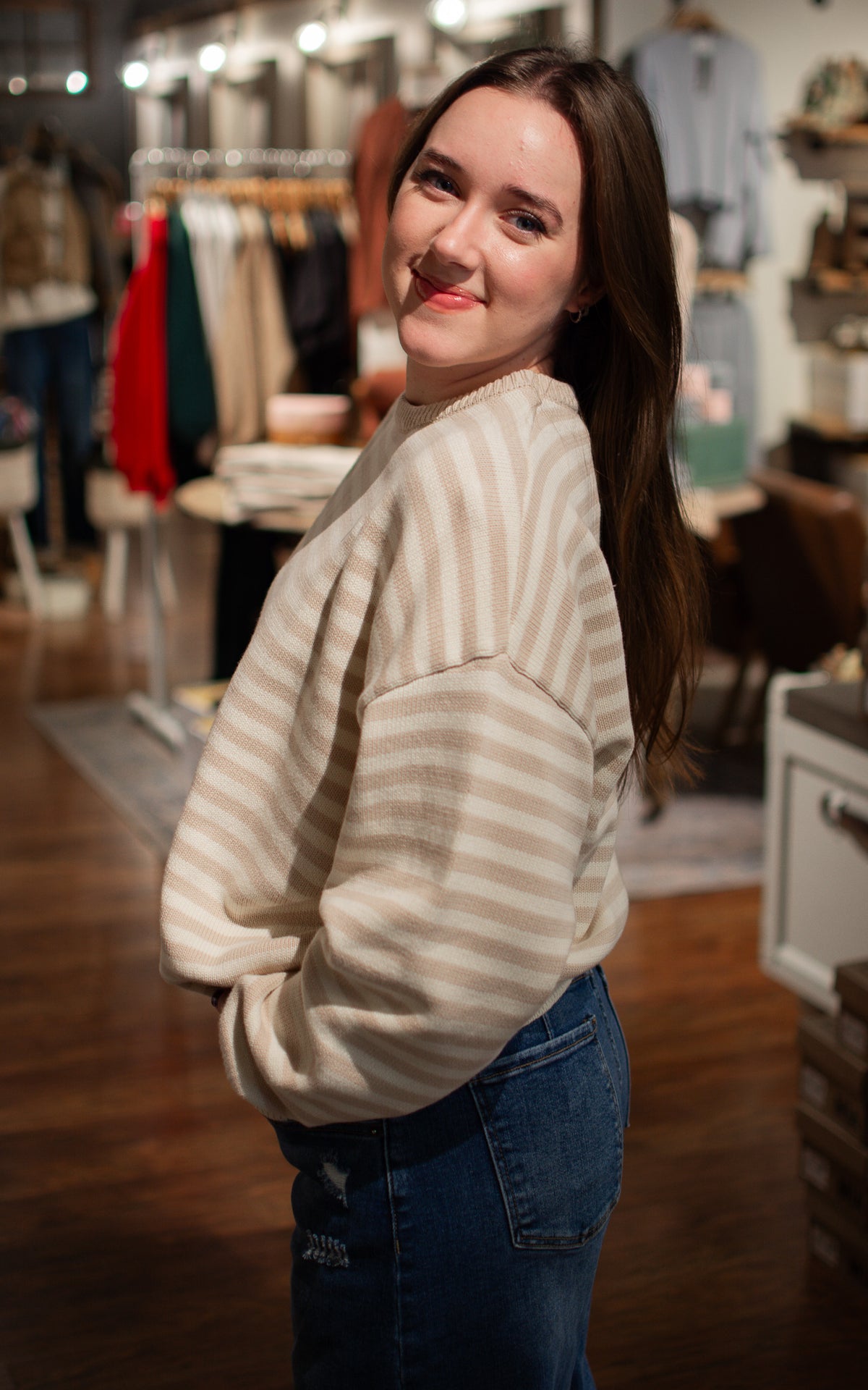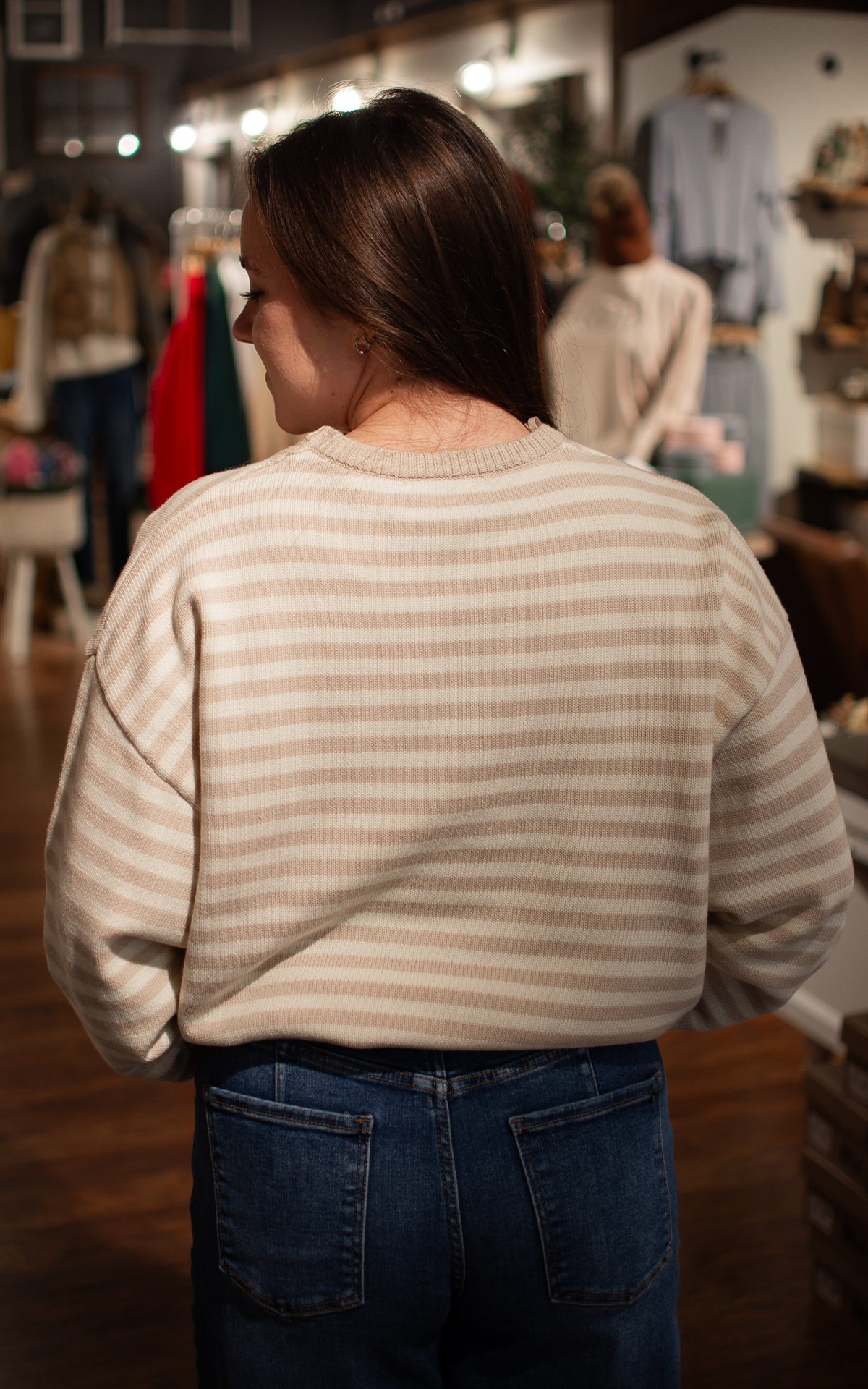 Snuggle up in this irresistible cream and tan striped sweater that's destined to become your go-to cozy essential. The soft, neutral stripes create a timeless look that pairs effortlessly with everything, while the comfortable fit makes it impossible to take off once you put it on. Perfect for lazy mornings, casual hangouts, or anytime you need a warm hug—this sweater is the definition of cozy done right.