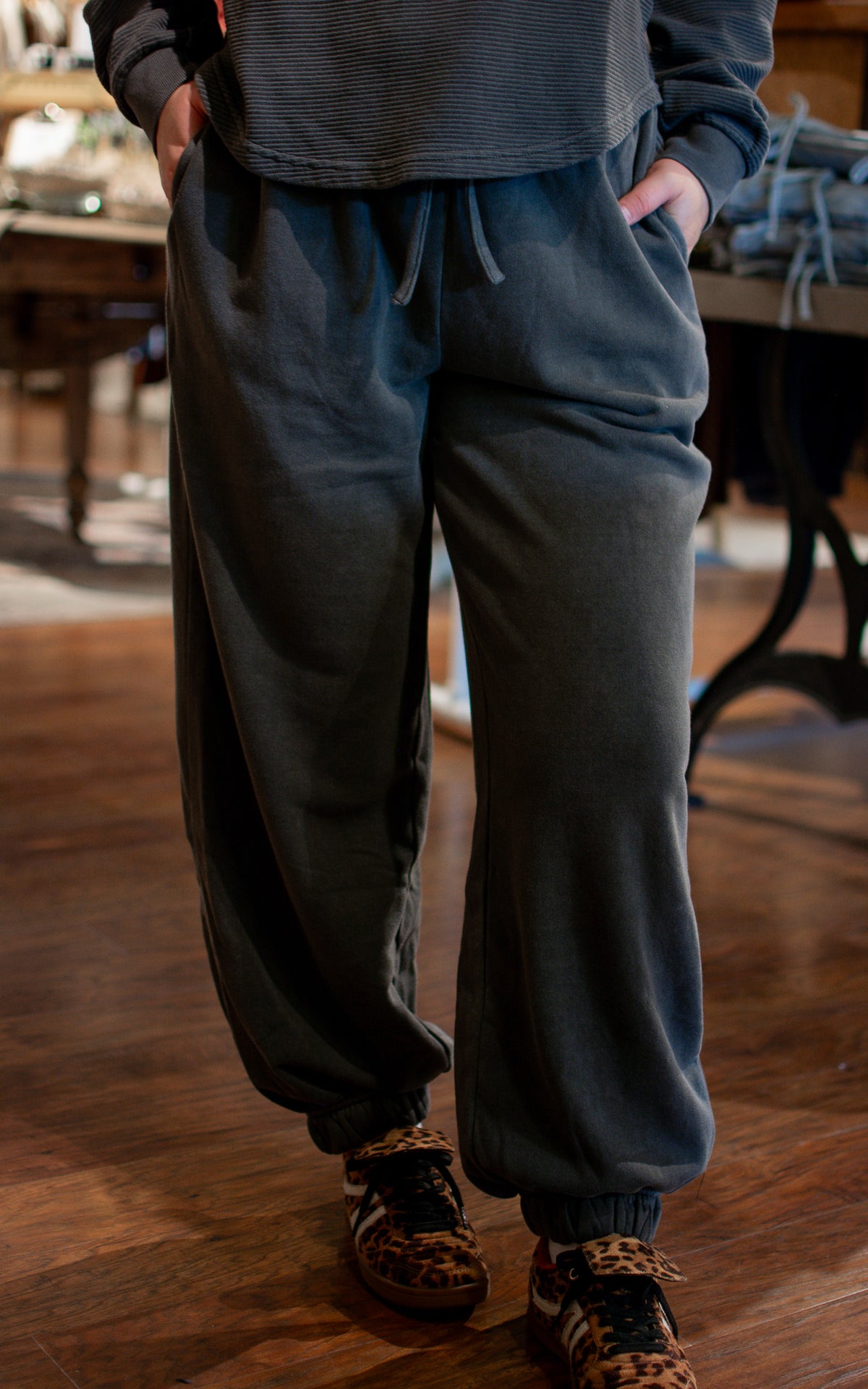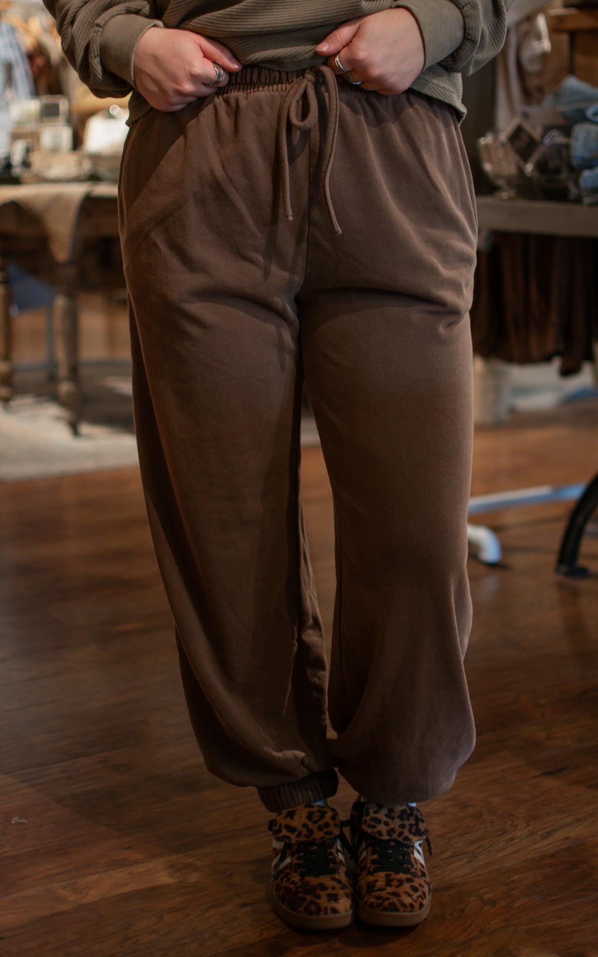 Lounge or move with ease in the Jog On Sweatpants, featuring a comfy drawstring waist and available in navy, mocha, charcoal, or brown. These playful sweatpants bring cozy style to your everyday chill vibes.