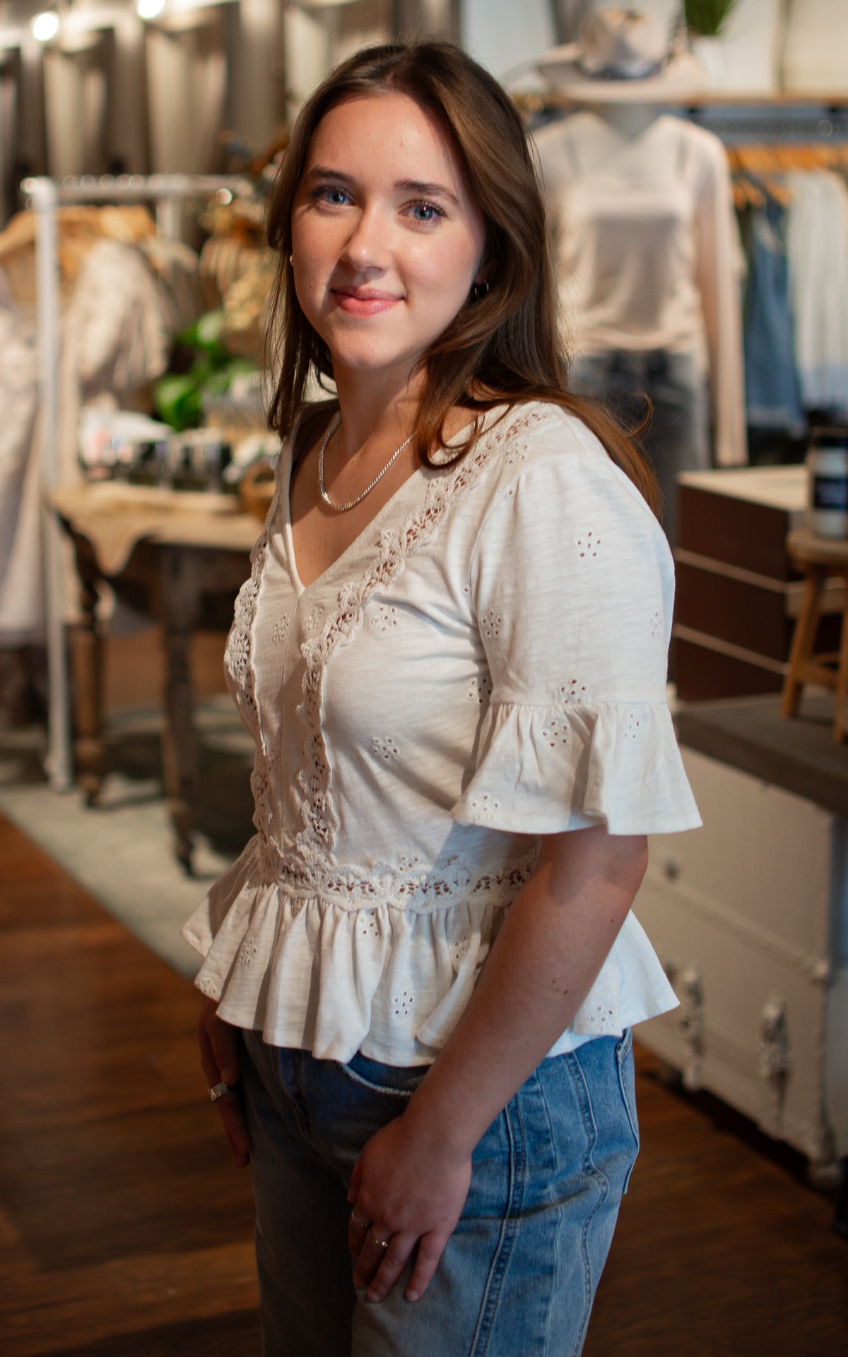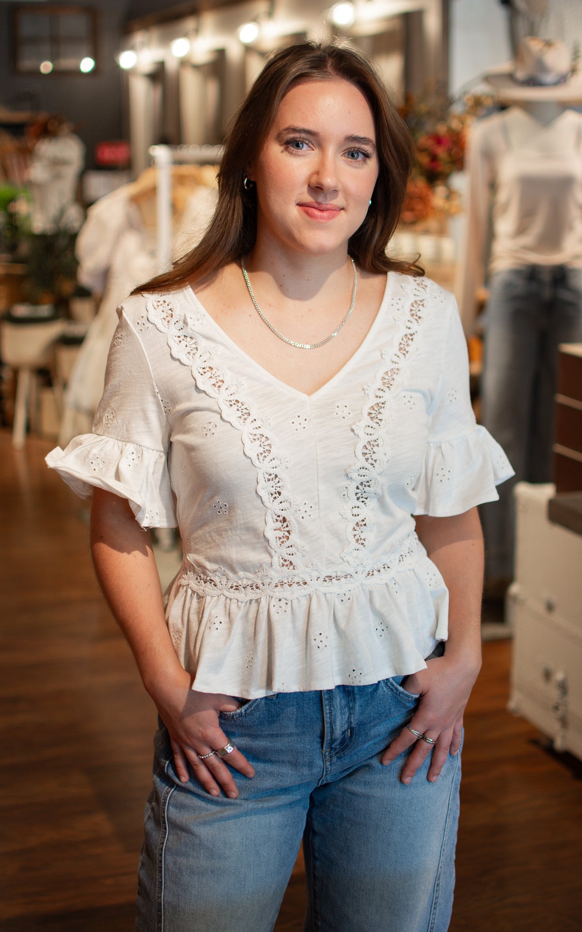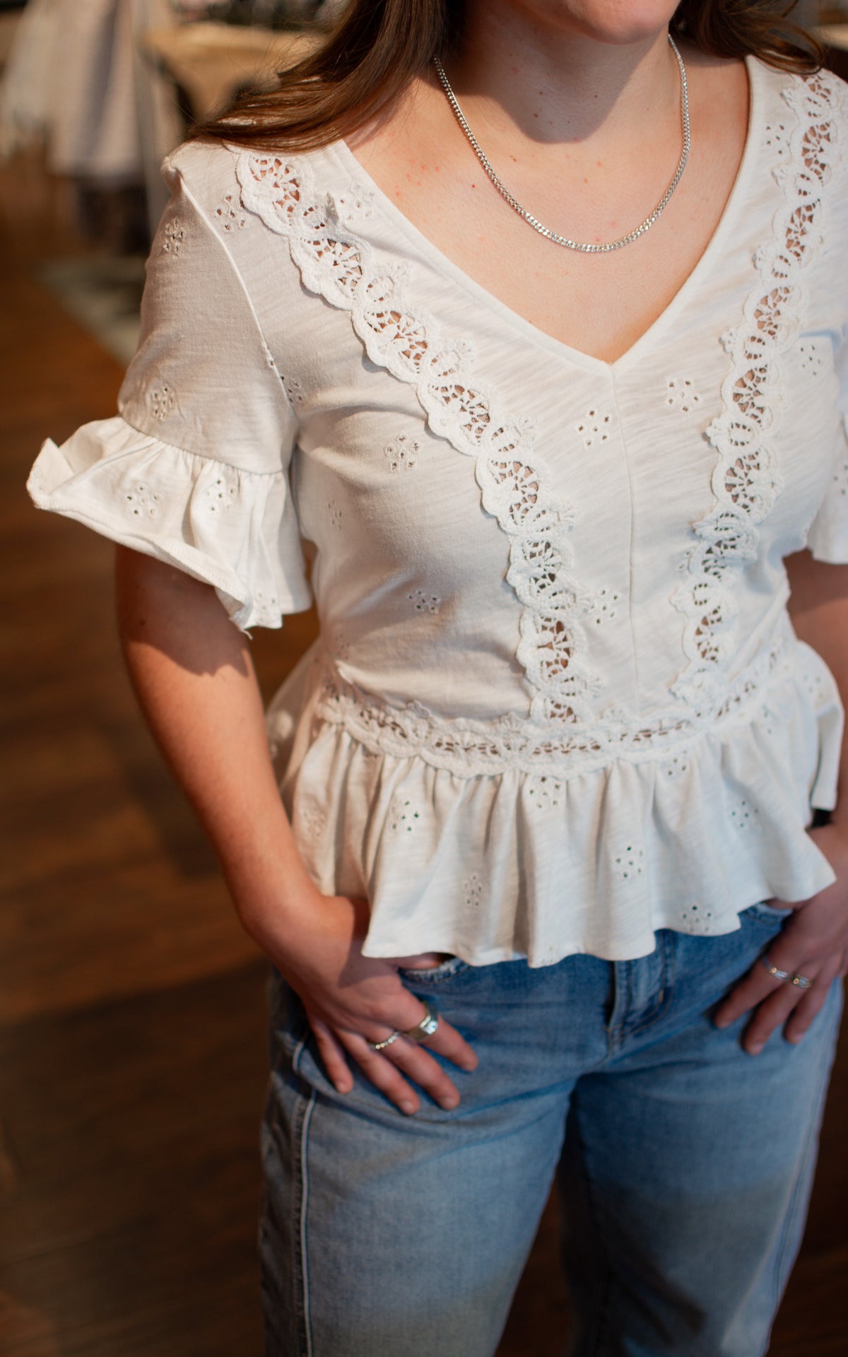Mary's Peplum Top is a knit blouse bursting with lace details and playful frills. Its charming design makes dressing up for any occasion effortless, adding a fun and flirty touch to your wardrobe.