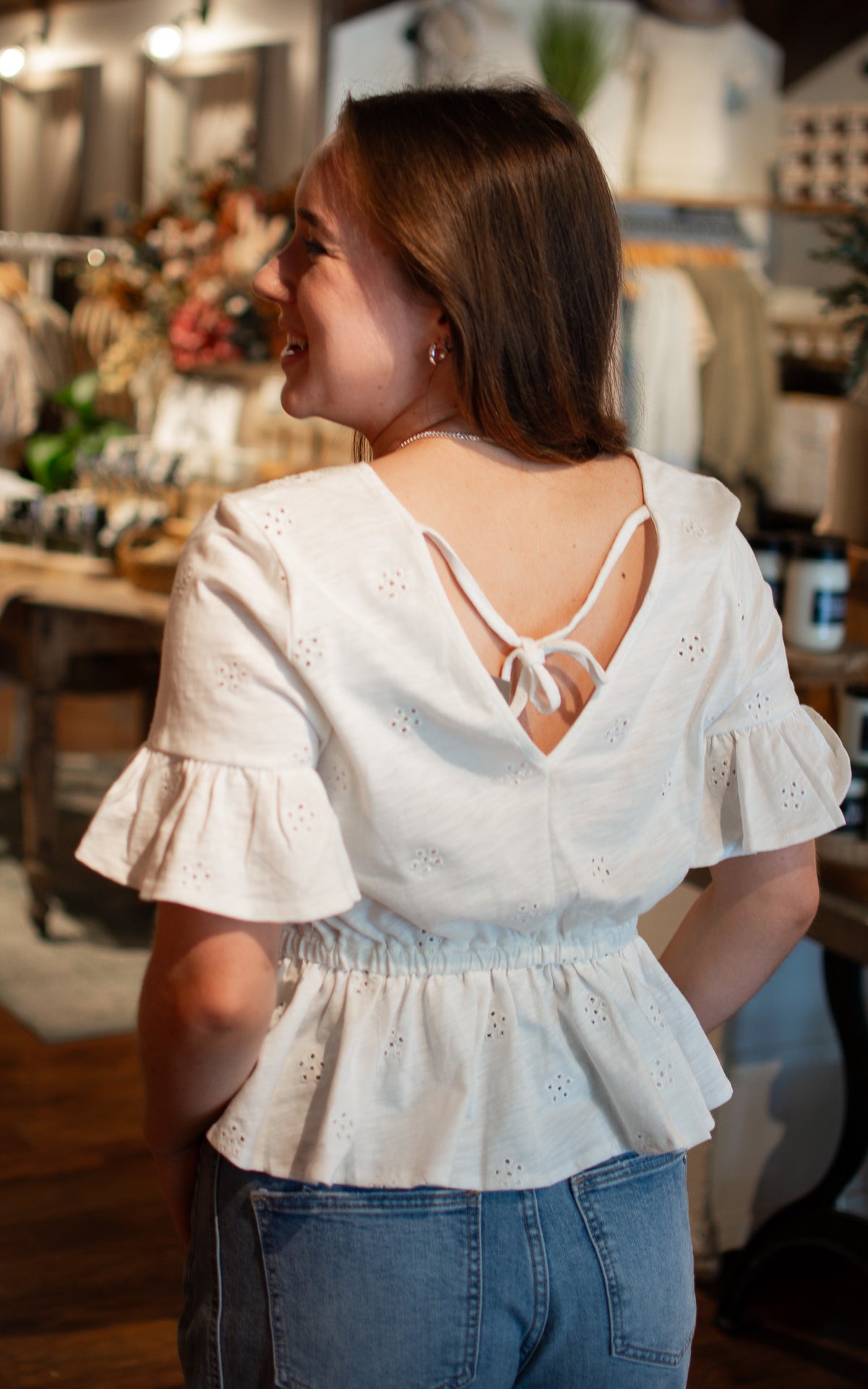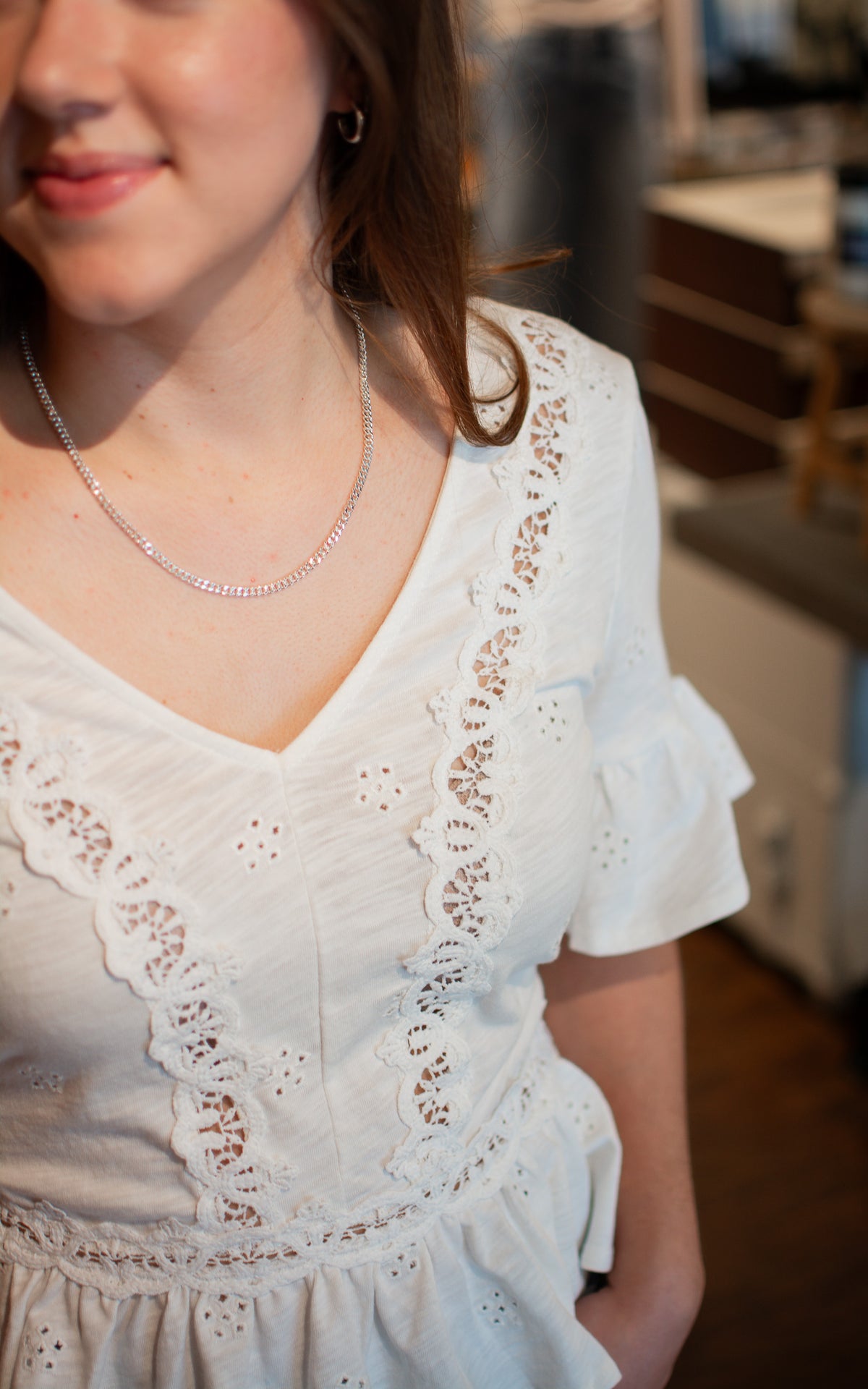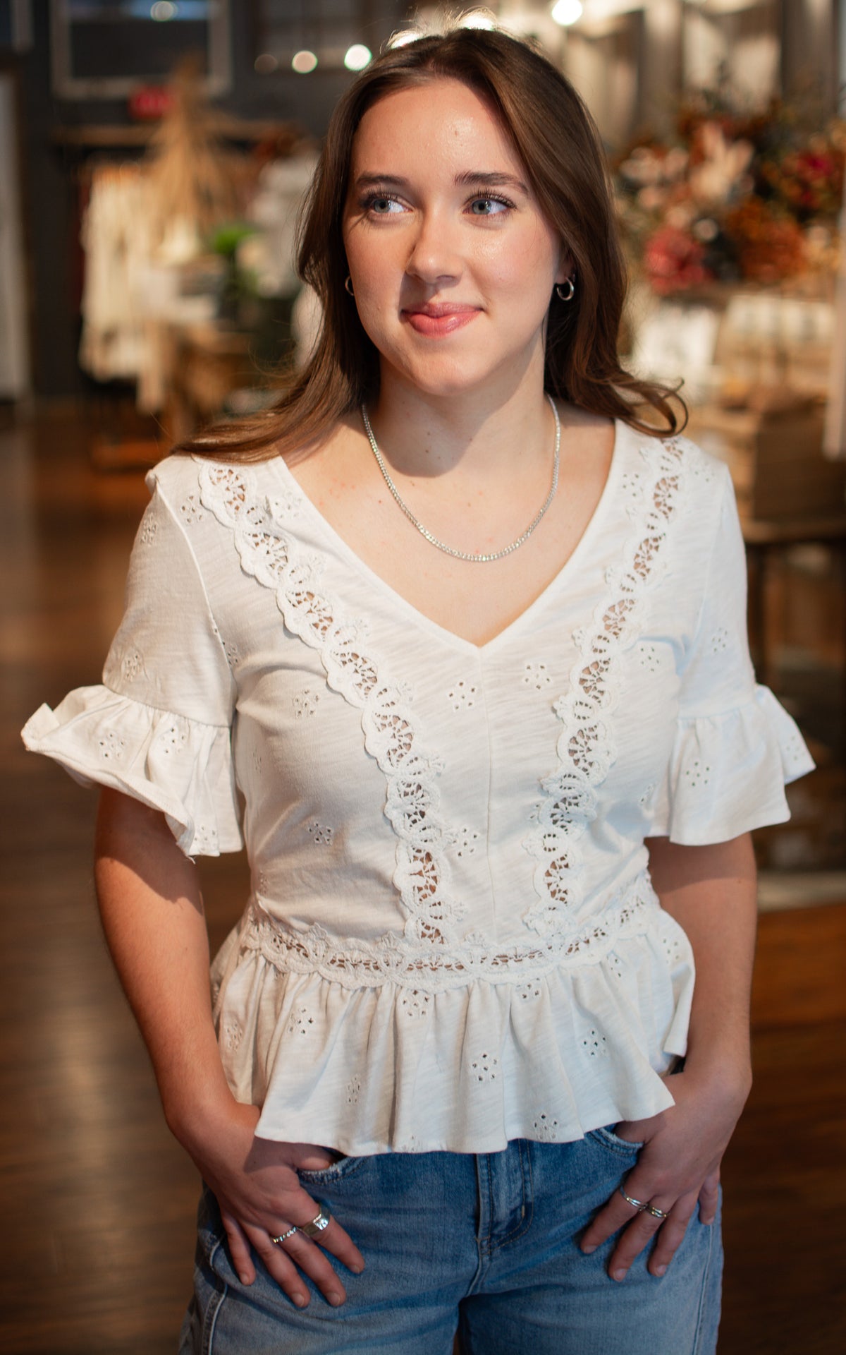 Mary's Peplum Top is a knit blouse bursting with lace details and playful frills. Its charming design makes dressing up for any occasion effortless, adding a fun and flirty touch to your wardrobe.