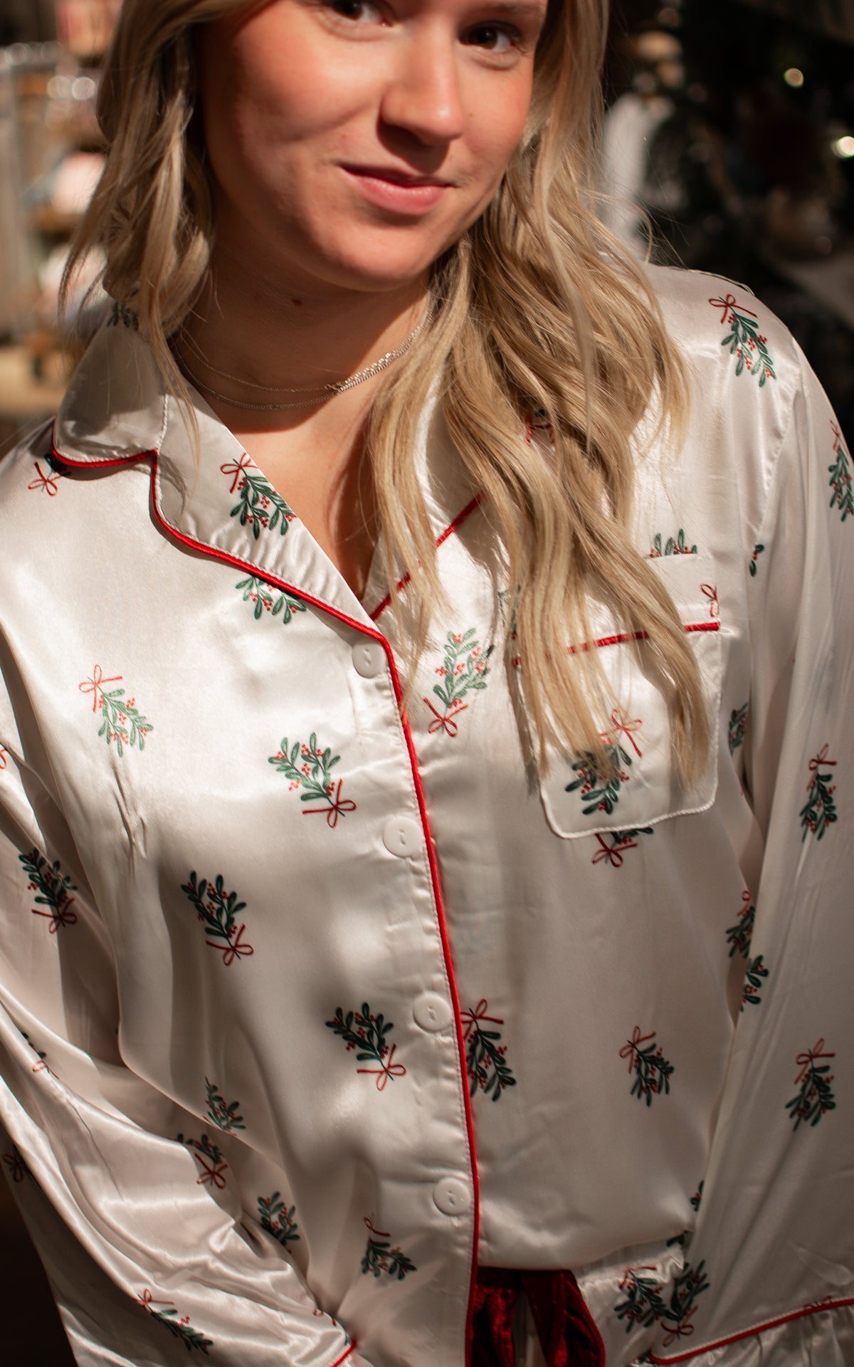 Get festive with this charming white satin pajama set featuring a delicate mistletoe pattern. The matching long shirt and pants create a coordinated look that's both cozy and chic, perfect for holiday nights or any time you want to feel special. The silky satin fabric feels luxurious against your skin while the festive pattern brings joy to your sleepwear rotation. Comfort meets holiday spirit.