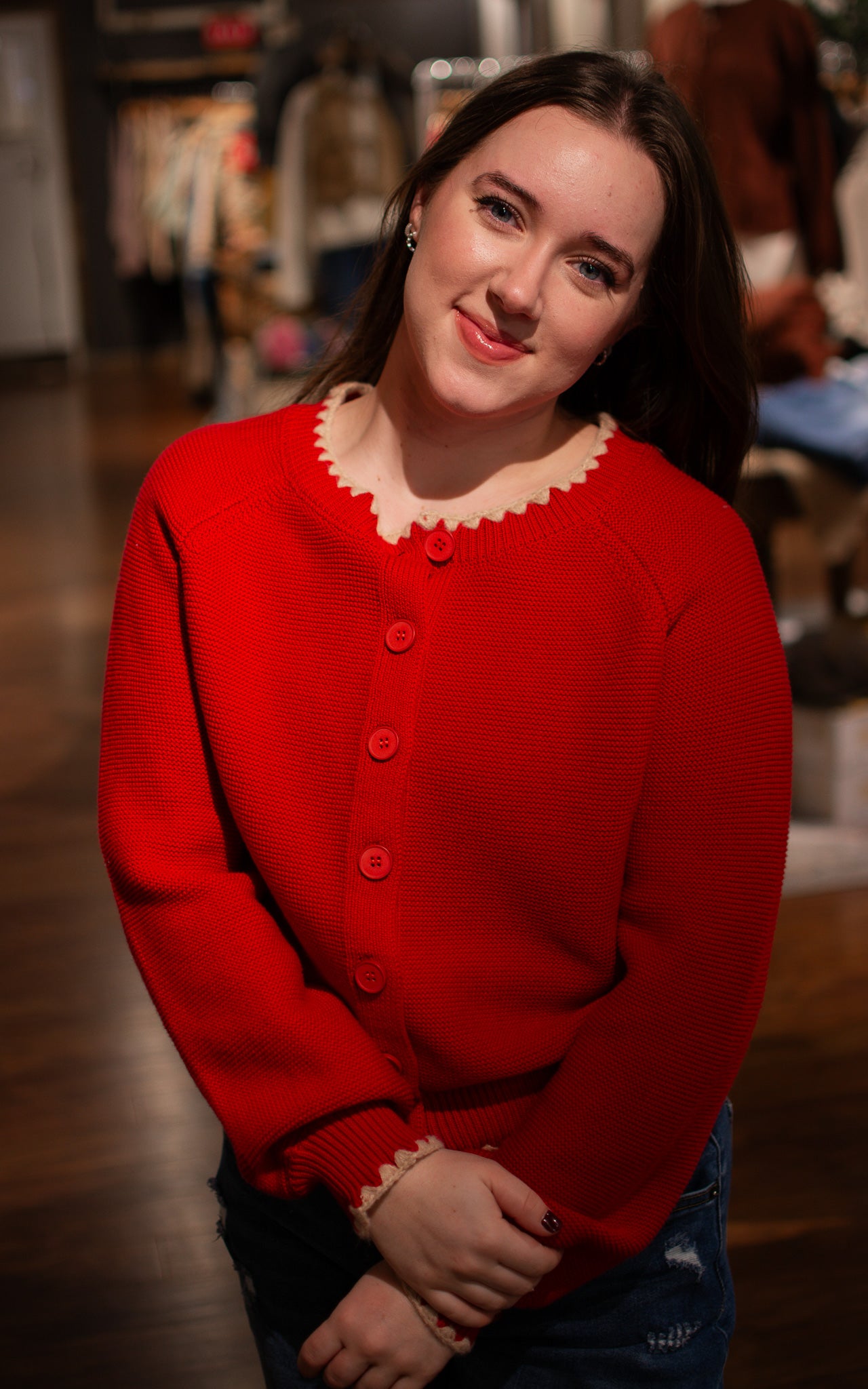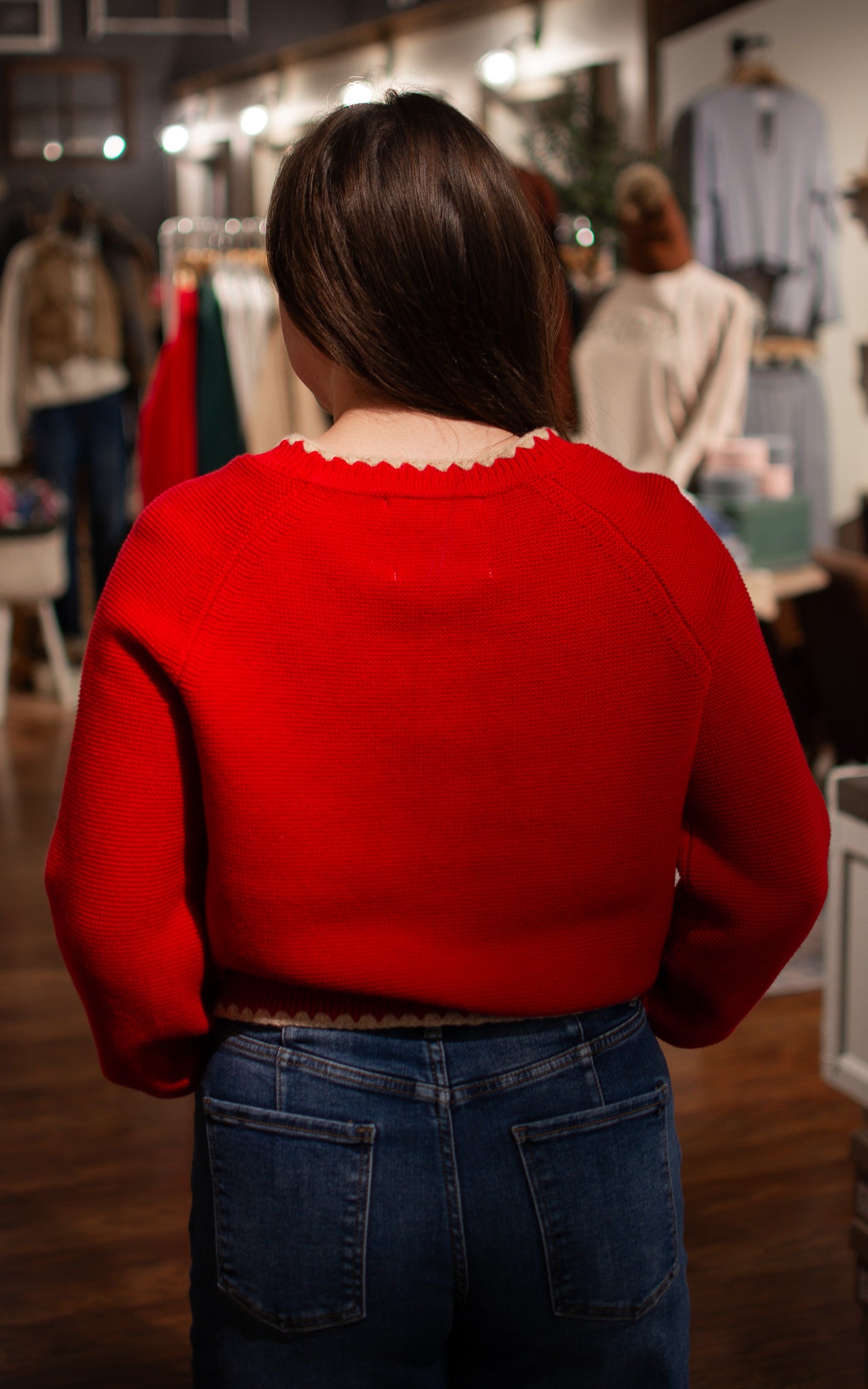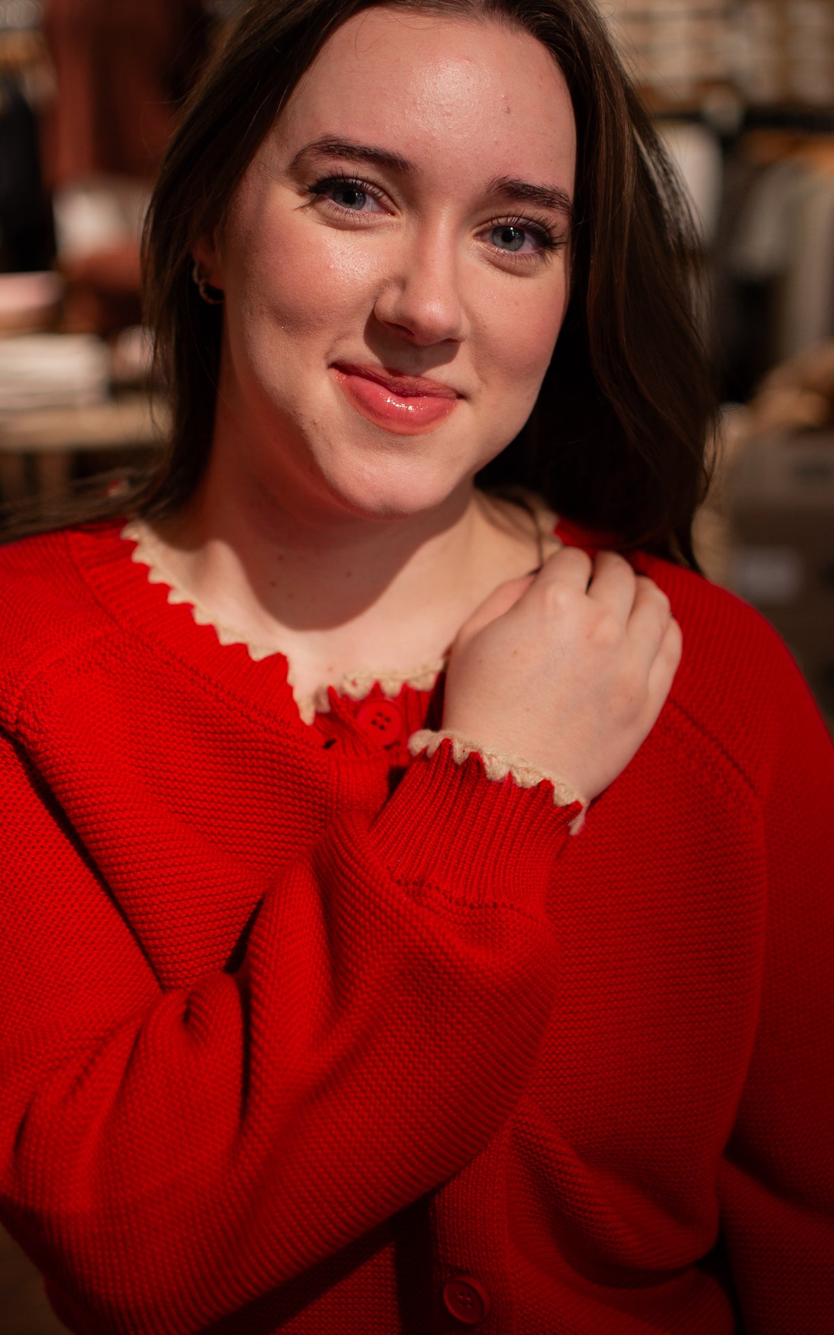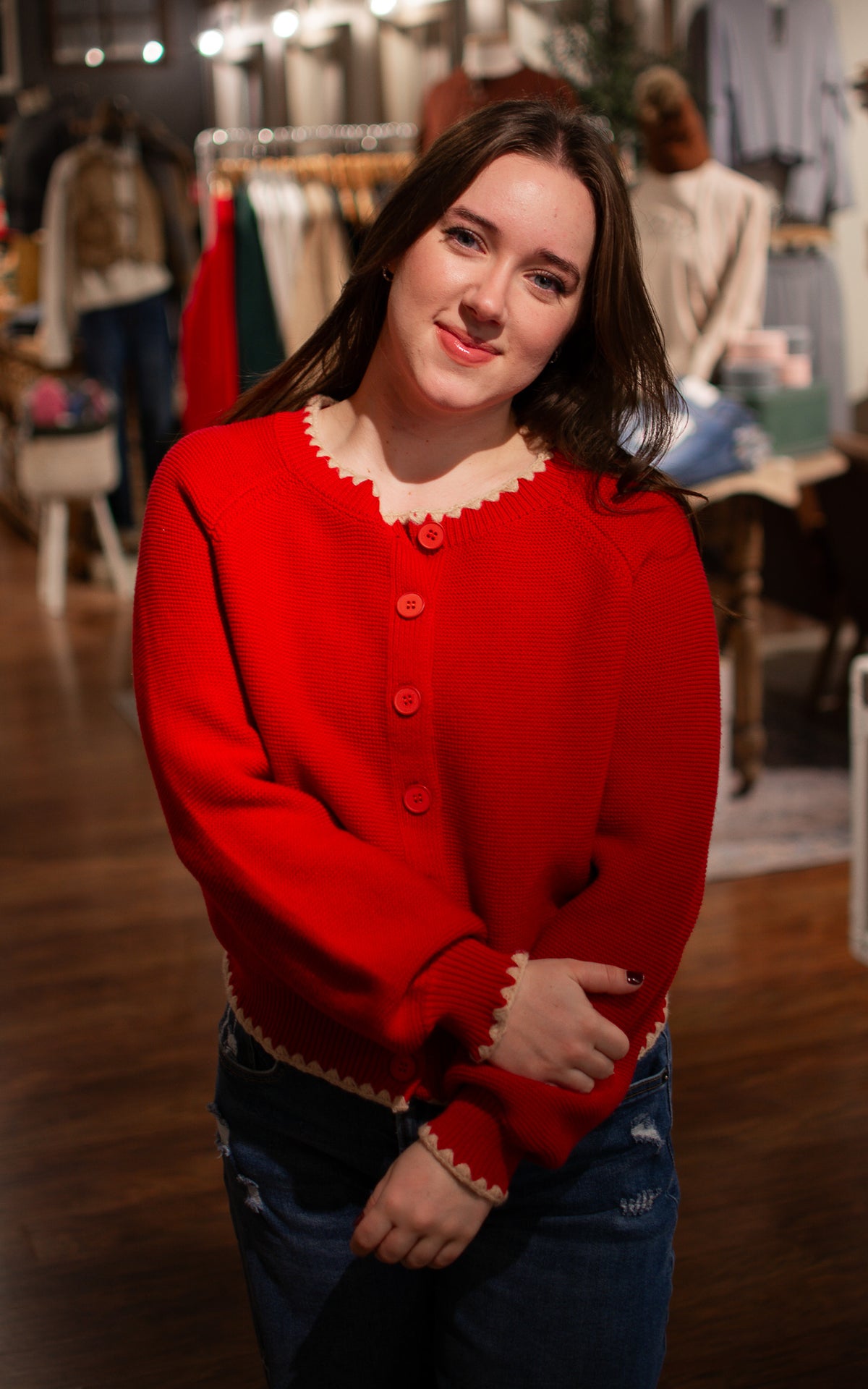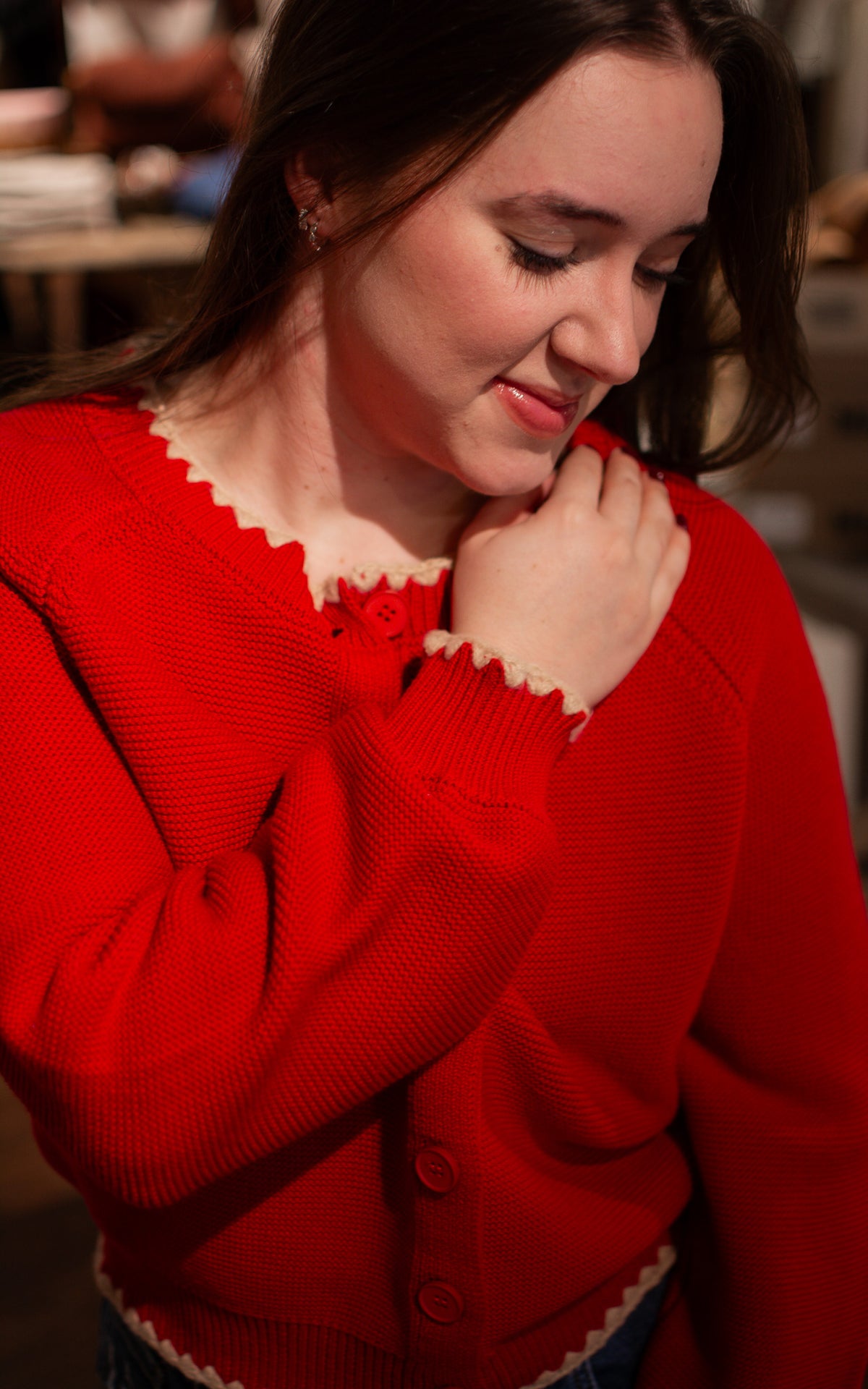 Wrap yourself in holiday charm with this stunning red cardigan featuring delicate white scallop detailing along the neckline and hem. The classic button-front design makes layering effortless, while the playful scalloped trim adds a touch of whimsy and sophistication. Whether you're channeling festive spirit or just love the timeless red-and-white combo, this cardigan is a wardrobe essential that feels both cozy and chic.