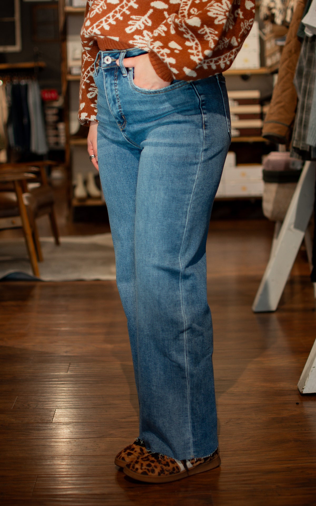 Make a bold statement in the Polynesian Blue Mica Jeans! With a dark wash and high-rise fit, these wide-leg jeans offer a flattering silhouette that’s equal parts cool and comfortable. The raw hem adds a touch of edge, perfect for a playful, laid-back look that stands out wherever you go.