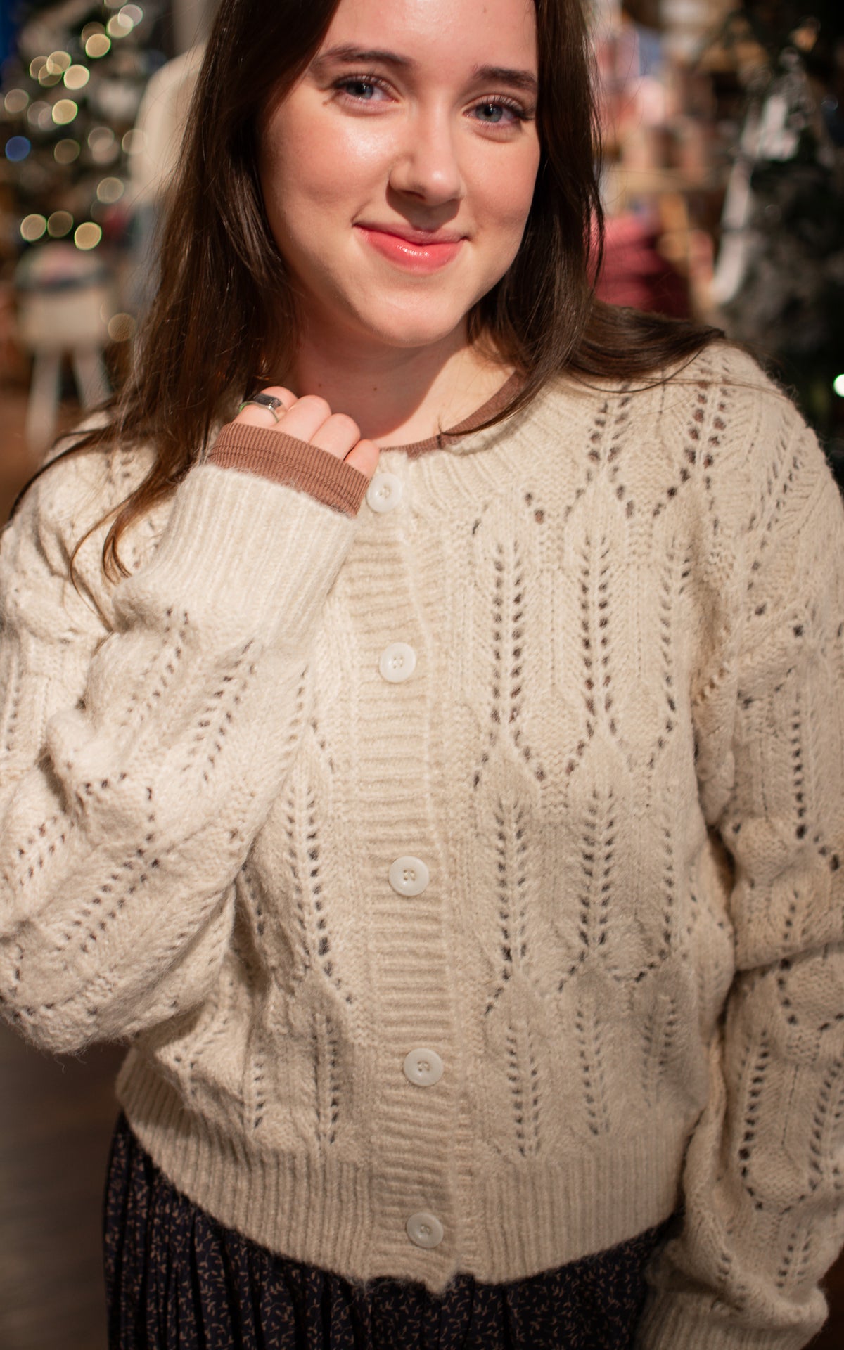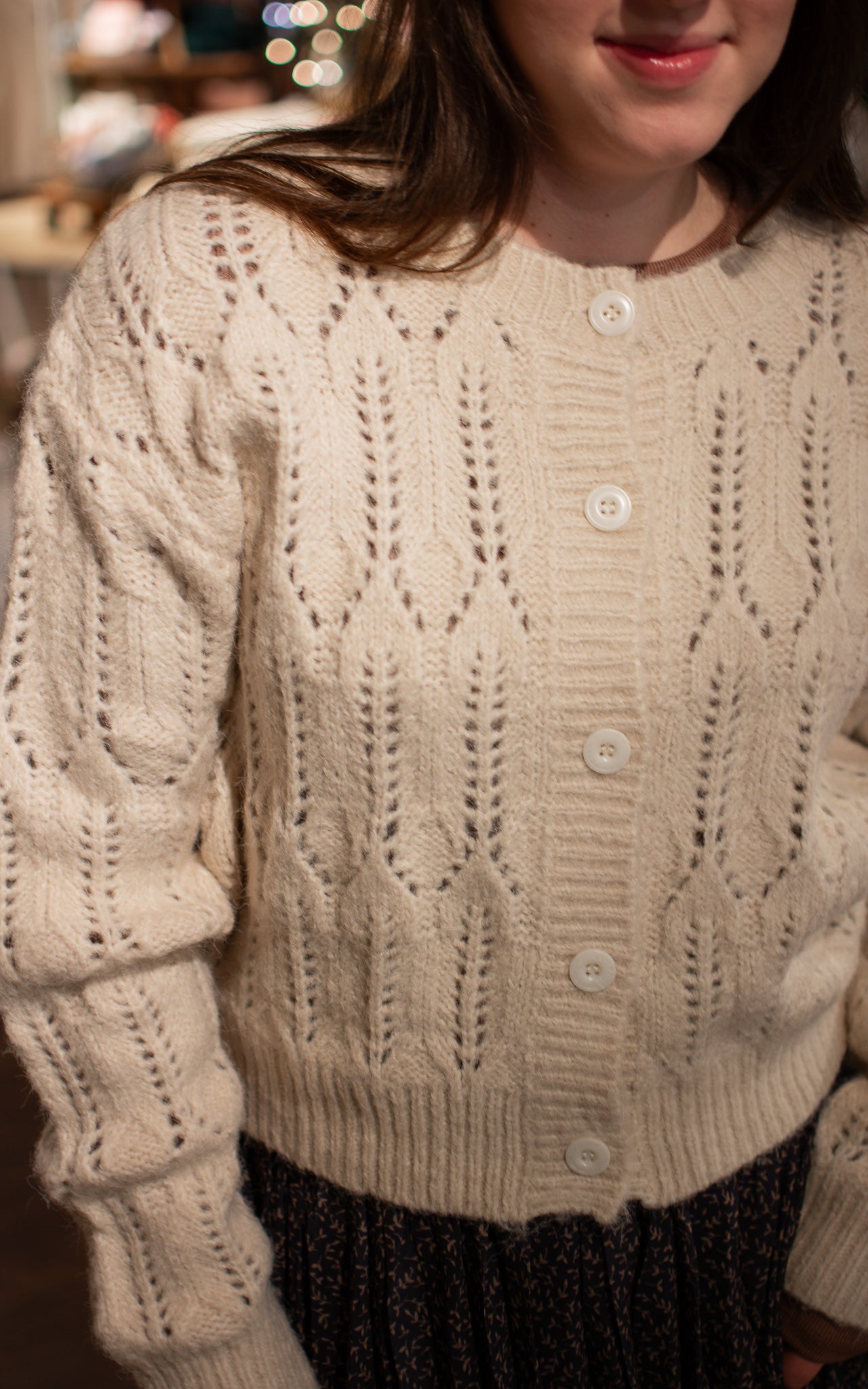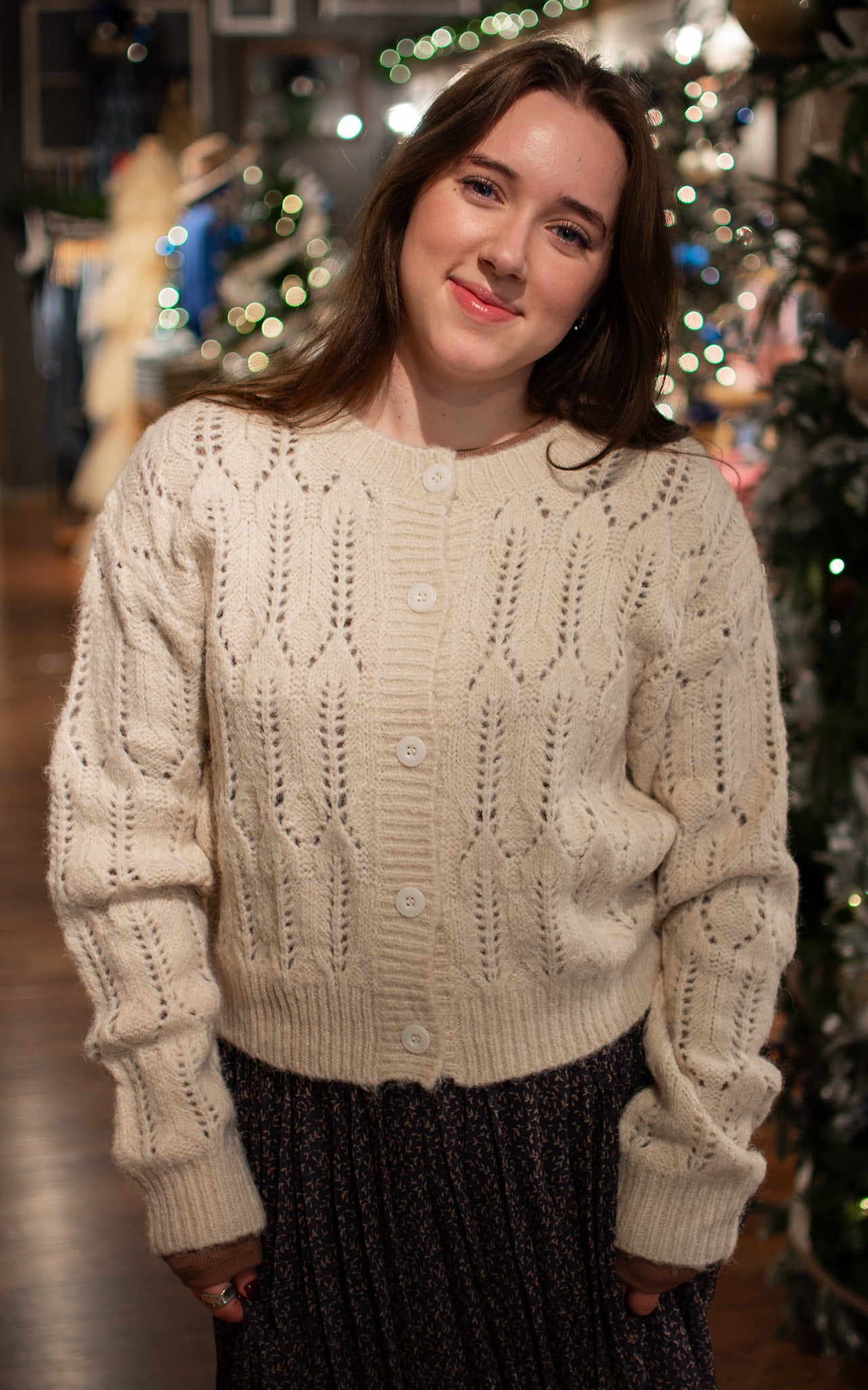 Wrap yourself in understated elegance with this beige cardigan featuring a beautiful patterned knit. The classic button closure keeps things timeless while the intricate texture adds visual interest and depth. Soft, versatile, and endlessly layerable, this piece transitions seamlessly from season to season. Throw it over anything and instantly elevate your look.