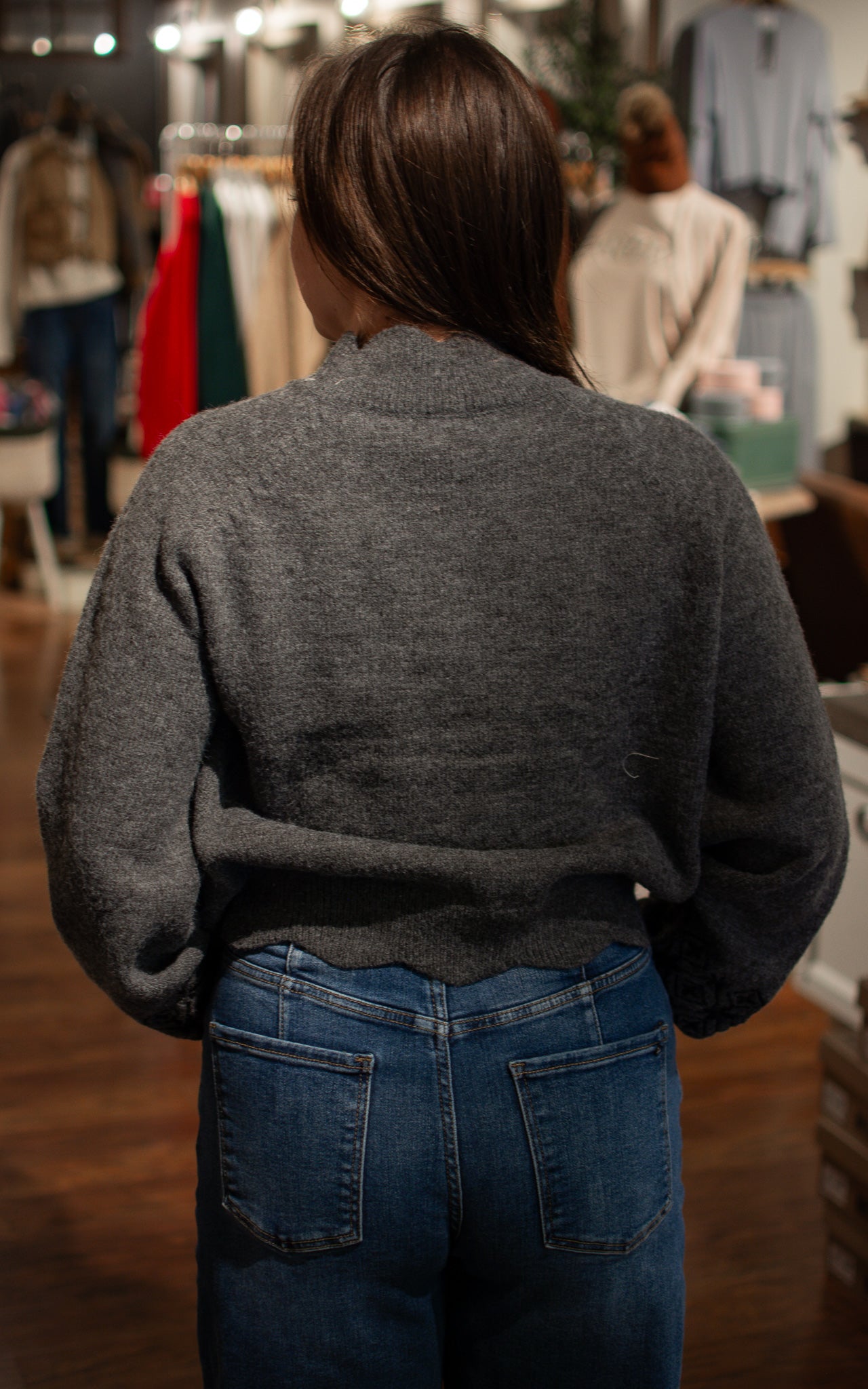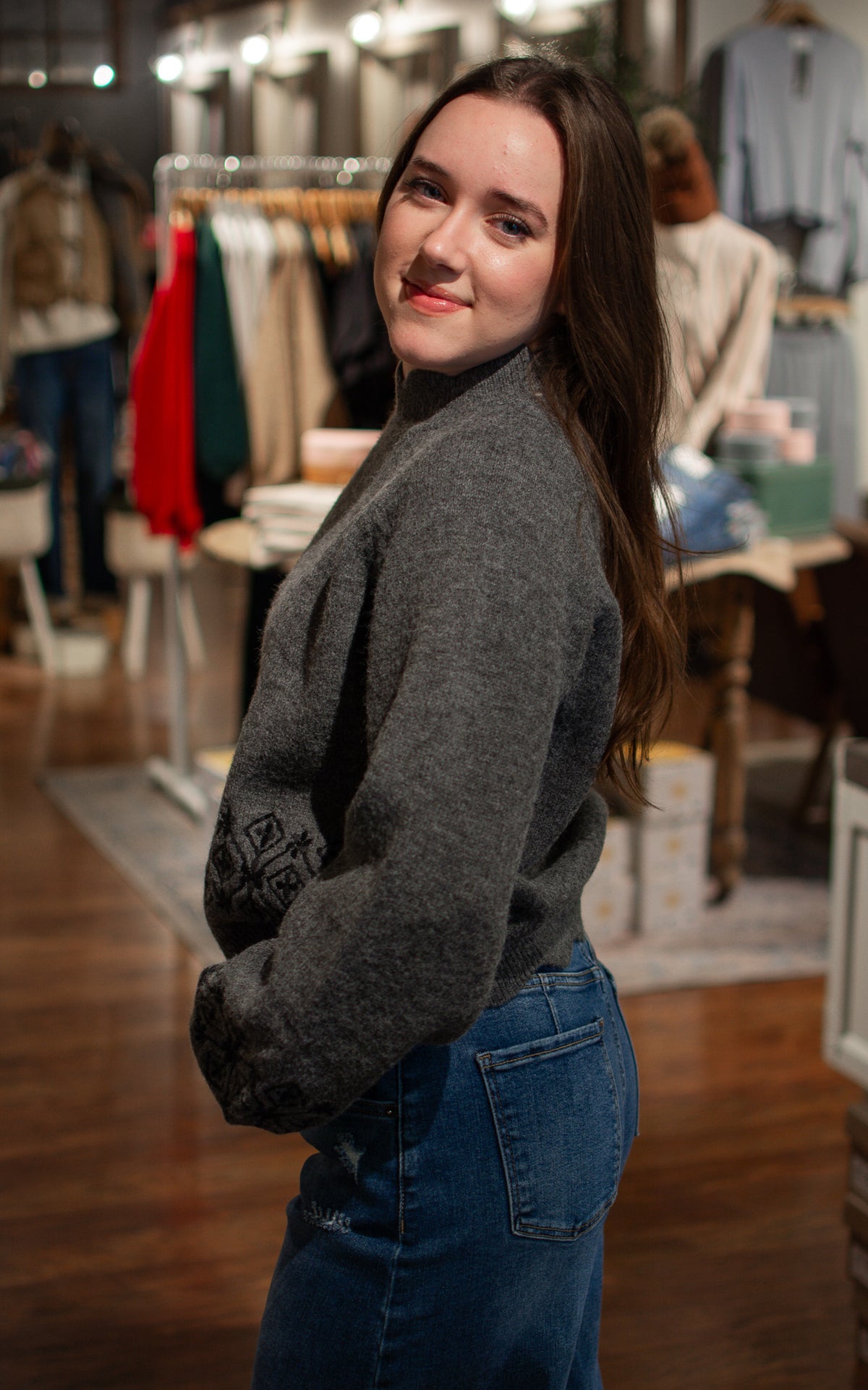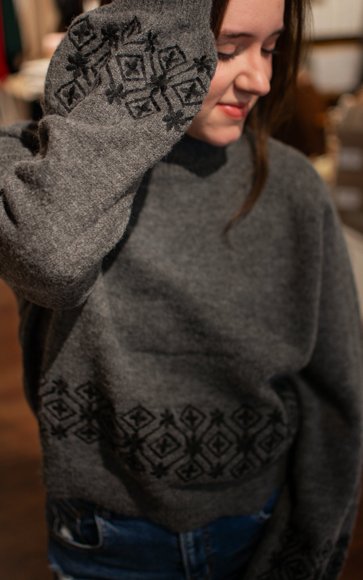 Bring understated elegance to your wardrobe with this dark grey sweater featuring intricate black embroidery that adds artisanal charm. The delicate scalloped neckline frames your face beautifully while keeping things refined and playfully feminine. Sophisticated yet approachable, this piece proves that sometimes the best details are the ones that whisper rather than shout—perfect for anyone who loves a little handcrafted magic in their everyday style.