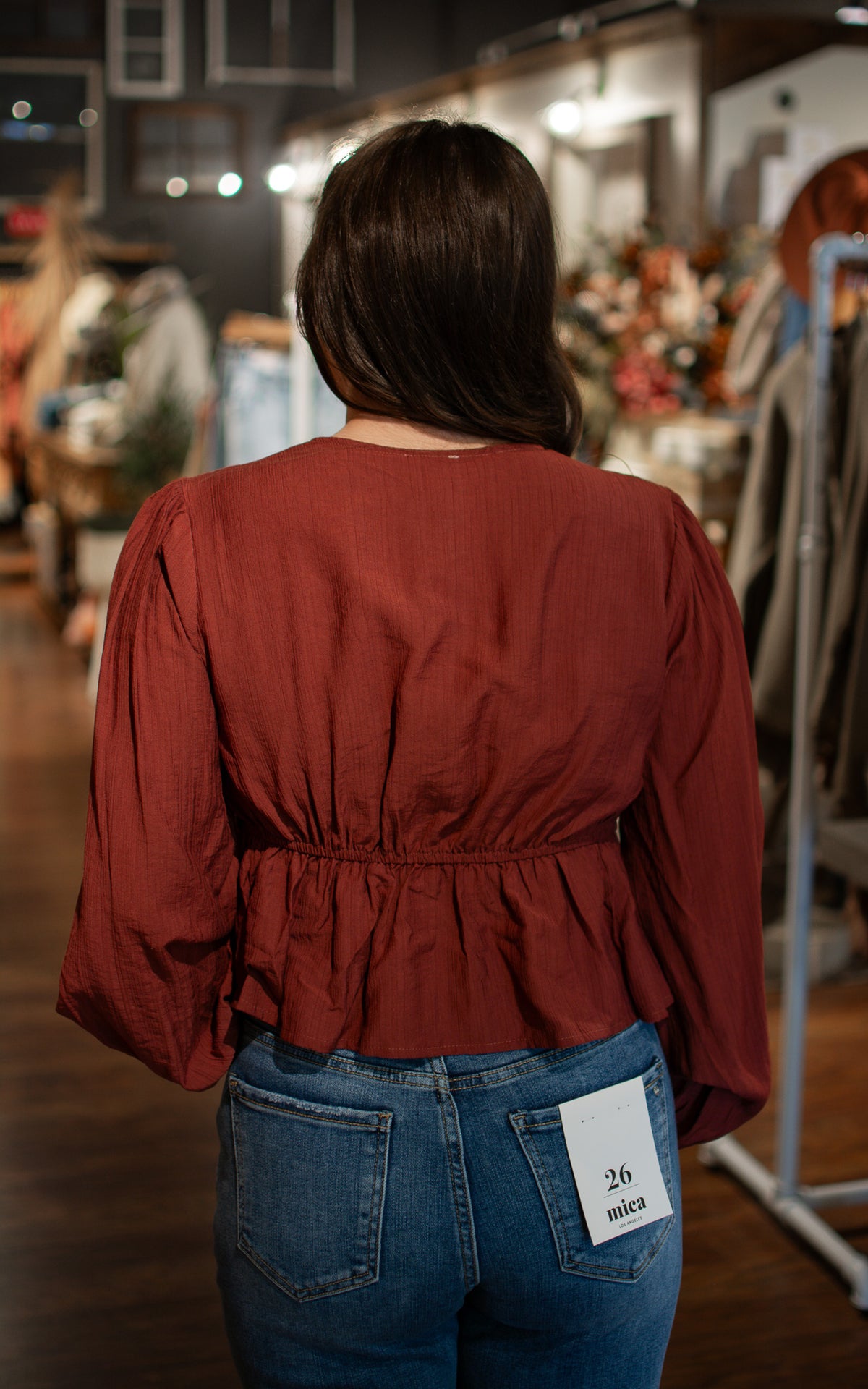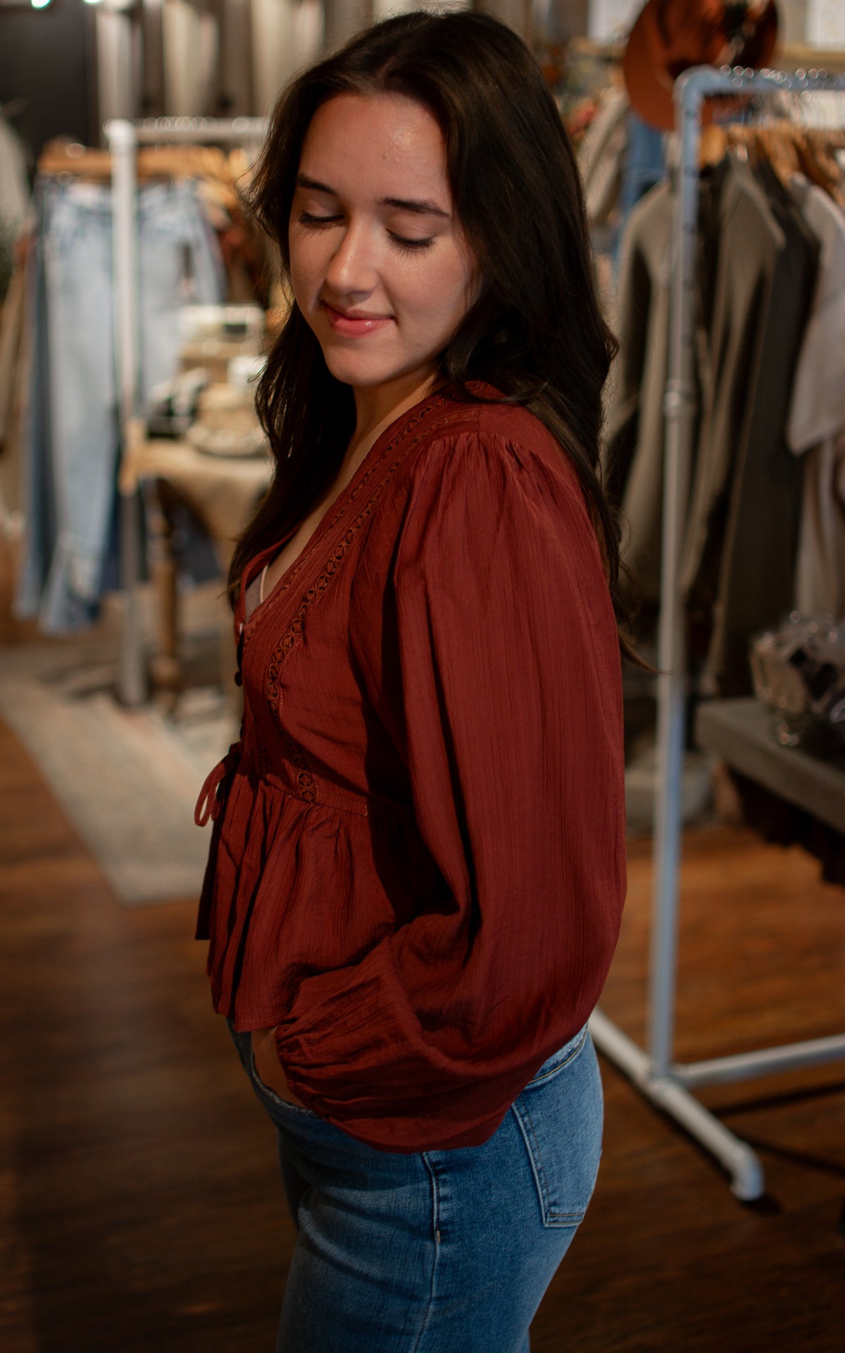 Turn heads in the Rusty Relica Blouse! This playful rust red top features a charming tie detail and a flattering V-neck that adds a touch of flirty fun. With a classic button closure, it’s perfect for mixing casual comfort with stylish flair wherever you go.