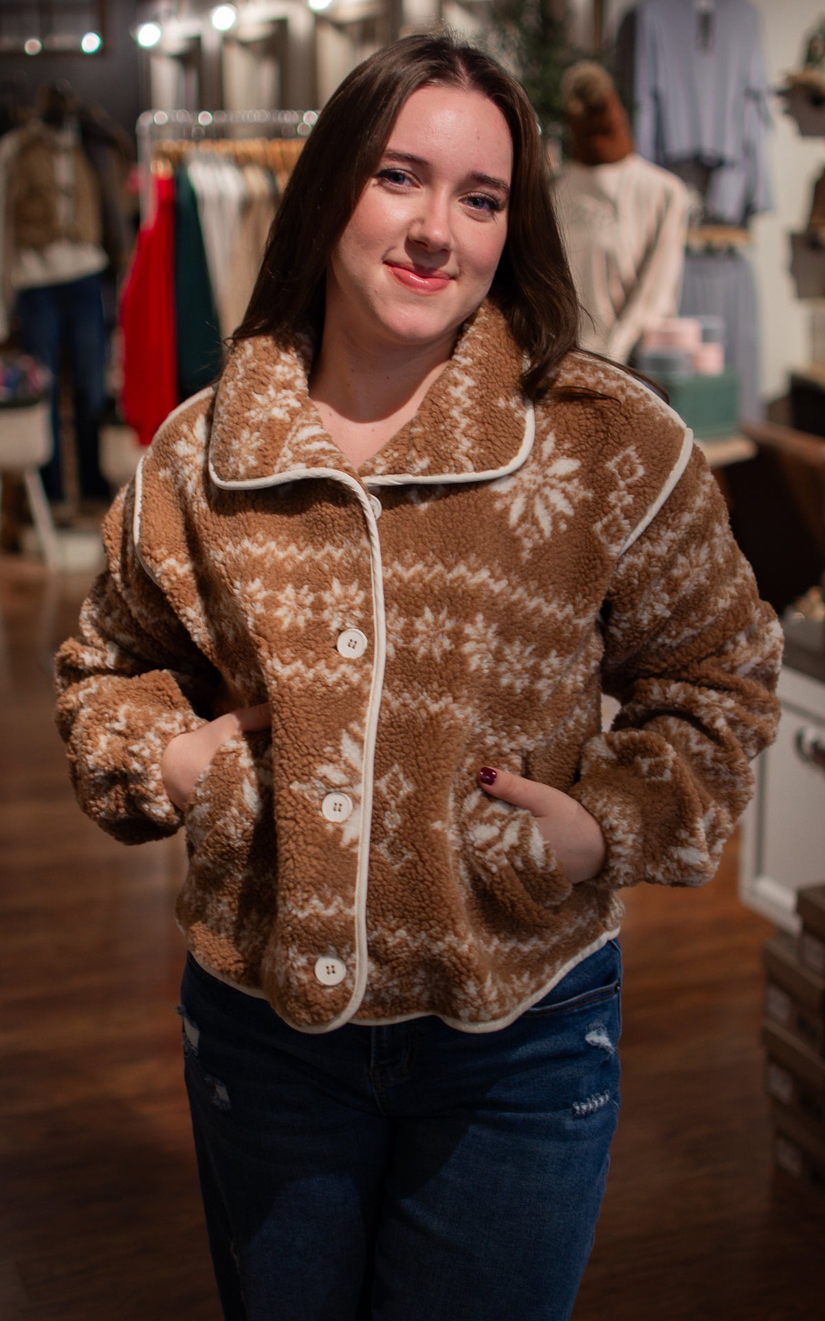 Wrap yourself in ultimate coziness with this irresistible caramel and cream sherpa jacket that feels like a warm blanket you can wear. The plush sherpa lining provides serious comfort while the button closure makes it easy to adjust your warmth throughout the day. Perfect for layering over anything or wearing solo on mild days, this jacket brings playful comfort and effortless style to your outerwear rotation—your new favorite piece for staying snug and looking great.