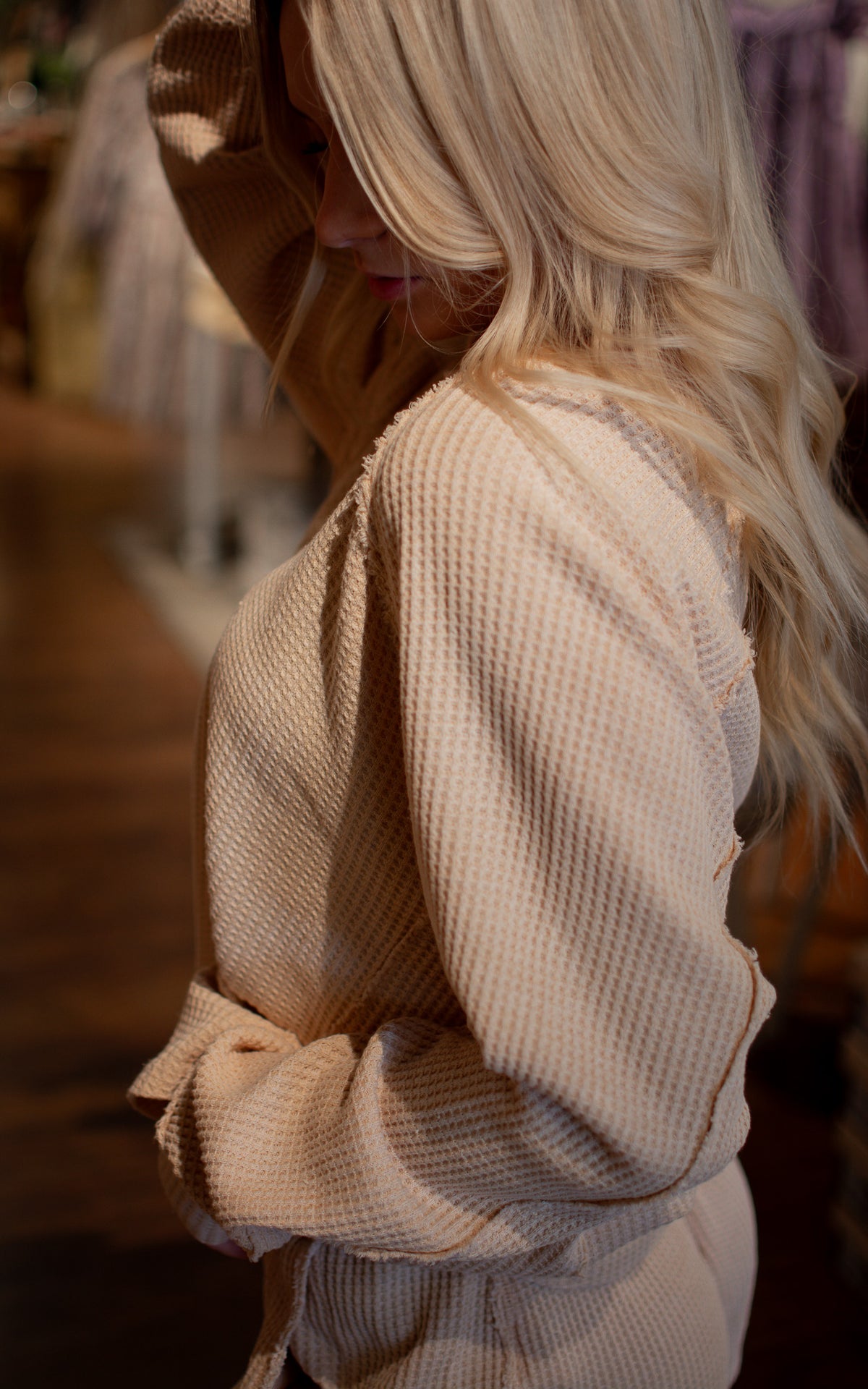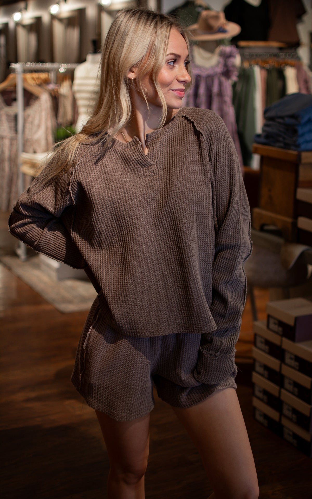 Cozy up in our Slow Morning Waffle Lounge Set. Made with thick waffle material, this set includes both short and long sleeve tops and deep pockets. Perfect for those lazy, loungey days.