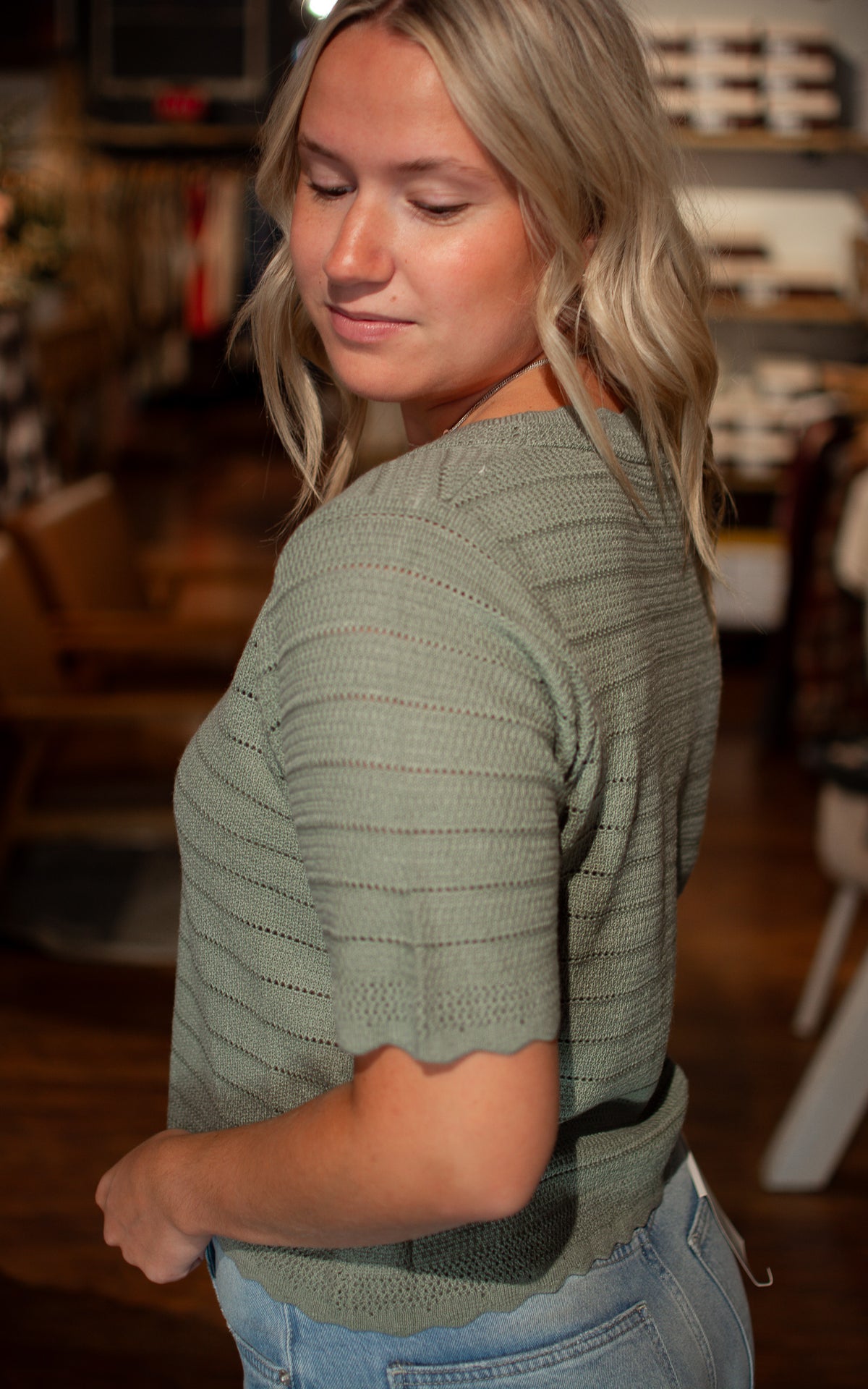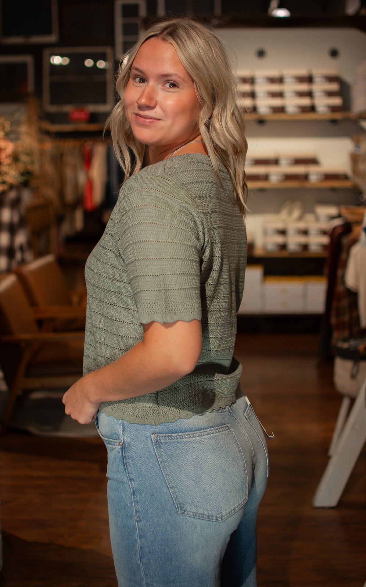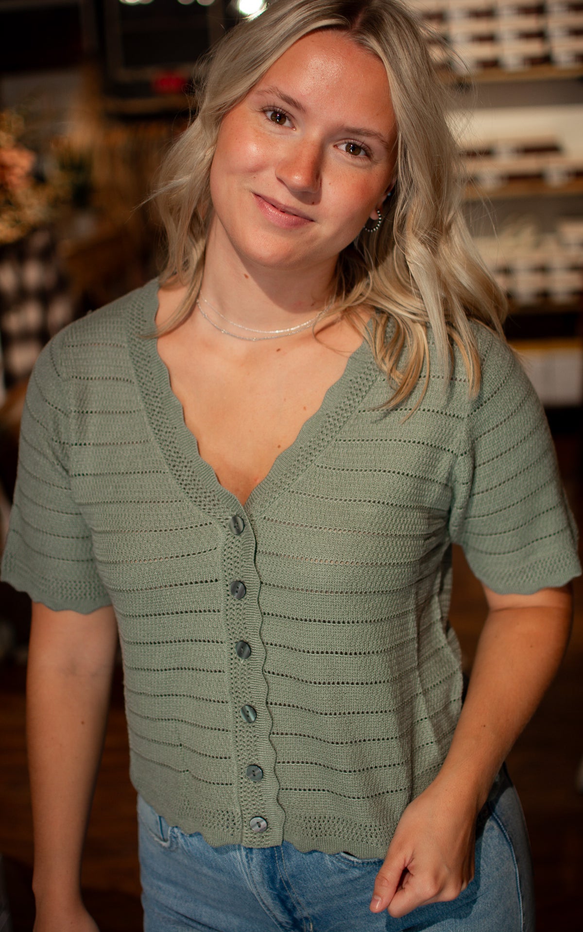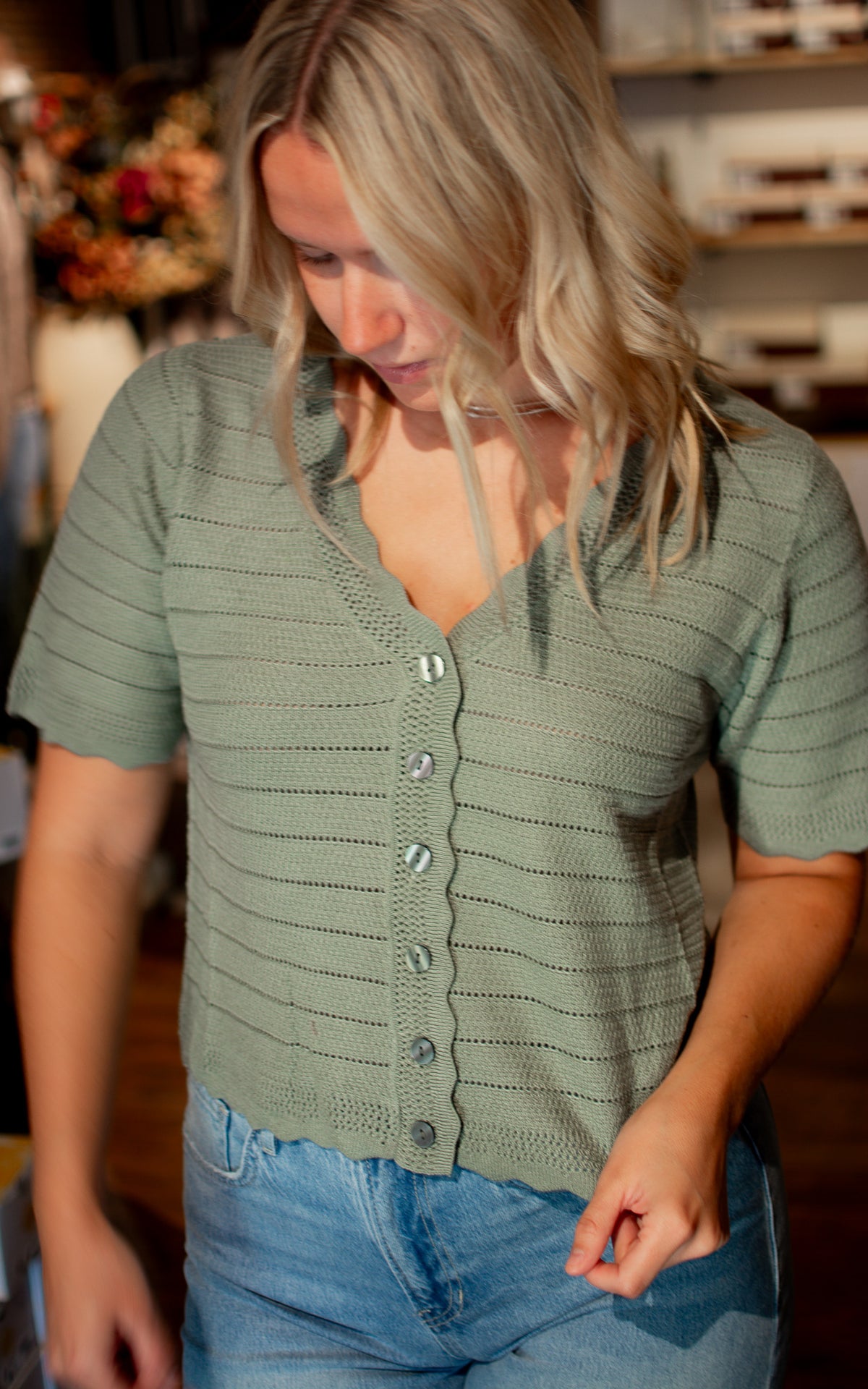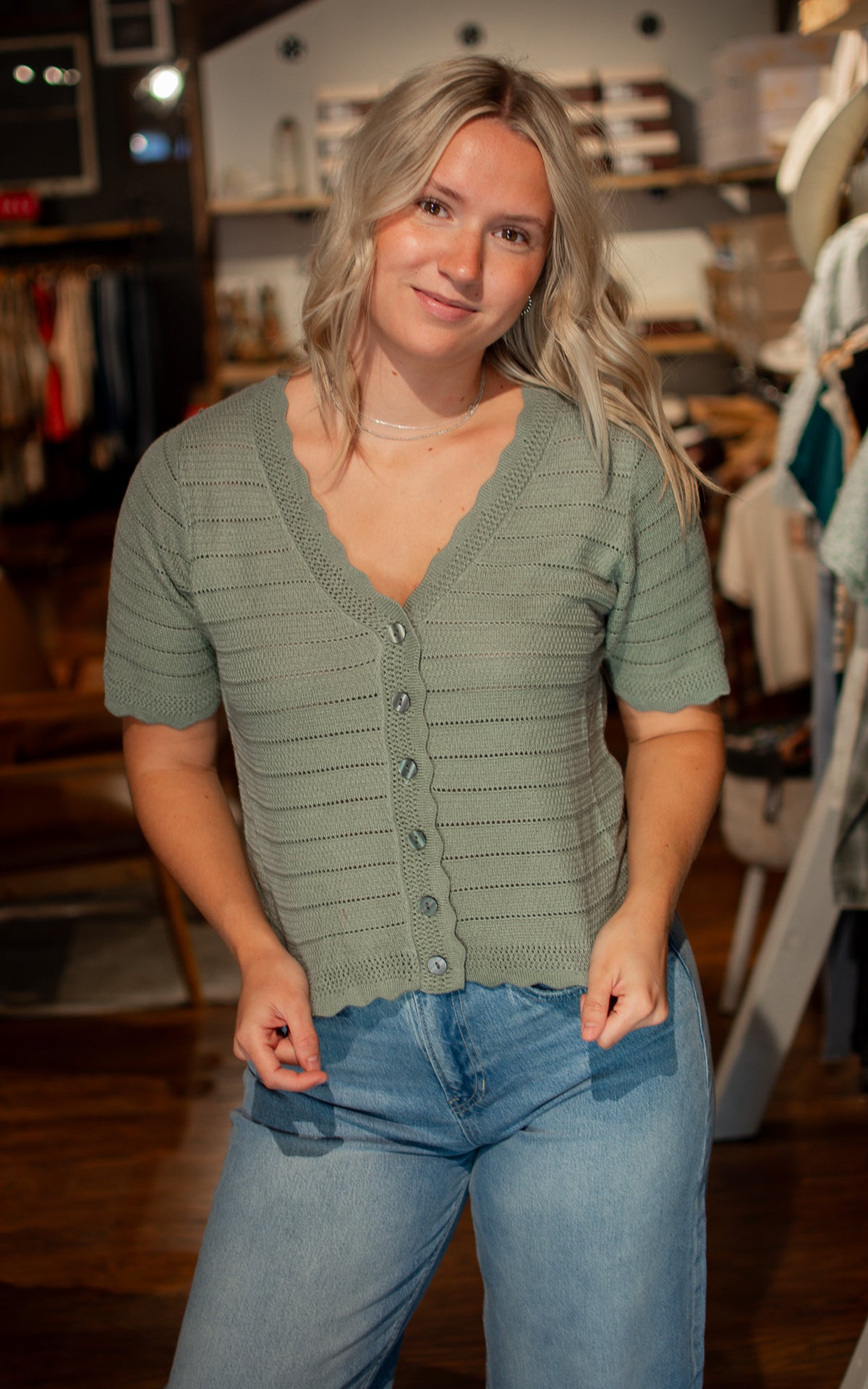Freshen up your wardrobe with the Sweet Mint Cardigan Top. This playful piece features a scalloped V-neckline and charming button closure, making it the perfect light layer to brighten any outfit with a touch of fun.