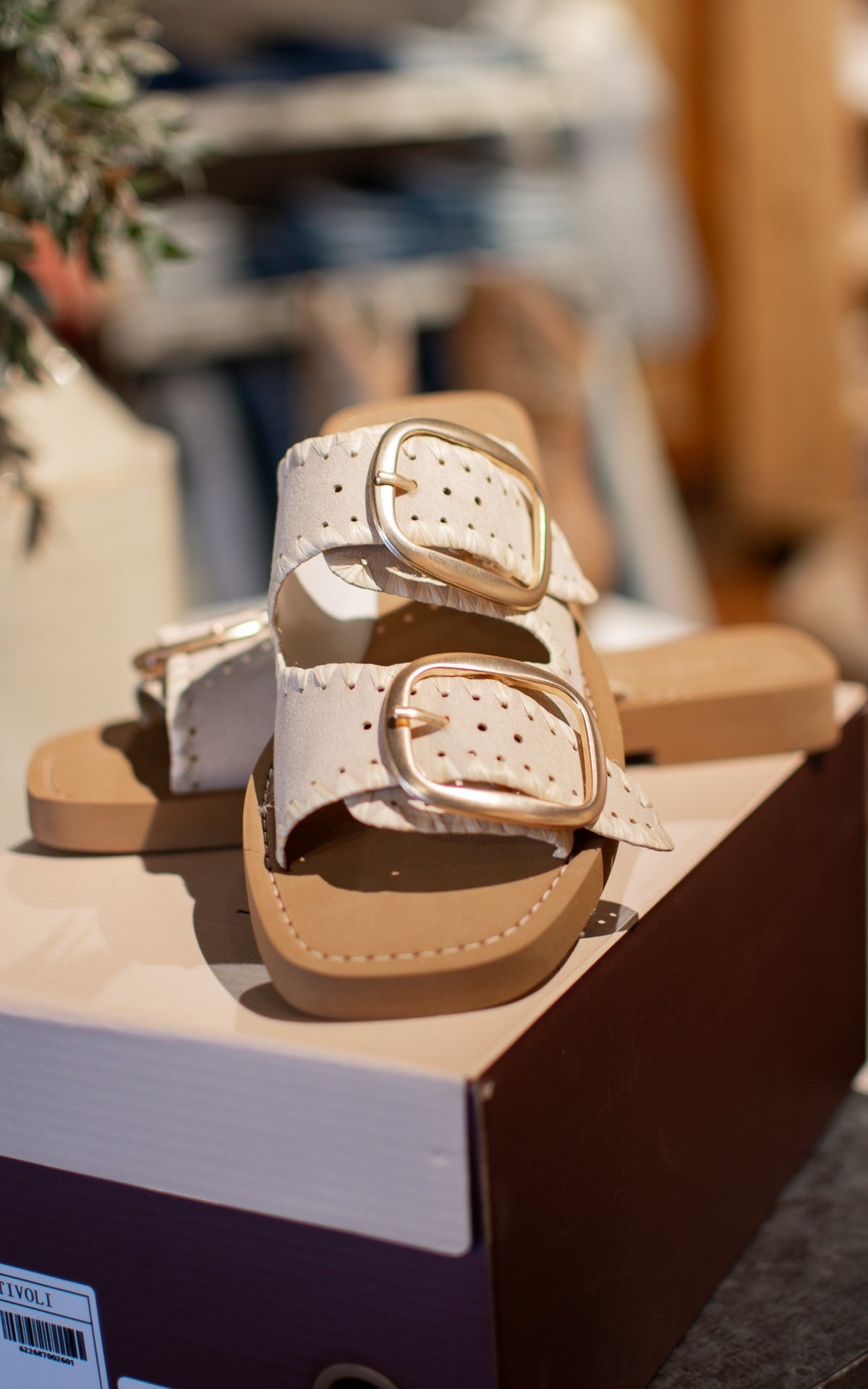 The Tivoli Double Buckle Sandals in a soft oat shade feature a cute design with double buckles for a playful yet stylish look. Perfect for sunny days, they offer comfort and charm to complete any casual outfit.