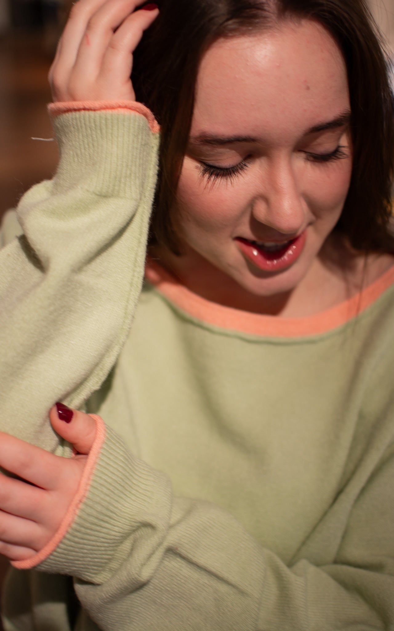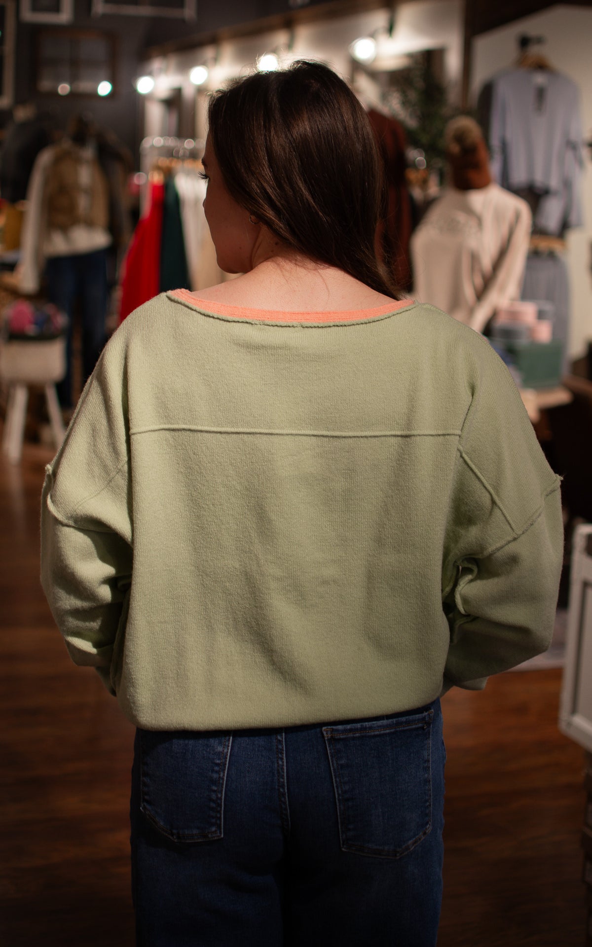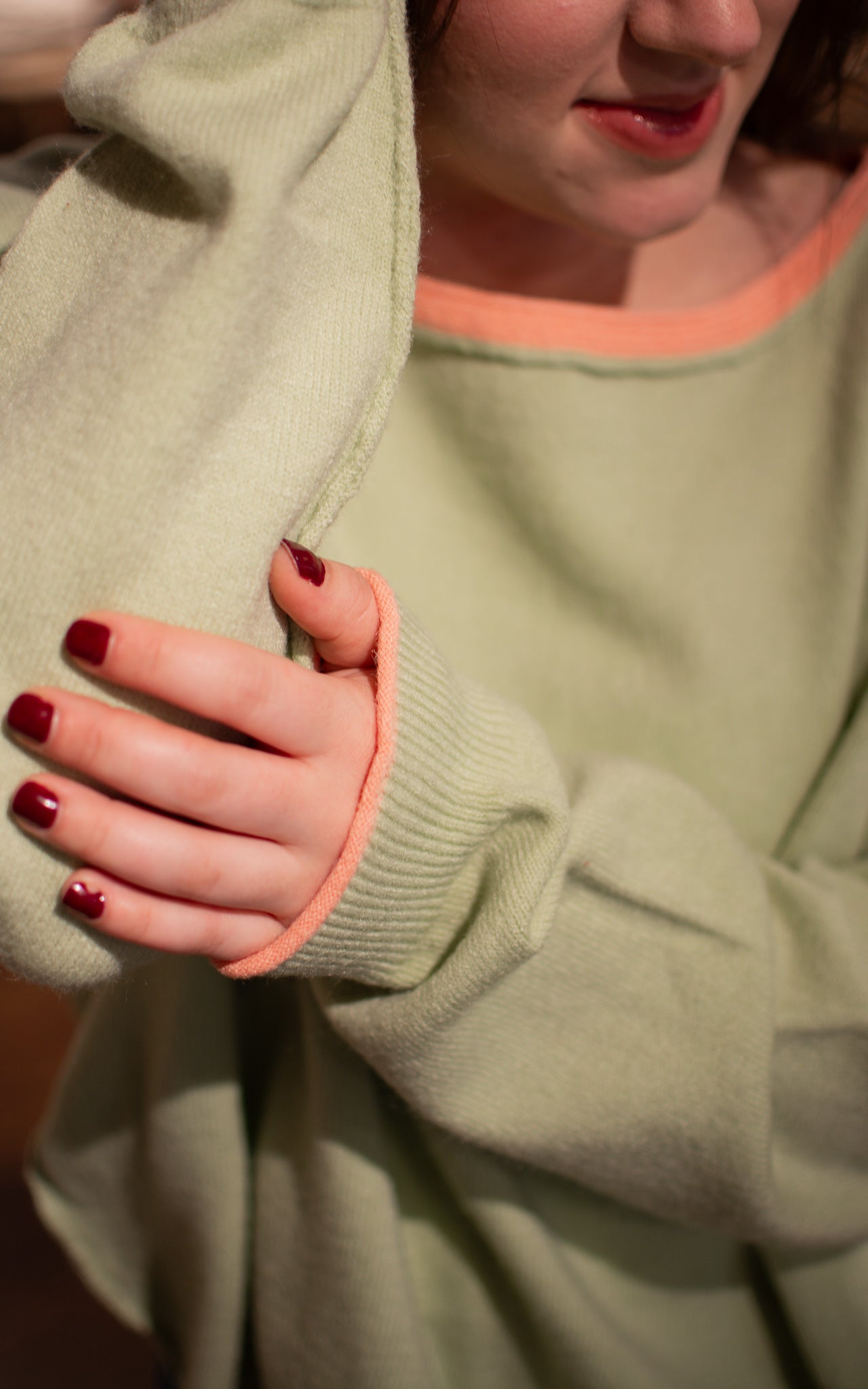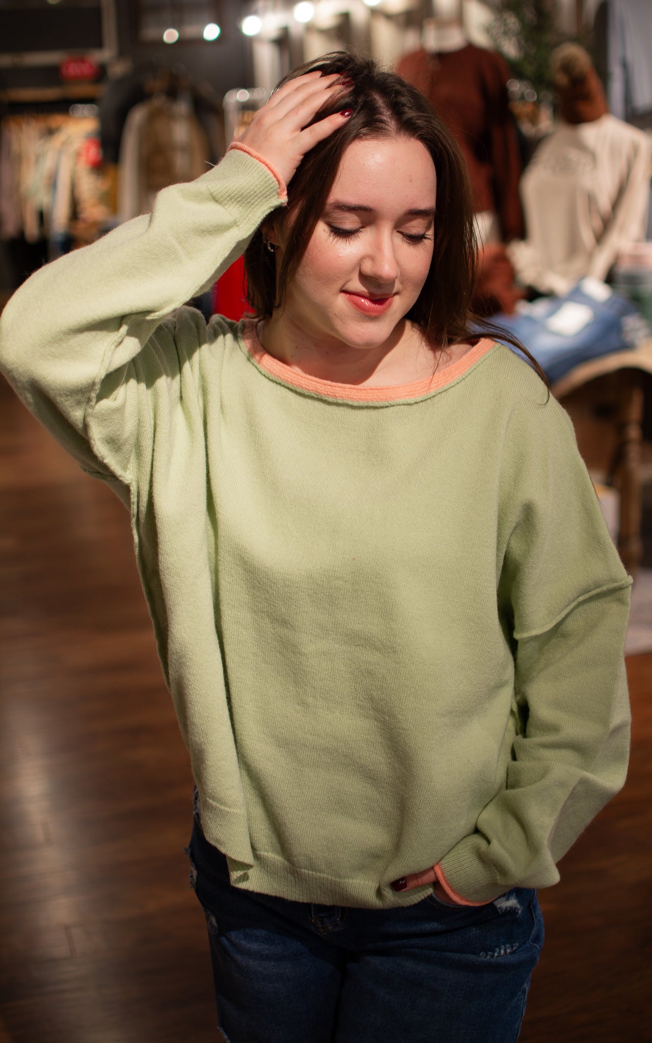Make a bold statement with this eye-catching sweater featuring a vibrant bright green base accented with coral trim at the neckline and hem. The classic boat neck silhouette offers a timeless, flattering fit that works for both casual hangouts and dressed-up occasions. The playful color-blocking creates a fun, modern vibe that's impossible to ignore—perfect for anyone ready to stand out and have a little style fun.