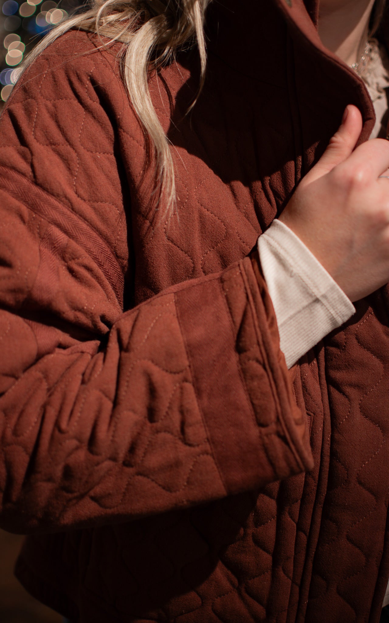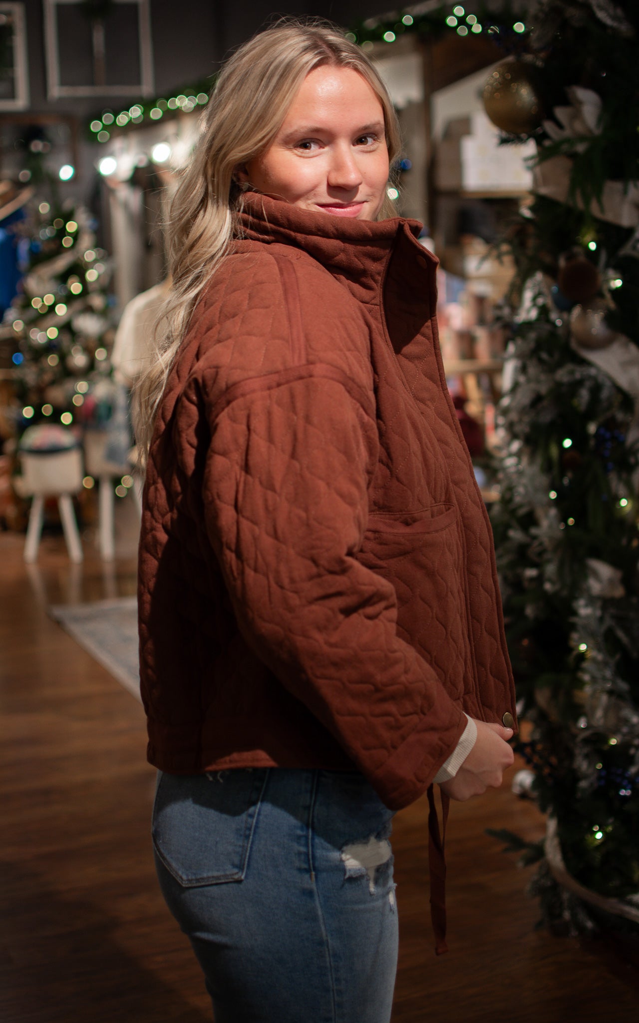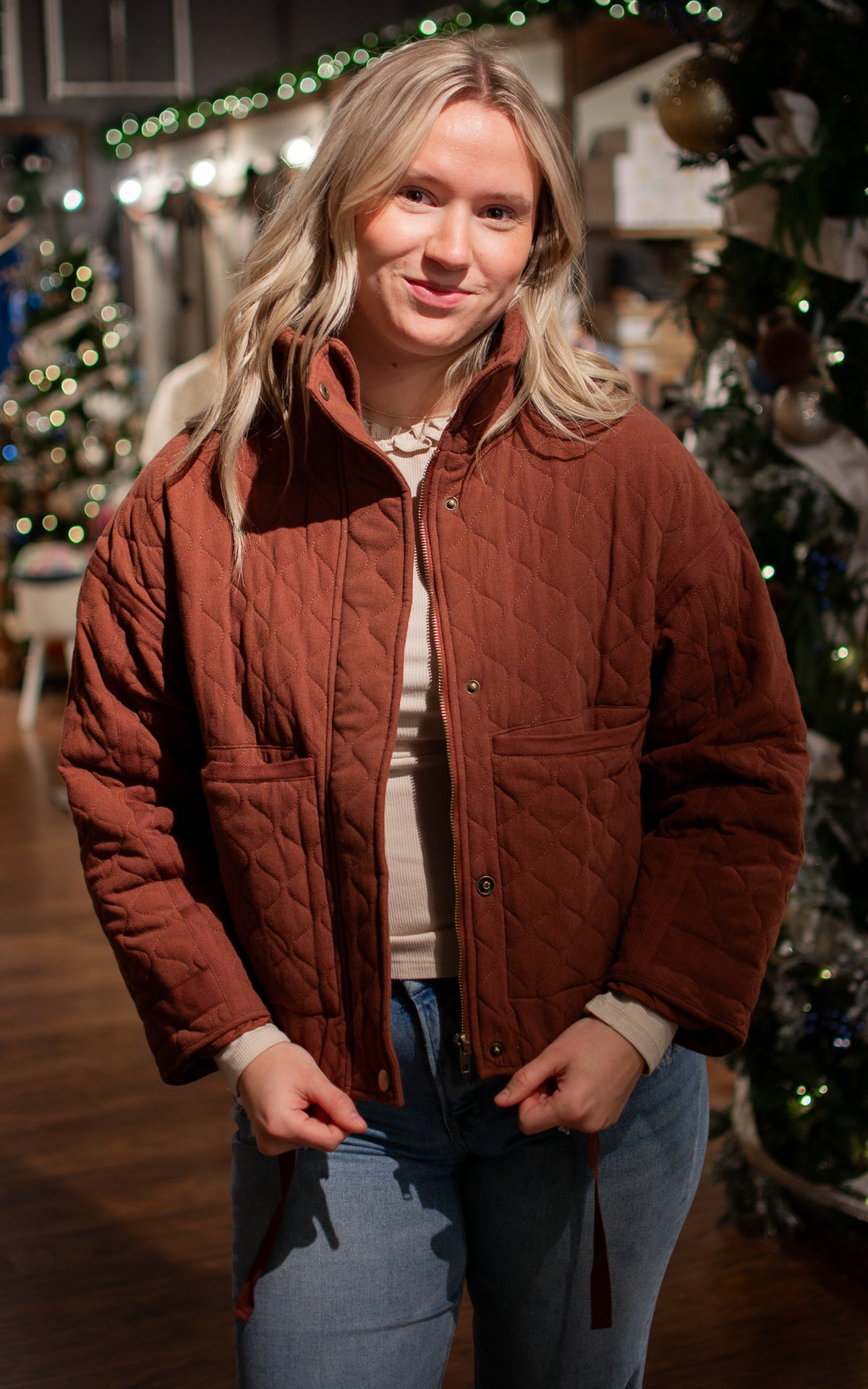 Stay warm in style with this quilted zip-up jacket in a gorgeous rust tone. The quilted texture adds dimension and visual interest while providing extra insulation for those chilly days. The convenient zip closure makes layering a breeze, and the warm rust hue pairs beautifully with neutrals and jewel tones alike. Your new go-to for effortless, cozy cool.