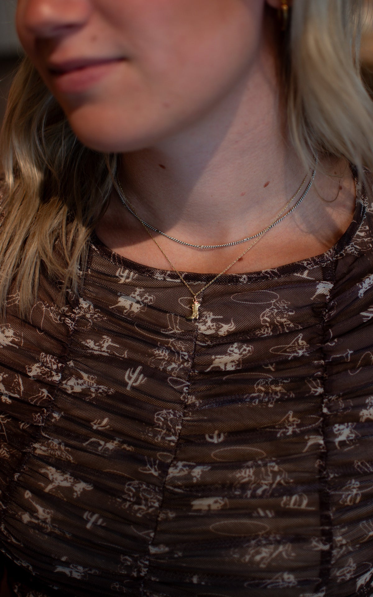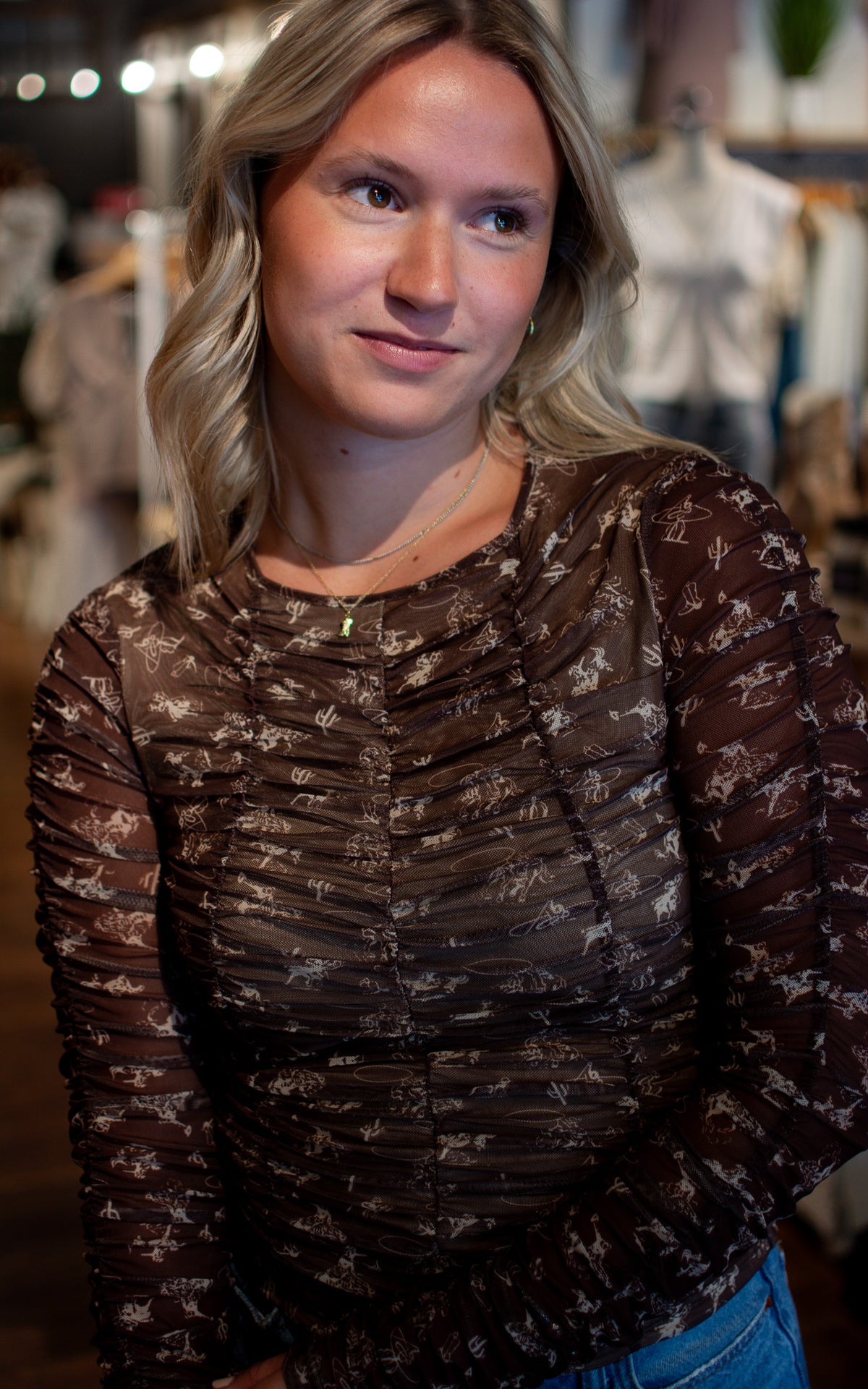The Yee Haw Ruched Western Top brings rodeo vibes to life with its playful cowgirl print on a breezy mesh fabric. The ruched details add a flirty touch, making it the perfect fun statement piece for your next western-inspired adventure.