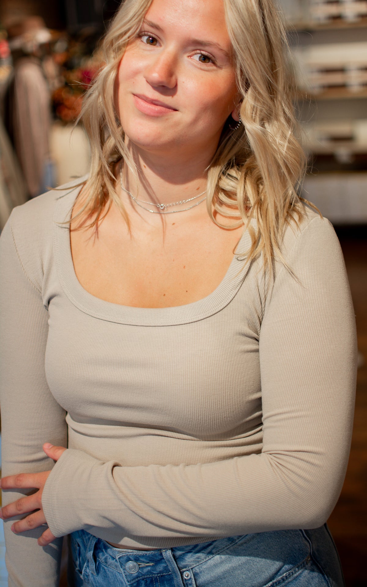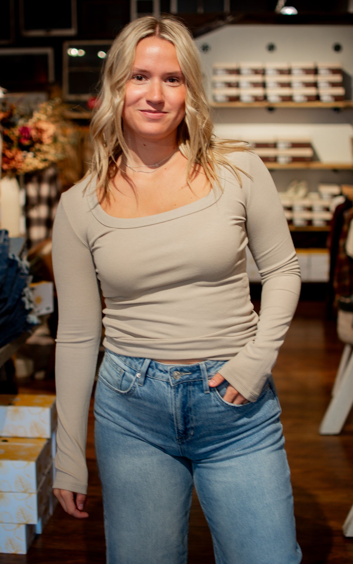 Meet your new go-to: the Kinsley Long Sleeve Top. This playful ribbed favorite in brown or oatmeal hugs just right with a scoop neck, making it the must-have basic that adds a cozy, stylish twist to any outfit.