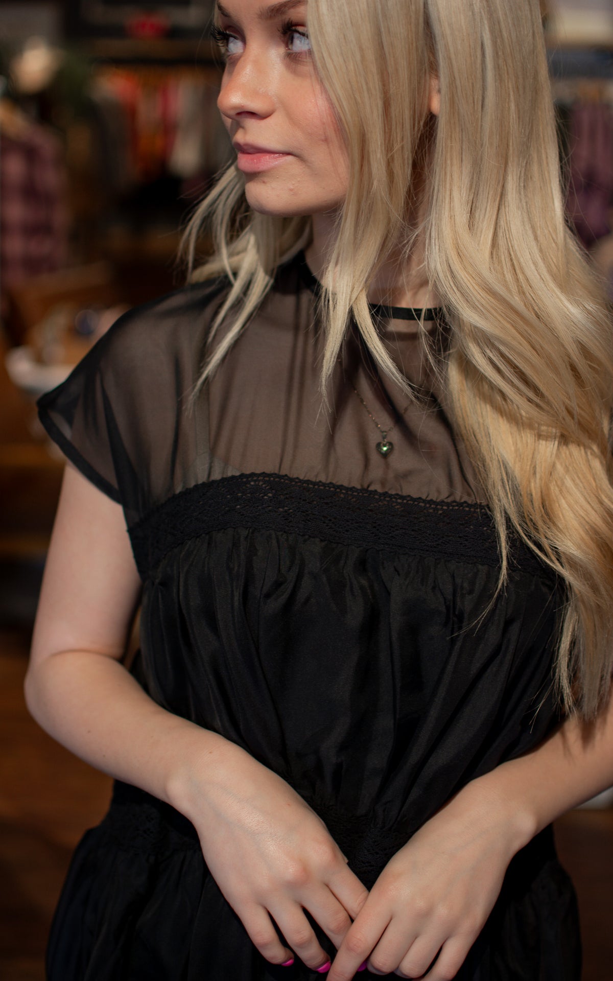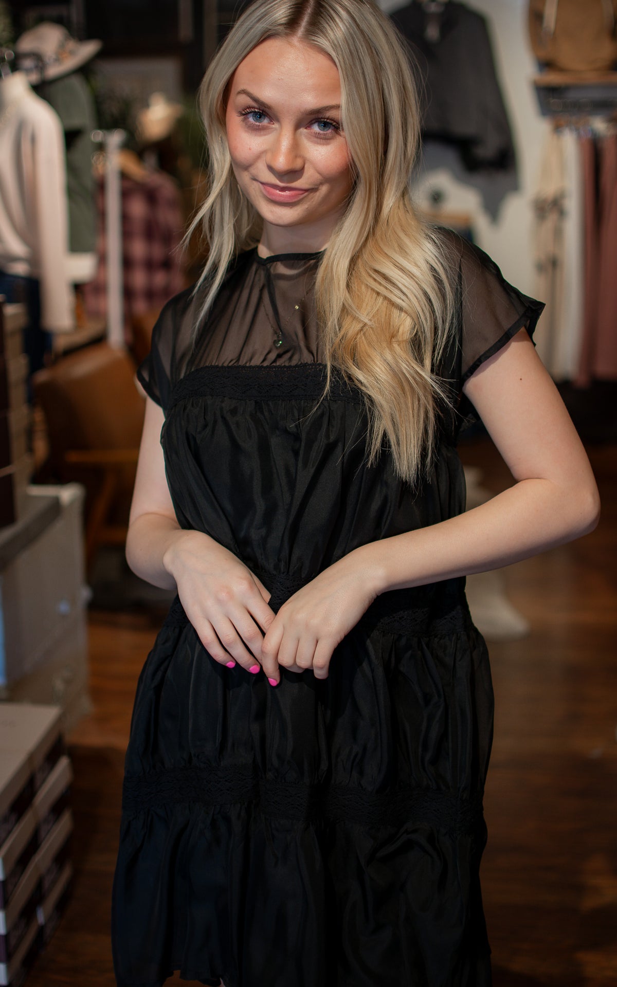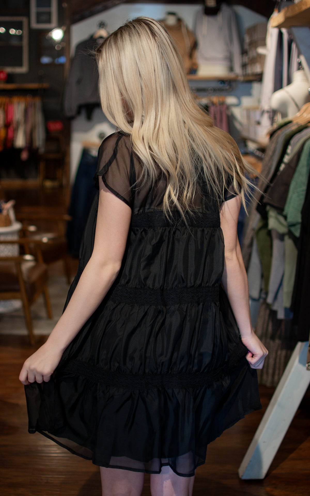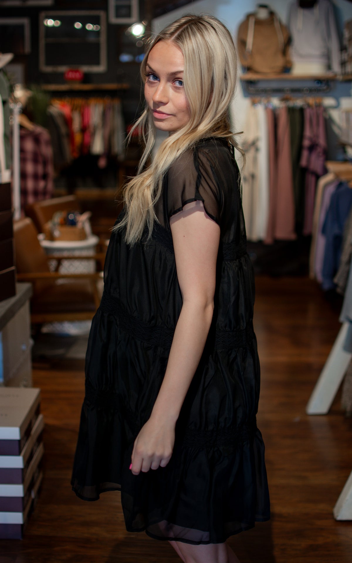 Channel 90's vibes with this Sophisticated Silhouette Dress. Sheer organza shoulders and flirty gathered tiers add a playful touch, while its fully lined and boxy silhouette ensures comfort. The perfect mix of sophistication and fun.