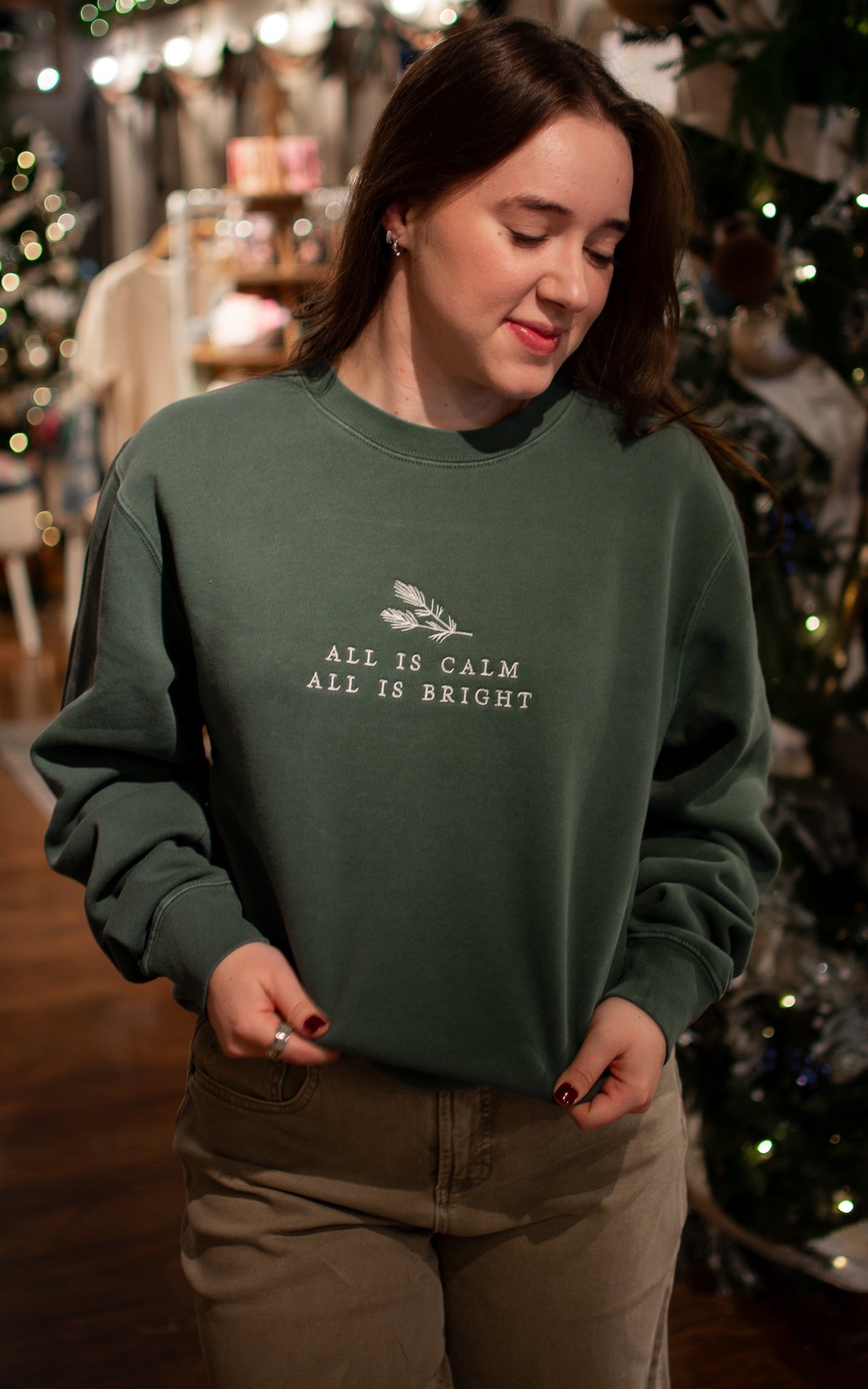 This personal favorite combines a serene jade green hue with a timeless embroidered quote that speaks to the heart of the season. The unisex fit ensures everyone can embrace the calm and comfort this crew delivers. A thoughtful piece that feels both meaningful and effortlessly wearable—perfect for those seeking a little peace wrapped in style.
