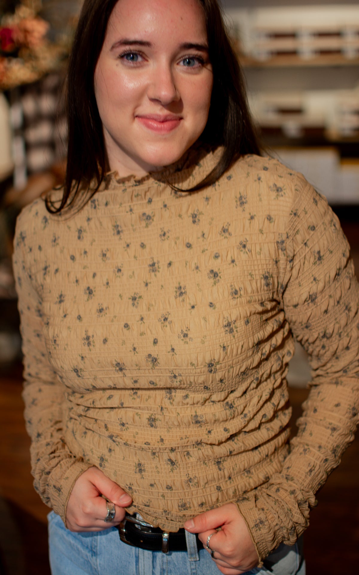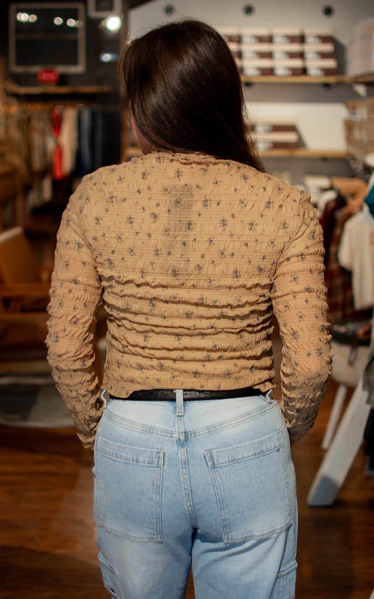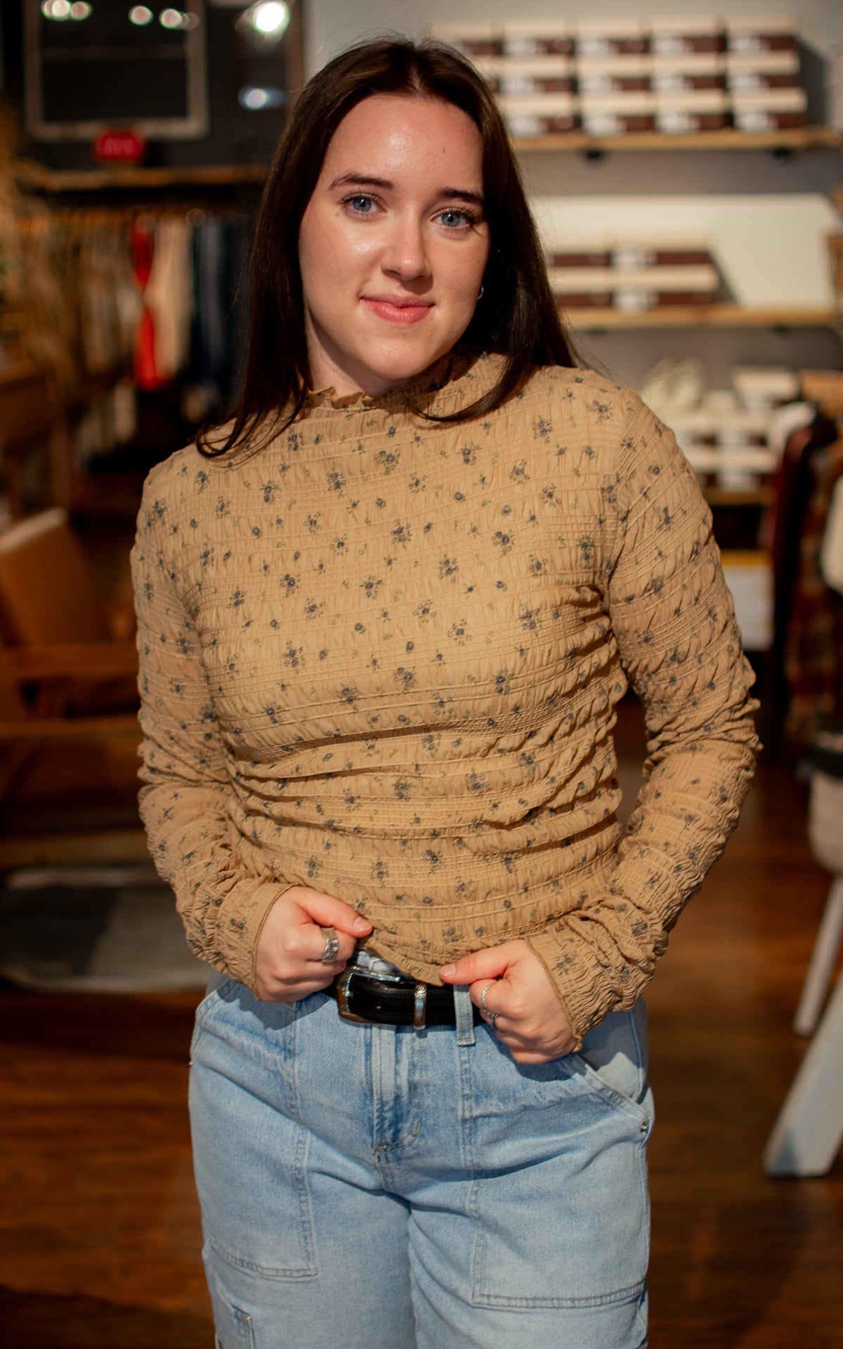 Add a playful touch to your wardrobe with the Boone Brown Mesh Top. This tan mesh top features a delicate floral pattern, a chic mock neck, and a flirty lettuce hem for effortless style with a fun twist.
