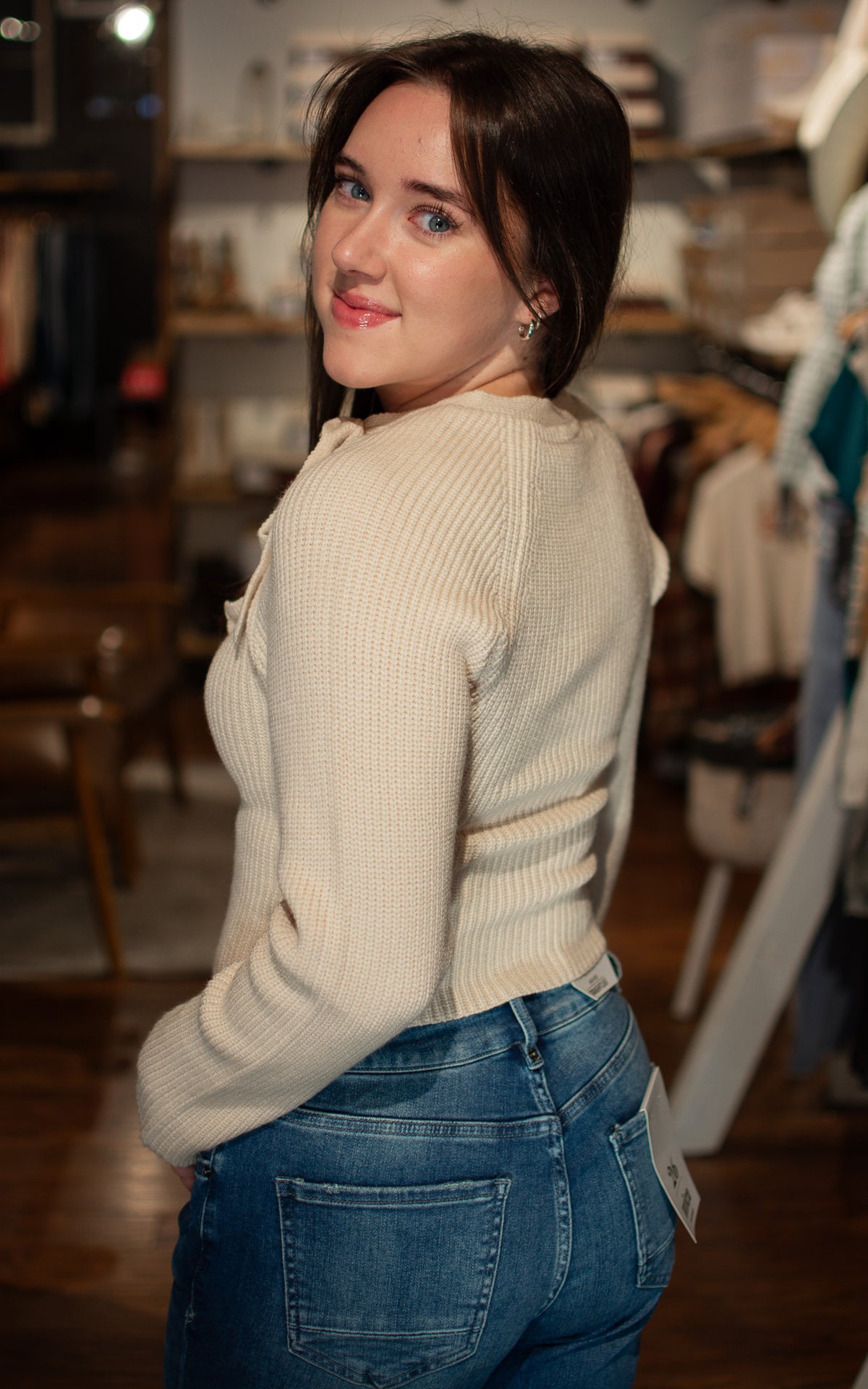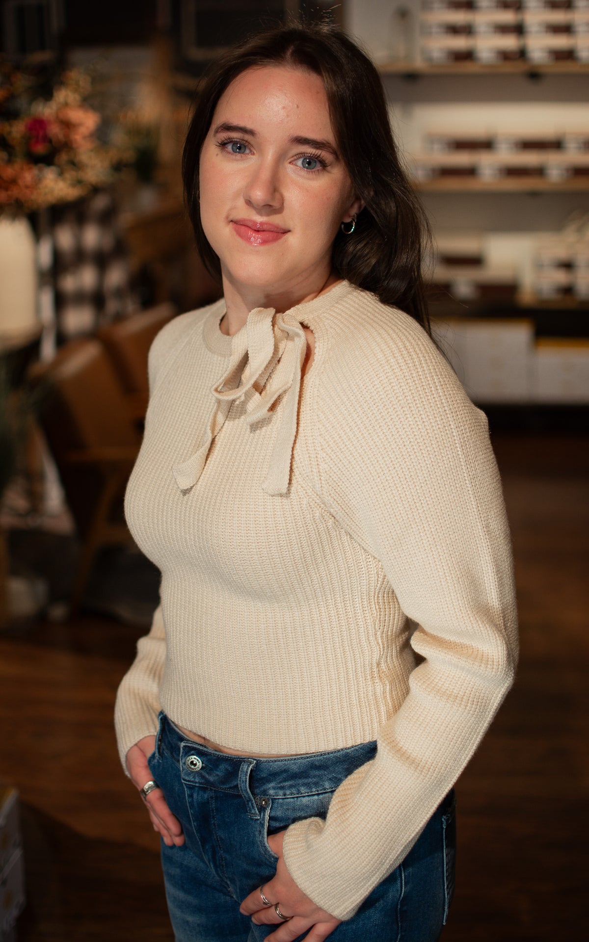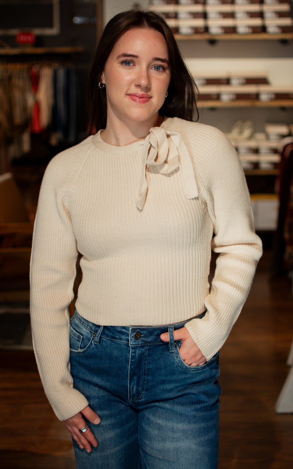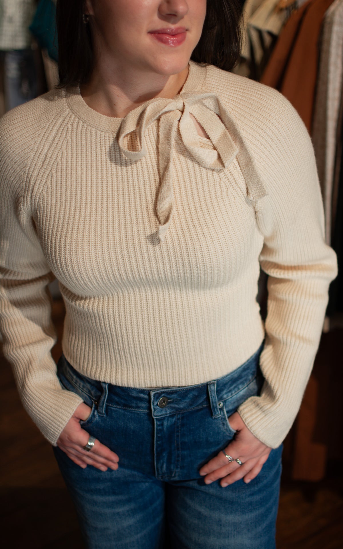 Elevate your date night look with the Bow Babe Sweater Top. This cream sweater features a playful bow at the neck, adding a chic and flirty touch that's perfect for turning heads and stealing hearts.