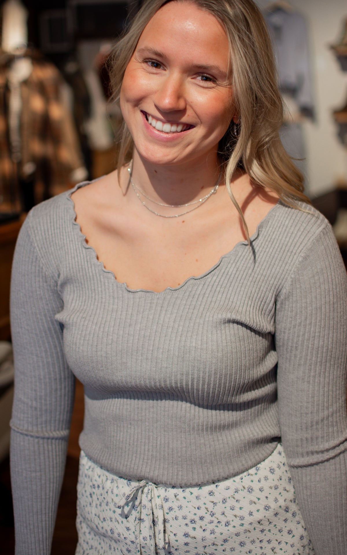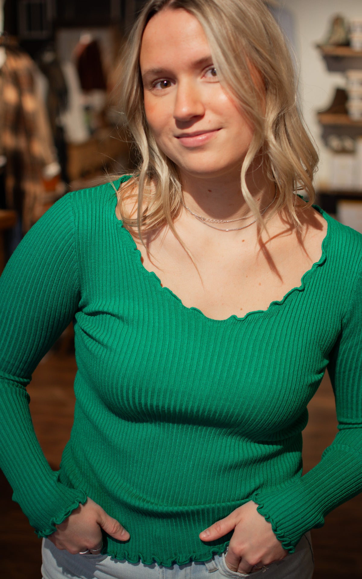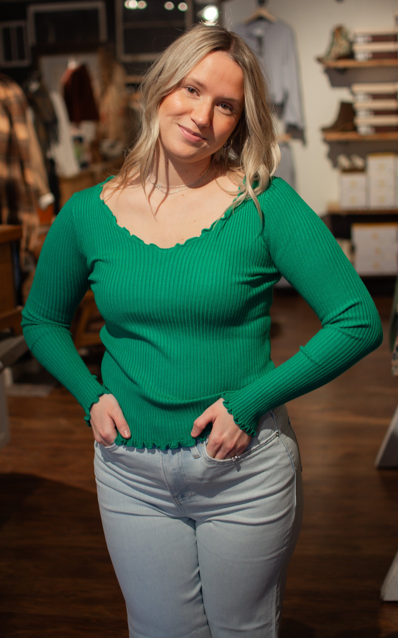 Brunch Babe Ribbed Long Sleeve Go for the gusto in kelly green or keep it cool in light grey with this ribbed long sleeve that's all about the details. Delicate lettuce edging at the neckline and hem adds a playful feminine touch that elevates this everyday piece. Fitted, flattering, and ready to be your new go-to for brunch dates and beyond.
