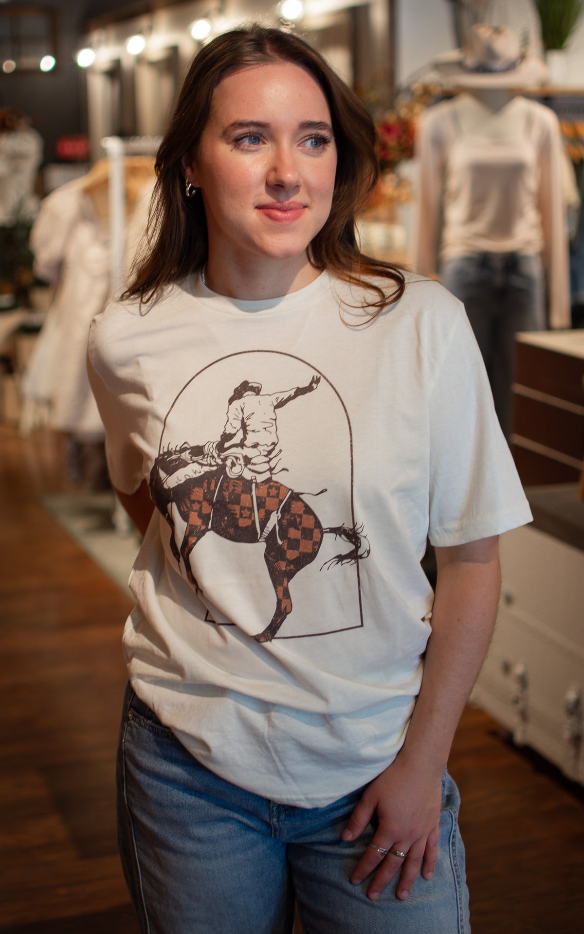 Get rodeo ready with the Checkered Cowboy Graphic Tee! This lightweight tee features a boxy, slightly oversized fit for all-day comfort and a playful, bold graphic that adds a fun western vibe to your look. Perfect for riding into summer with style!