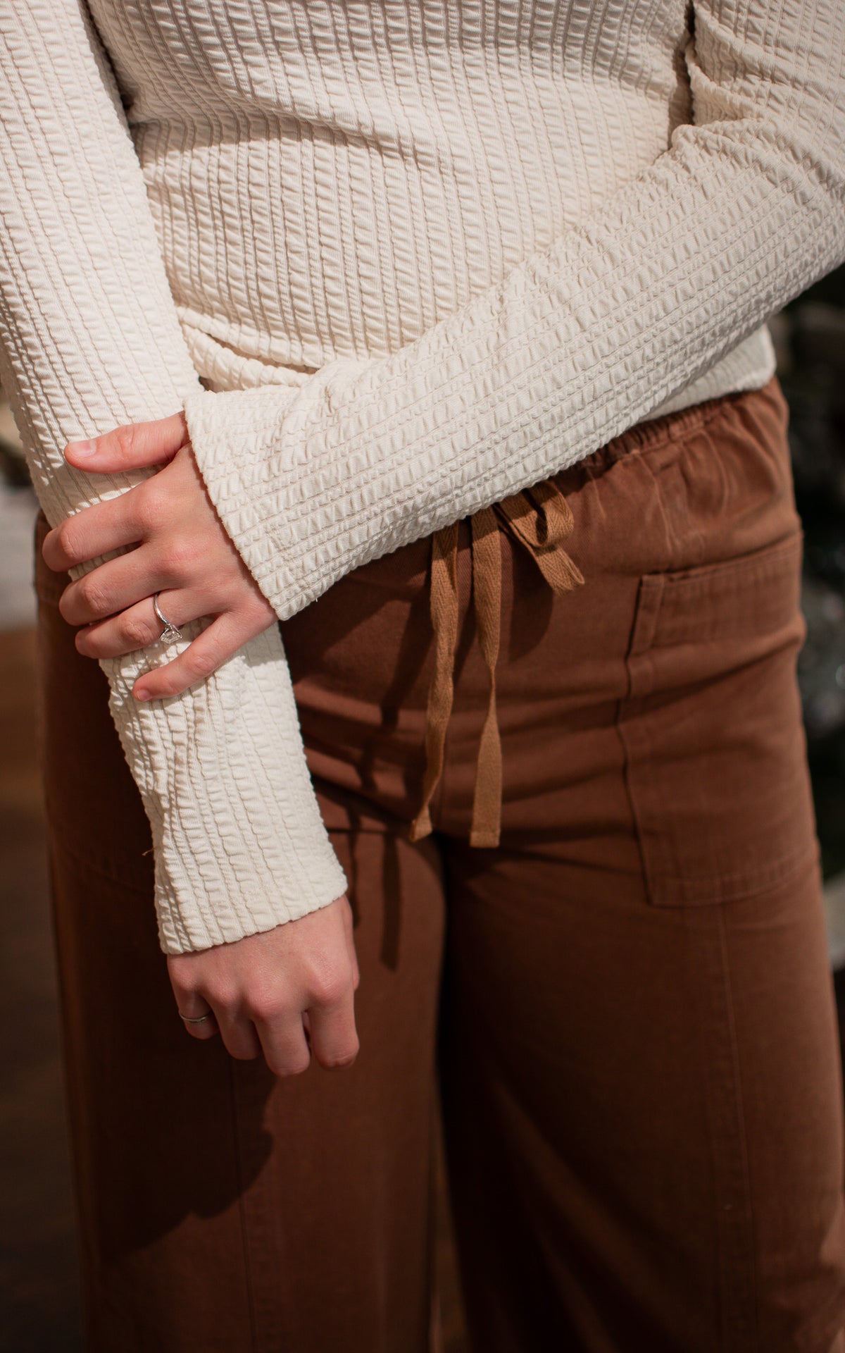 The Cinch and Pinch Top is your new wardrobe MVP—a cream-colored essential that's anything but boring. With its subtle texture and thoughtful construction, this piece begs to be layered and styled in endless ways. Whether you're pairing it with your favorite jacket or letting it shine solo, it's the elevated basic that actually feels special. Versatile, timeless, and ready for whatever you throw at it.