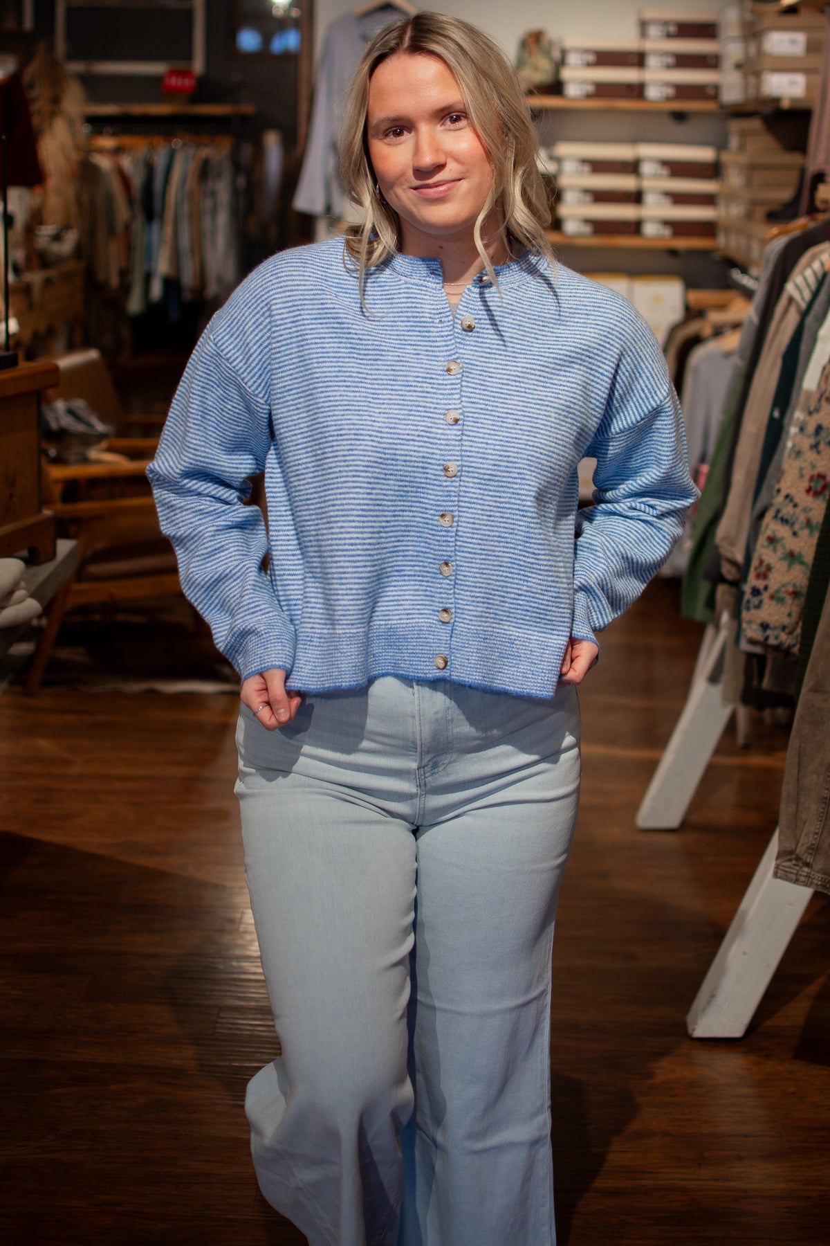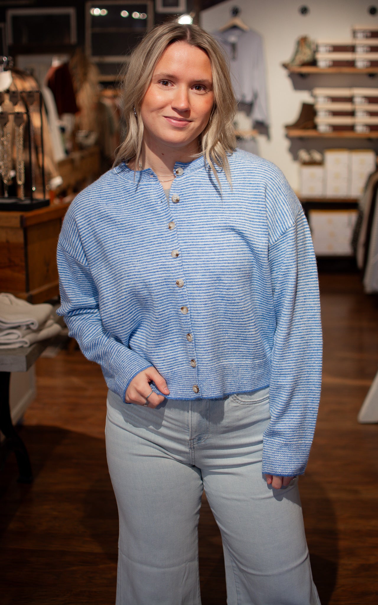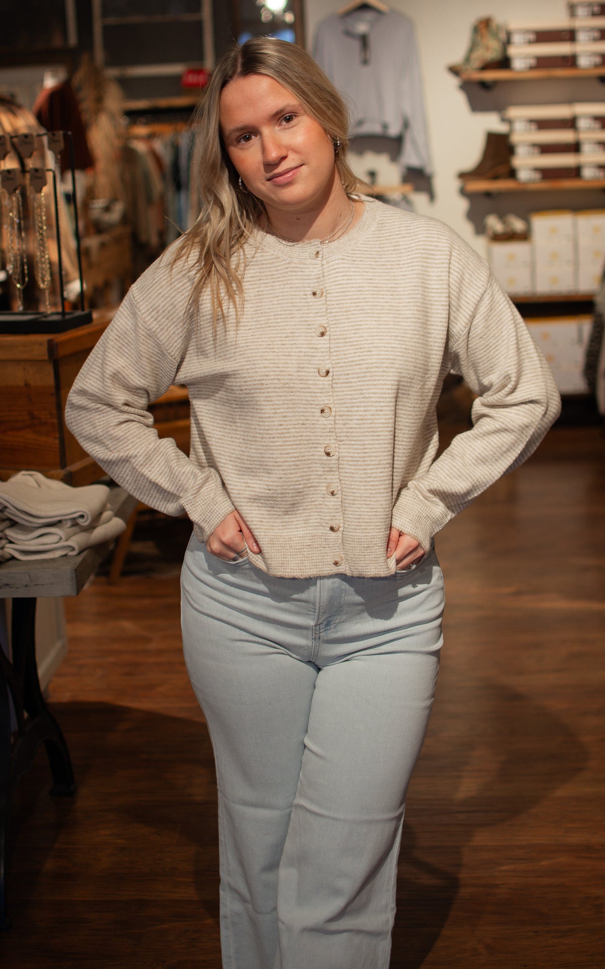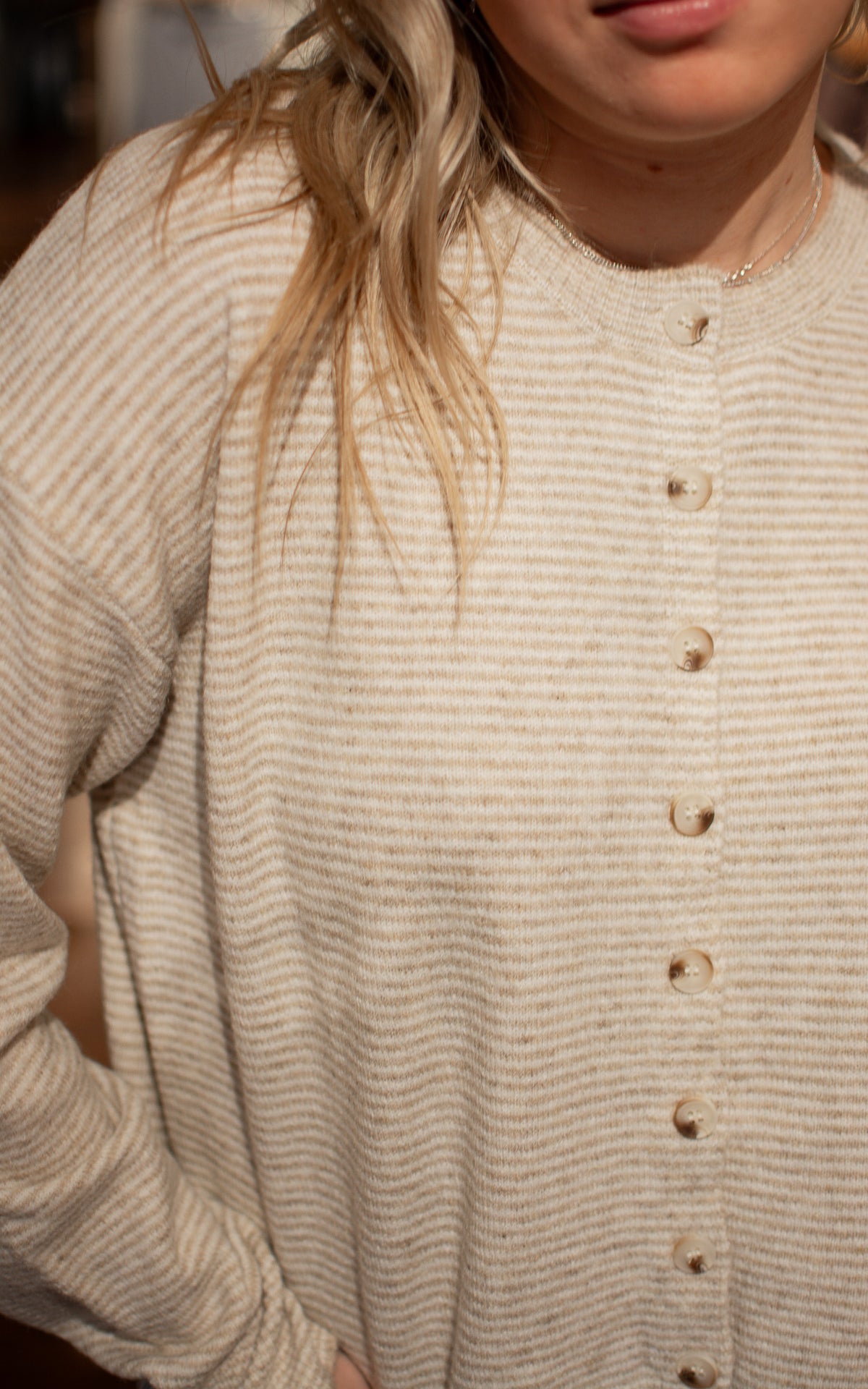 Coastal Cutie Striped Cardigan Throw on this breezy striped cardigan in light blue or taupe and instantly elevate your look. Lightweight and perfectly proportioned, it layers beautifully over everything from tanks to dresses without adding bulk. Whether you're heading to the beach or just need an easy layer for unpredictable weather, this charming piece has you covered.