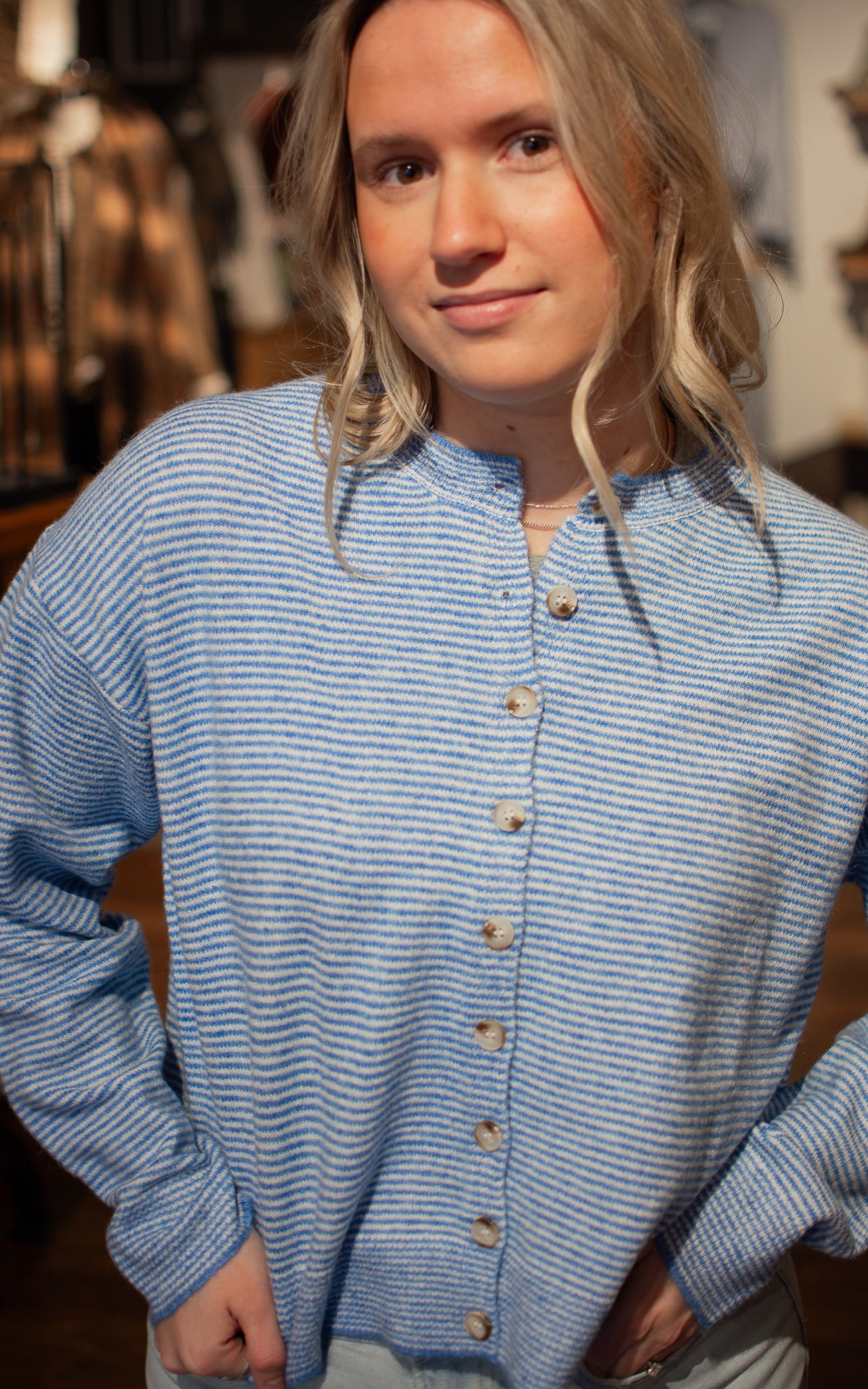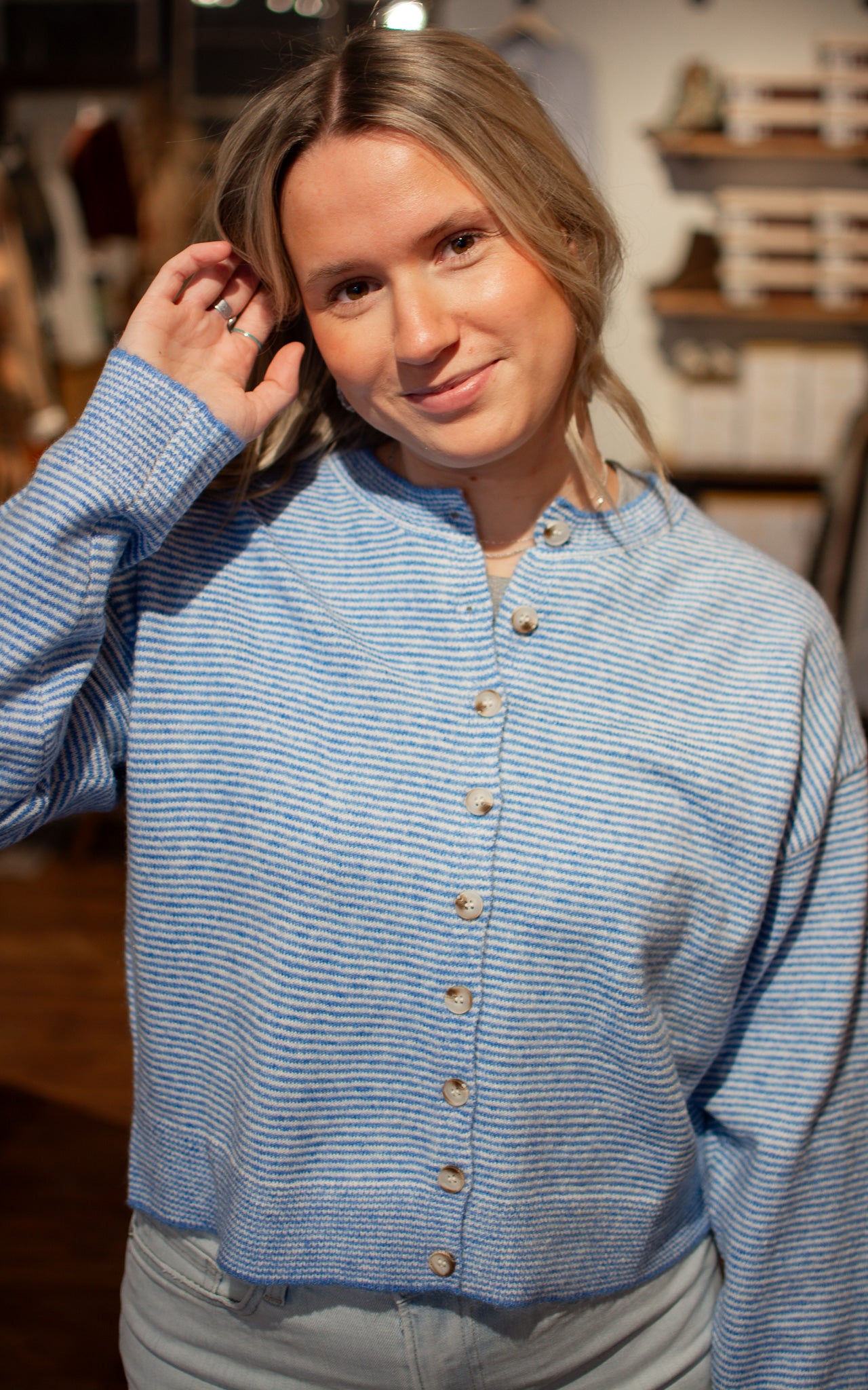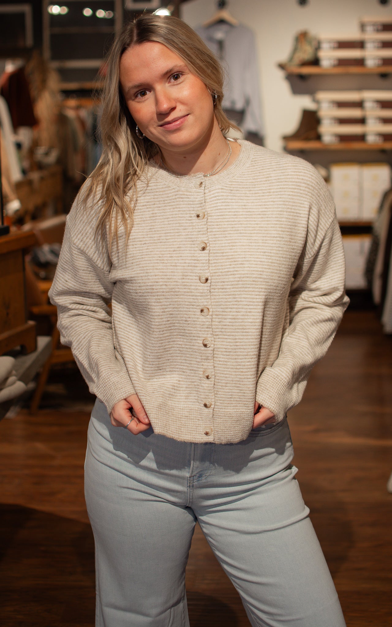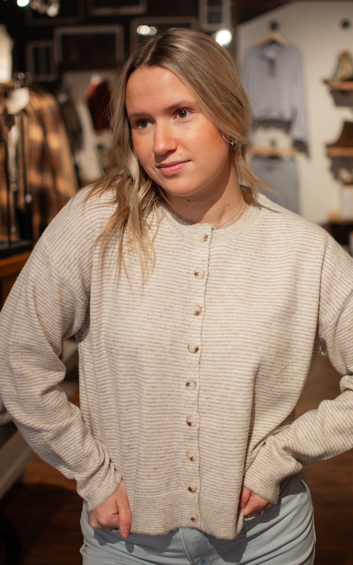 Coastal Cutie Striped Cardigan Throw on this breezy striped cardigan in light blue or taupe and instantly elevate your look. Lightweight and perfectly proportioned, it layers beautifully over everything from tanks to dresses without adding bulk. Whether you're heading to the beach or just need an easy layer for unpredictable weather, this charming piece has you covered.