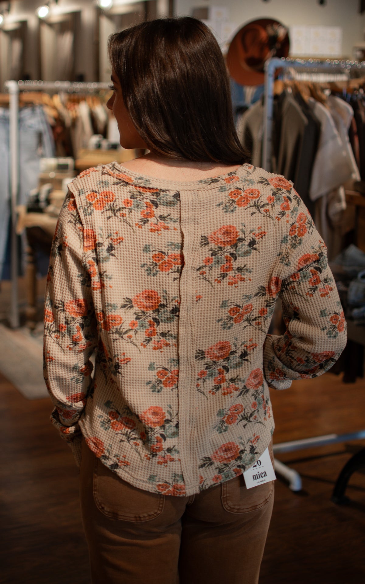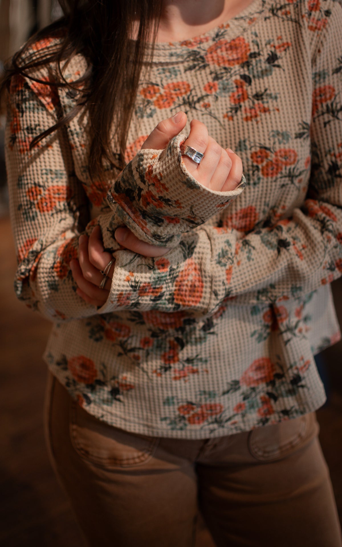 Stay cozy and cute in this beige waffle thermal top, adorned with charming pink and green floral prints. Designed with thumb holes for added comfort and warmth, it’s perfect for those crisp mornings when you want to feel like a true country girl with a playful twist.